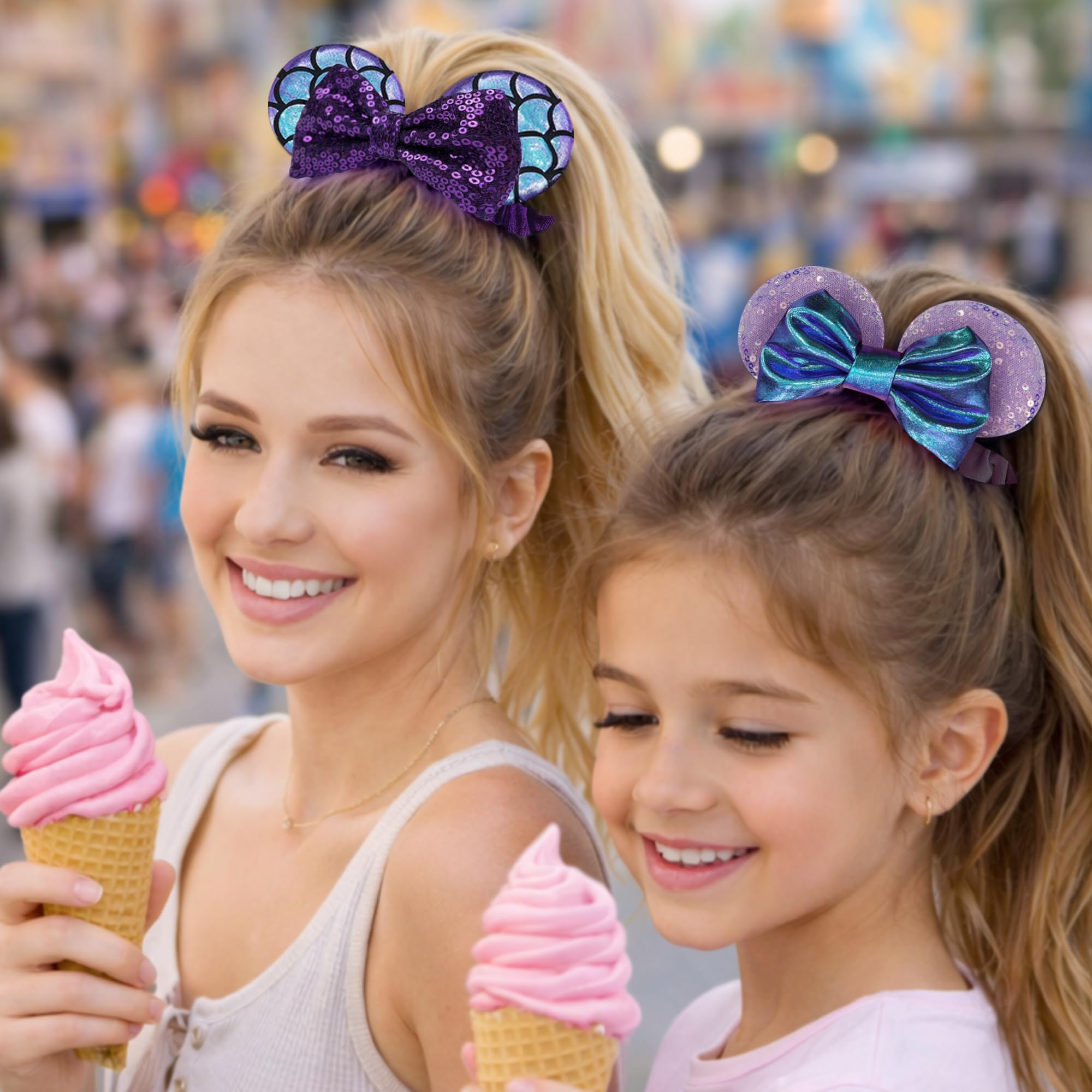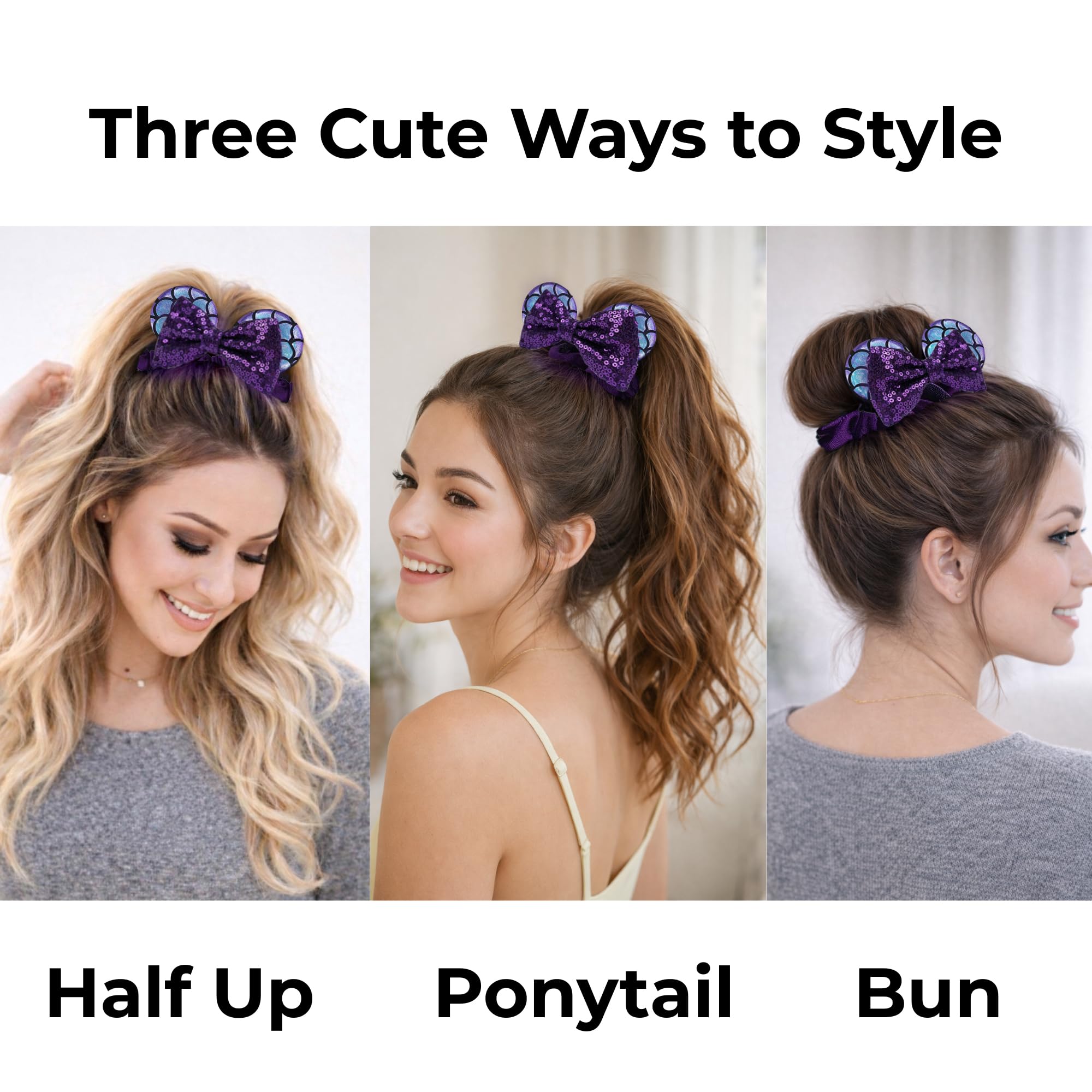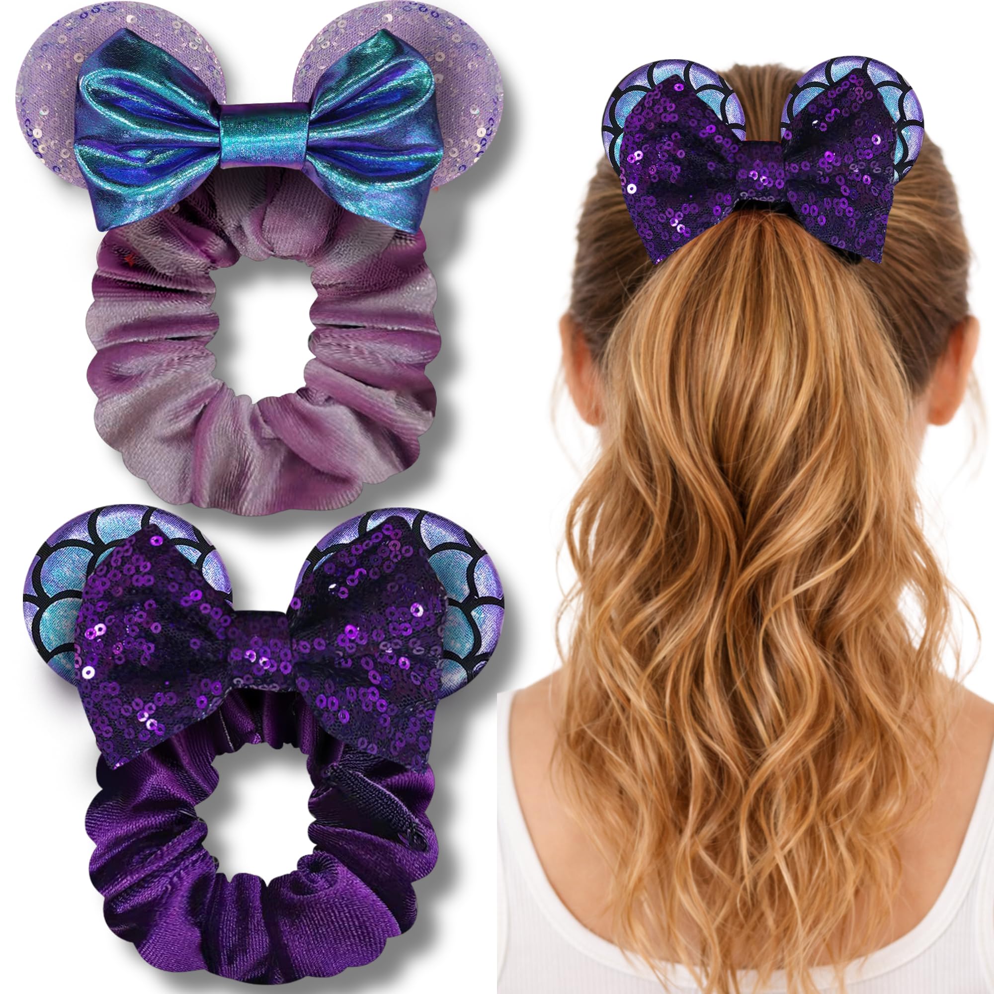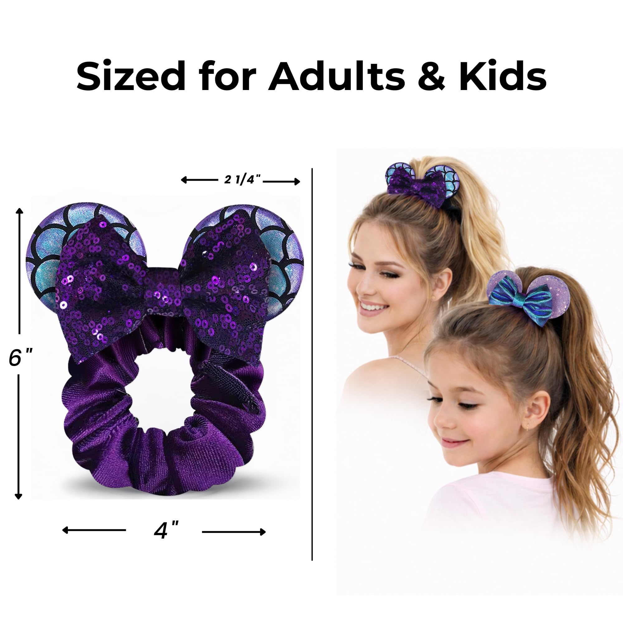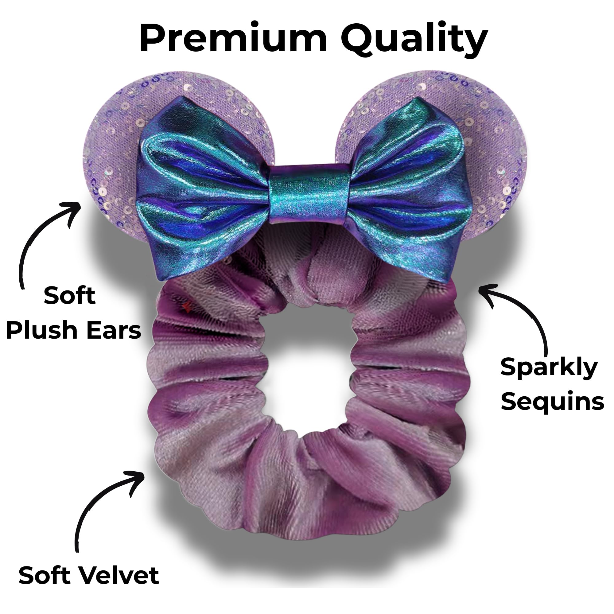 VALUE PACK: 2 mouse ears scrunchies in each pack with two colors to choose from. Bow scrunchies for hair in a soft plush black velvet fabric with mermaid color sequins glitter bows. Velvet scrunchies for women are great for all hair types.