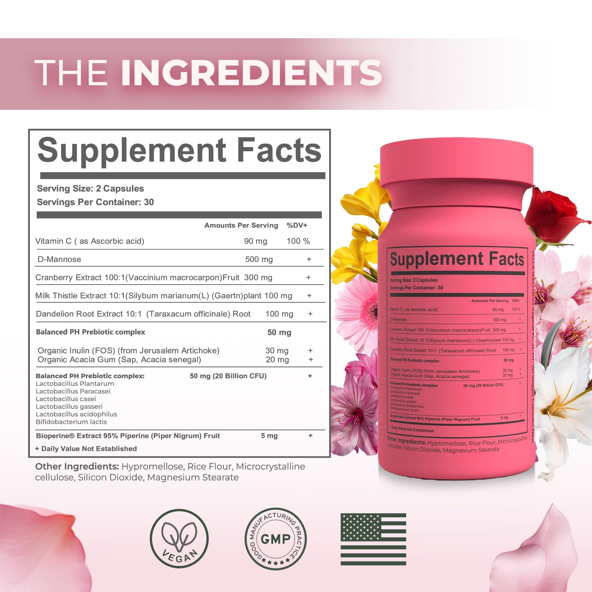 Promotes Urinary Tract Wellness- Featuring D-Mannose and Cranberry Extract, our women's probiotic helps prevent urinary tract issues, offering reliable support against infections and discomfort. Stay confident with a product designed to support your unique needs.