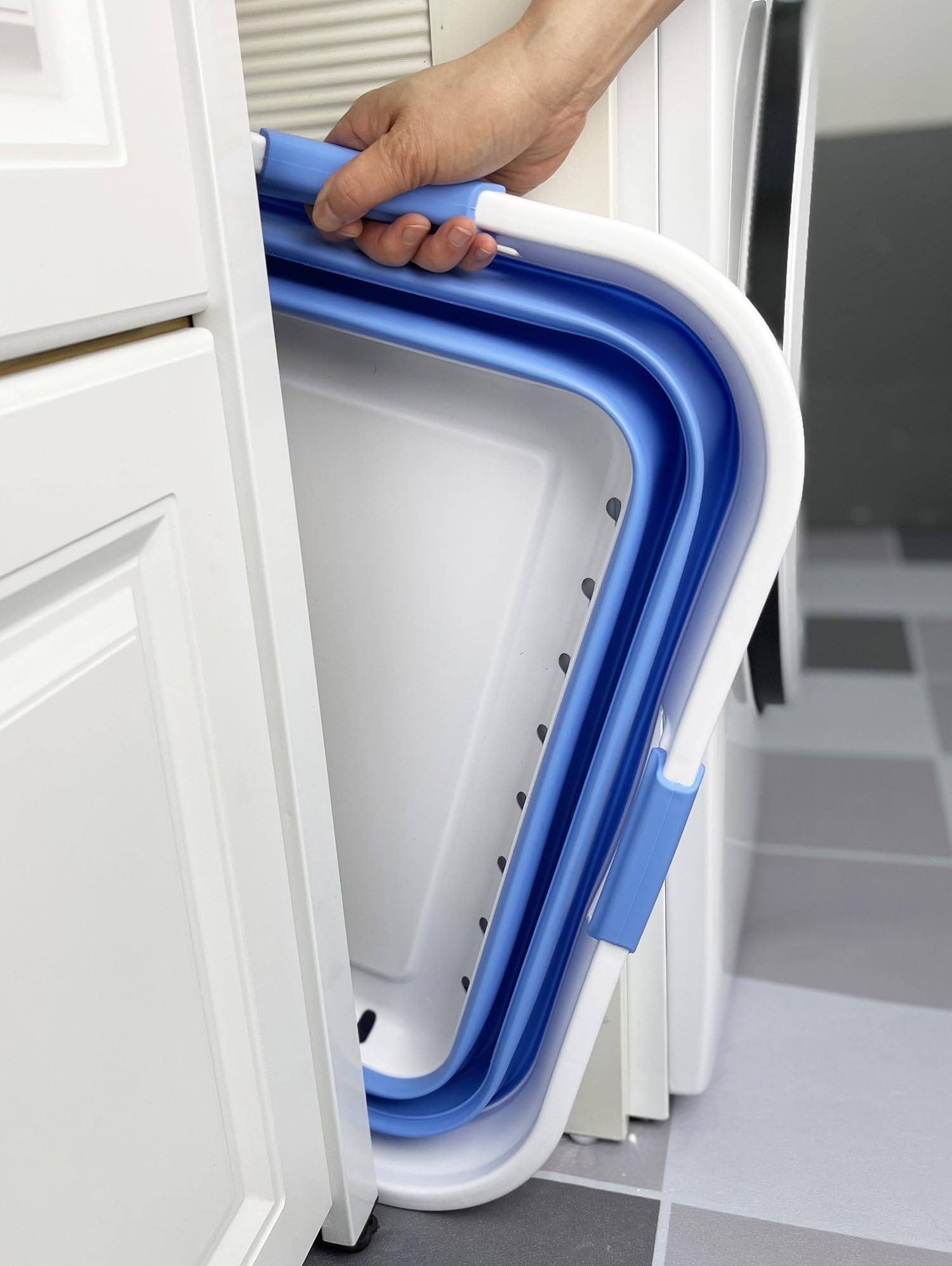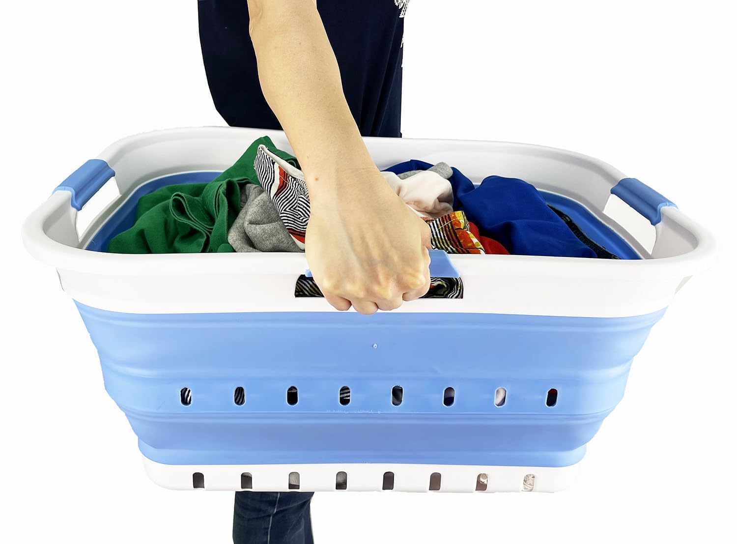 BPA Free. Comfort grip handles for easy carry. User friendly by simply pop-up to open when using and collapses to flat for space saving