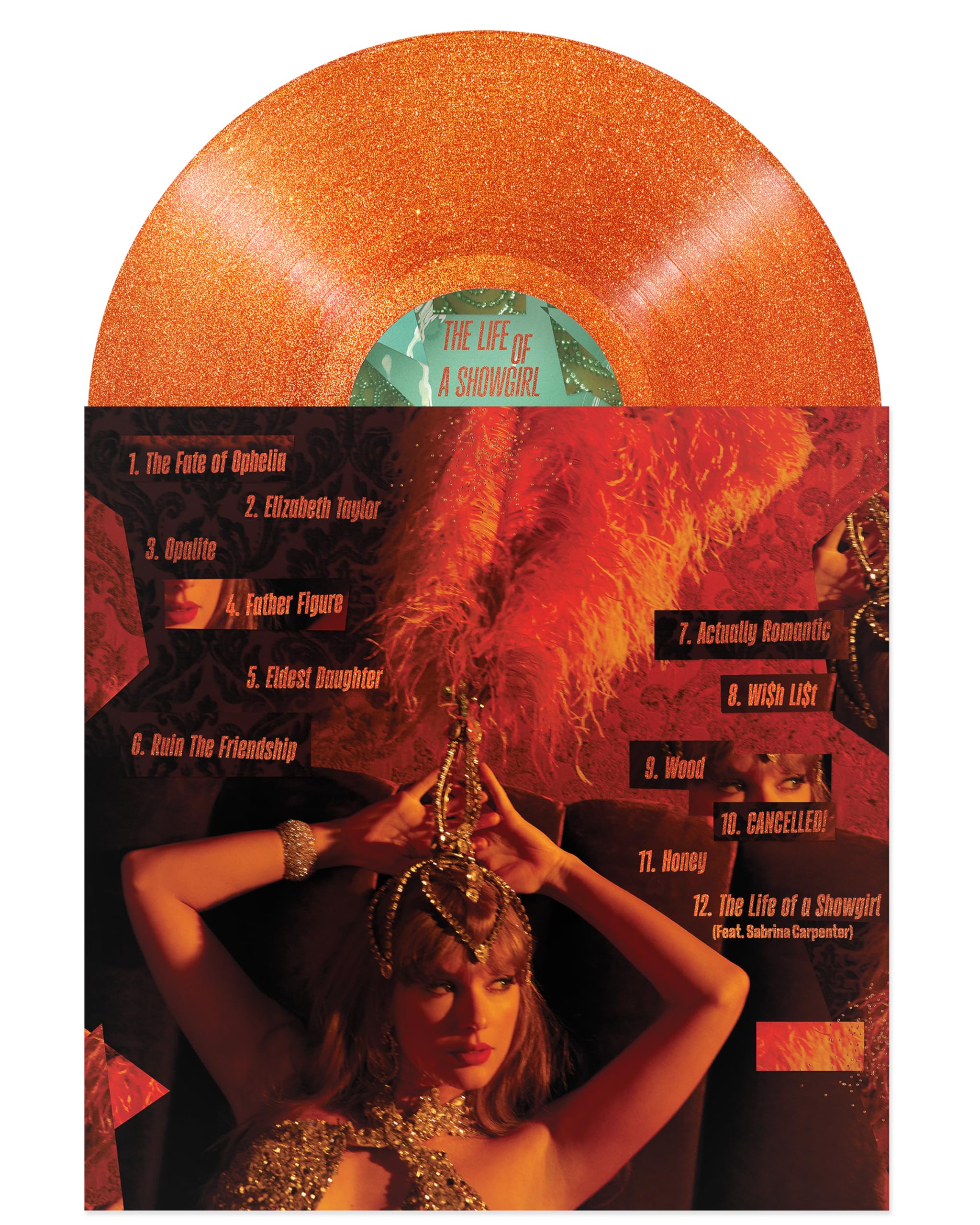 Taylor Swift's 12th studio album, The Life of a Showgirl, will be released worldwide October 3, 2025. The LP includes 12 songs, Portofino Orange Glitter Vinyl, Double gatefold jacket, unique front and back cover, and never-before-seen photos and album lyrics.