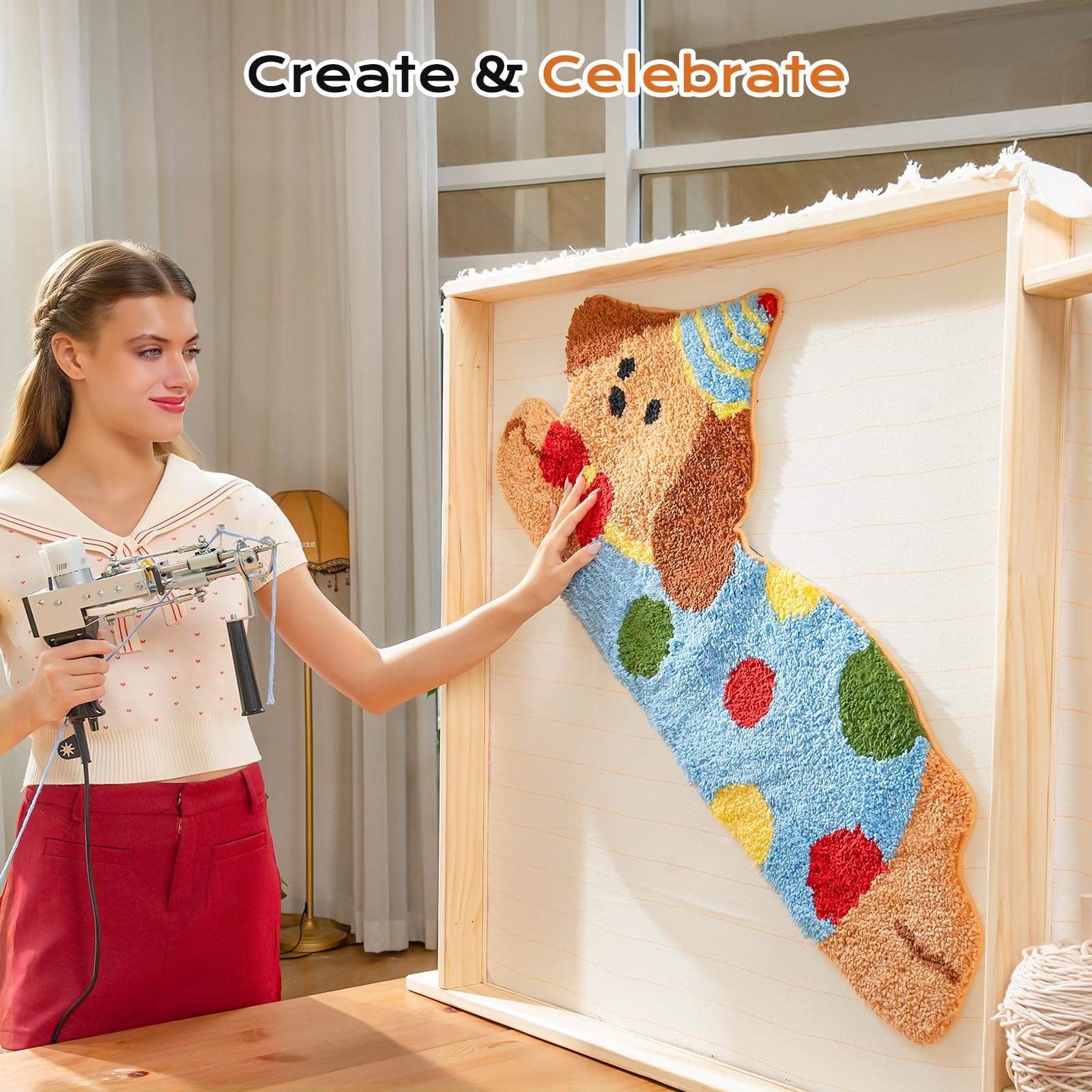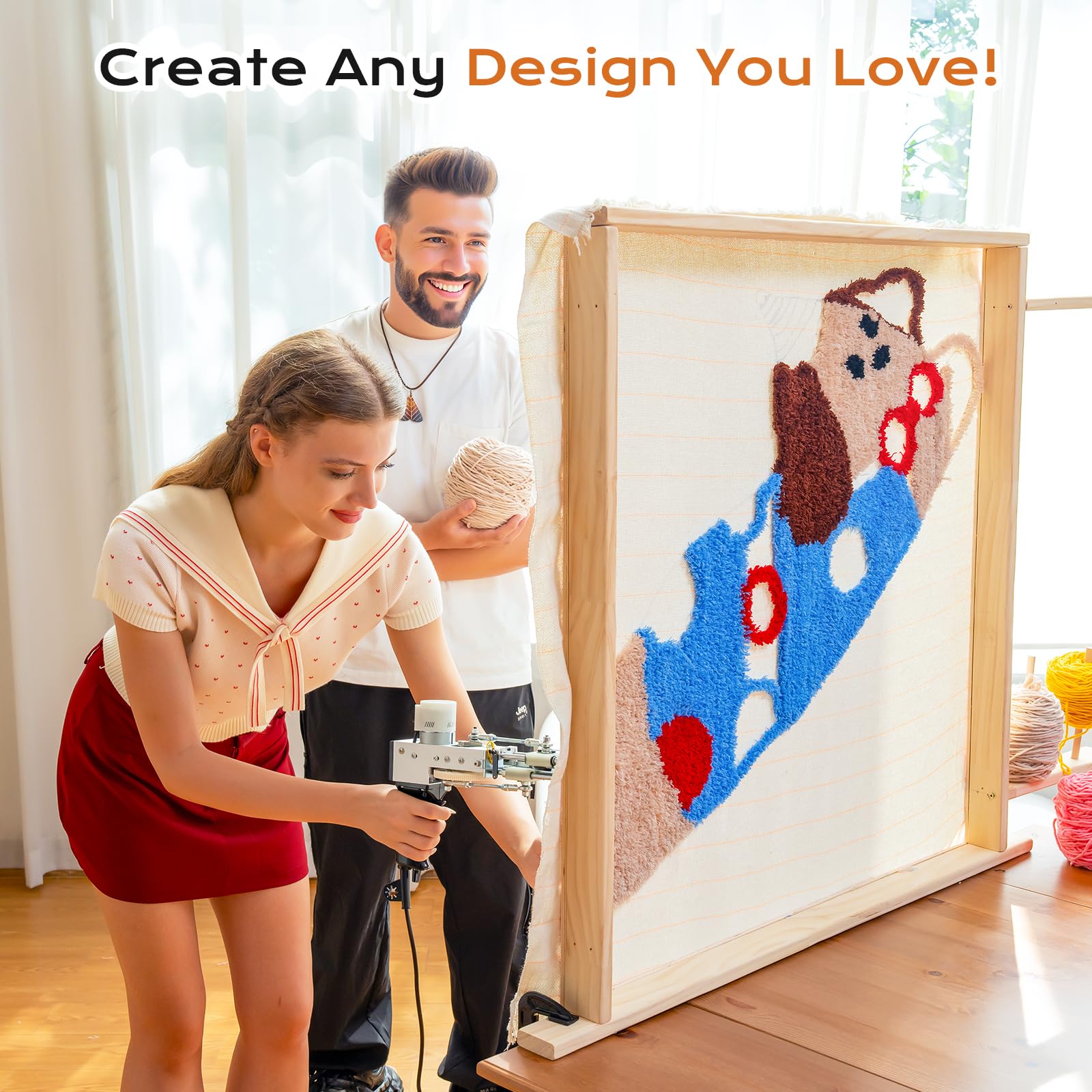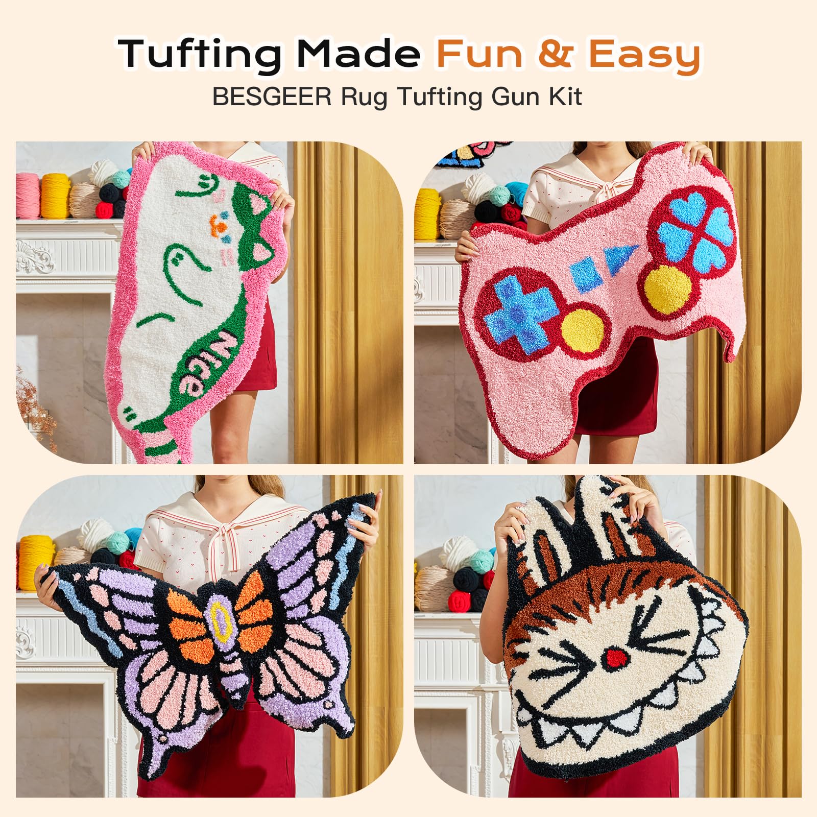 Tufting Gun and Trimmer Kit: BESGEER tufting gun kit includes a tufting gun, a carpet trimmer Kit, 20 rolls of yarn, a 39"X39" tufting cloth, a 39"X35" non-slip final backing cloth, and a box. the rug gun can DIY any patterns you like, and the rug trimmer can trim extra for letters, rounded corners, and edges details. Ideal for small to medium-sized rugs. This is the most complete tufting kit for beginners on the market. You only need to match a tufting frame to start your DIY work