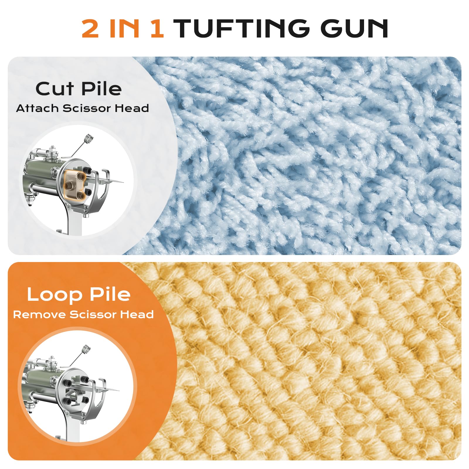 Cut and Loop Pile 2-in-1 Rug Tufting Gun: The rug tufting kit can manually switch between cut pile and loop pile with the scissors changed. The pile height can be adjusted between 7-21mm(Cut Pile). The tufting gun starter kit defaults with cut pile mode;(It is recommended to use thicker 8 strands of yarn)