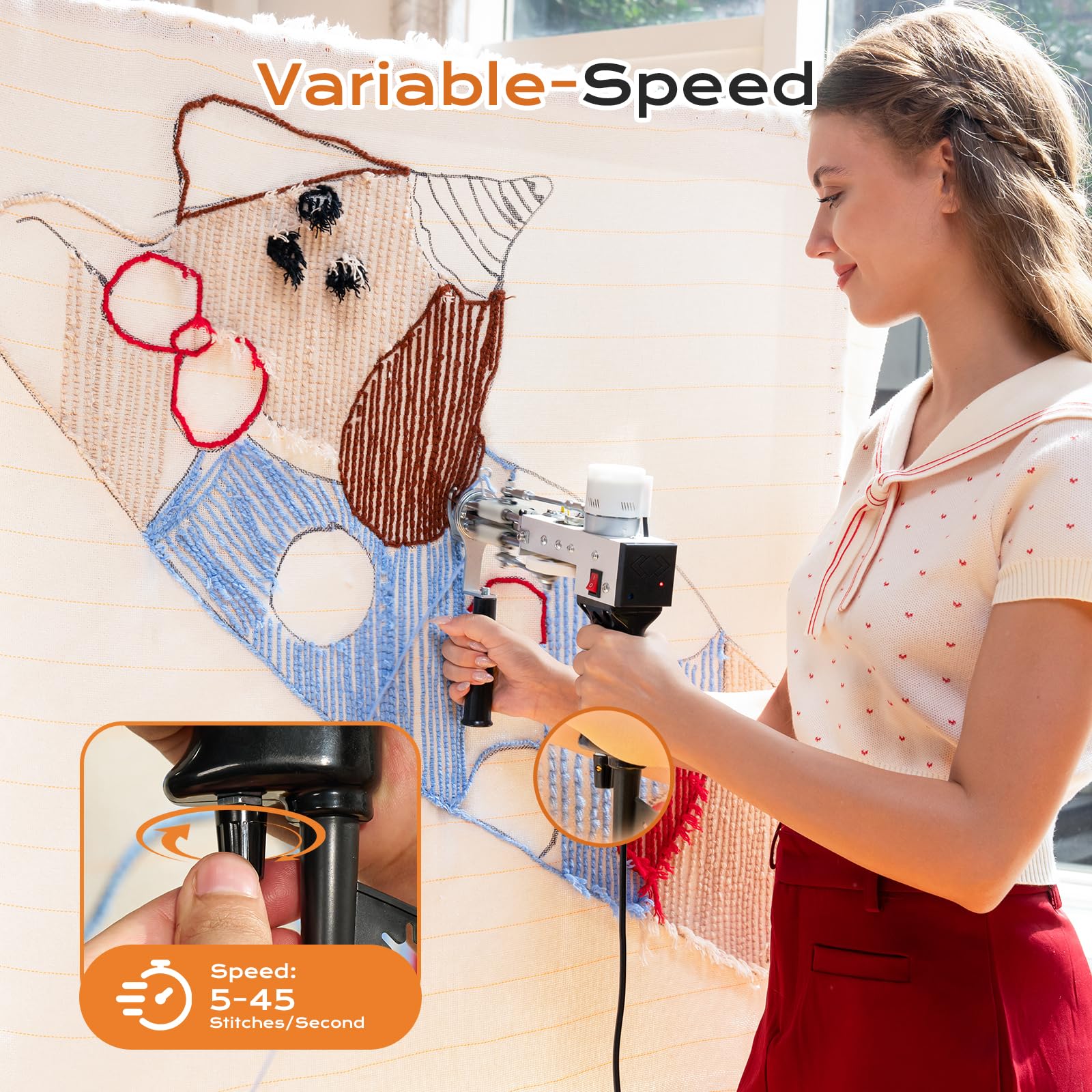 Efficient Working: The rug maker machine starter kit uses a high-power power supply, and the power is more powerful. This carpet-making kit can reach a speed of 5-40 stitches/s, and a No-Load speed of 10000r/min, which makes the production efficiency 80-100 times higher than traditional manual creation;(Tips: Be sure to pull the tufting cloth tightly during the tufting)