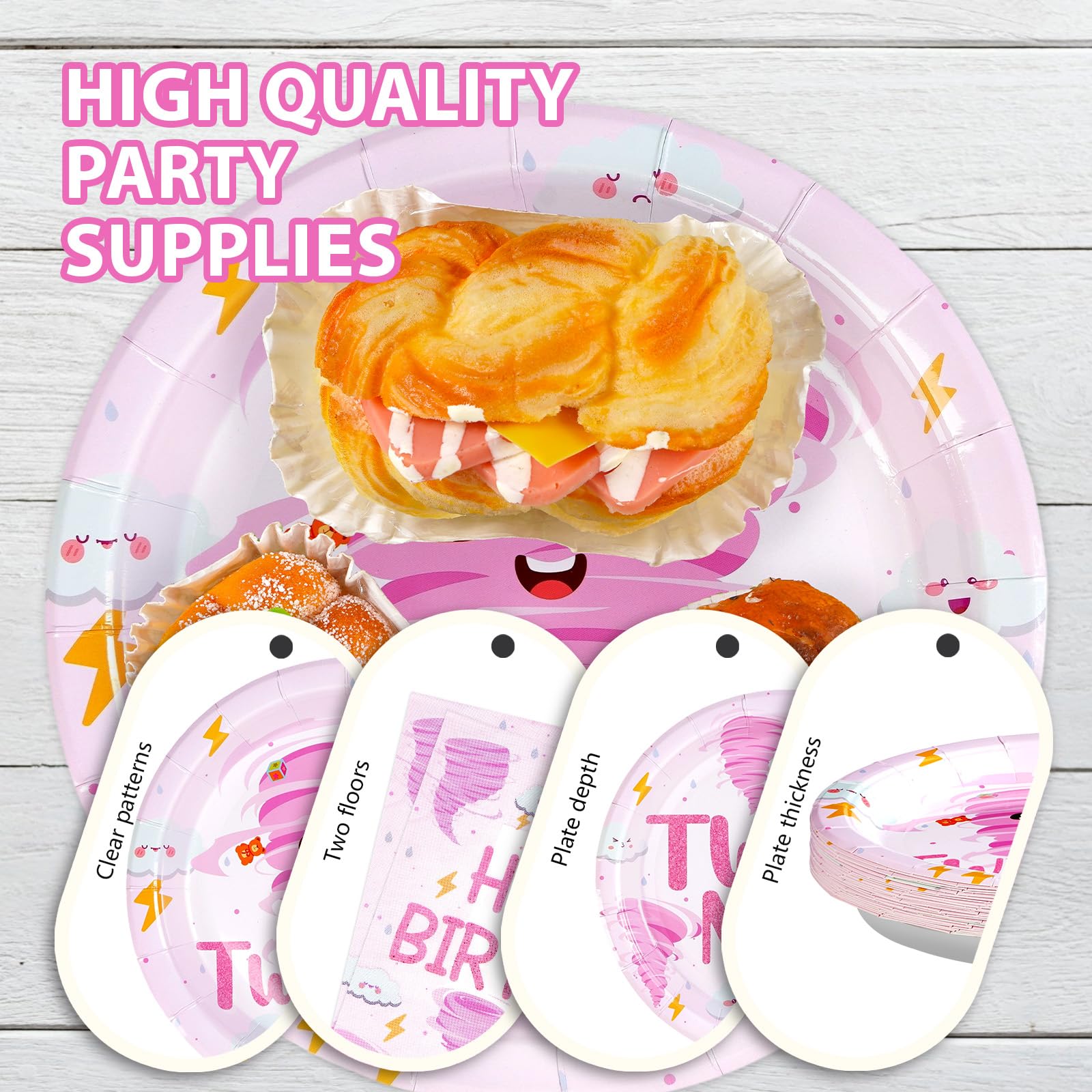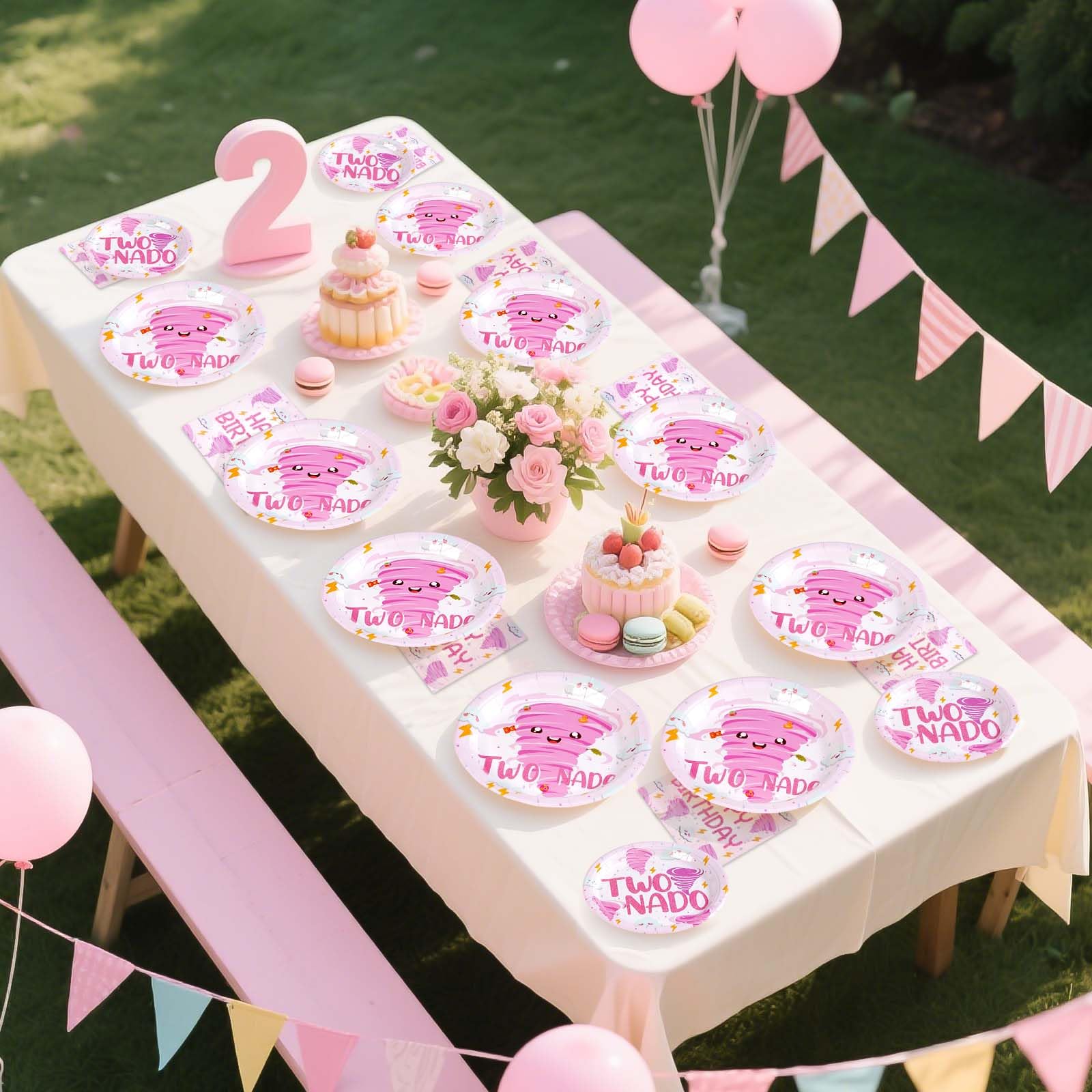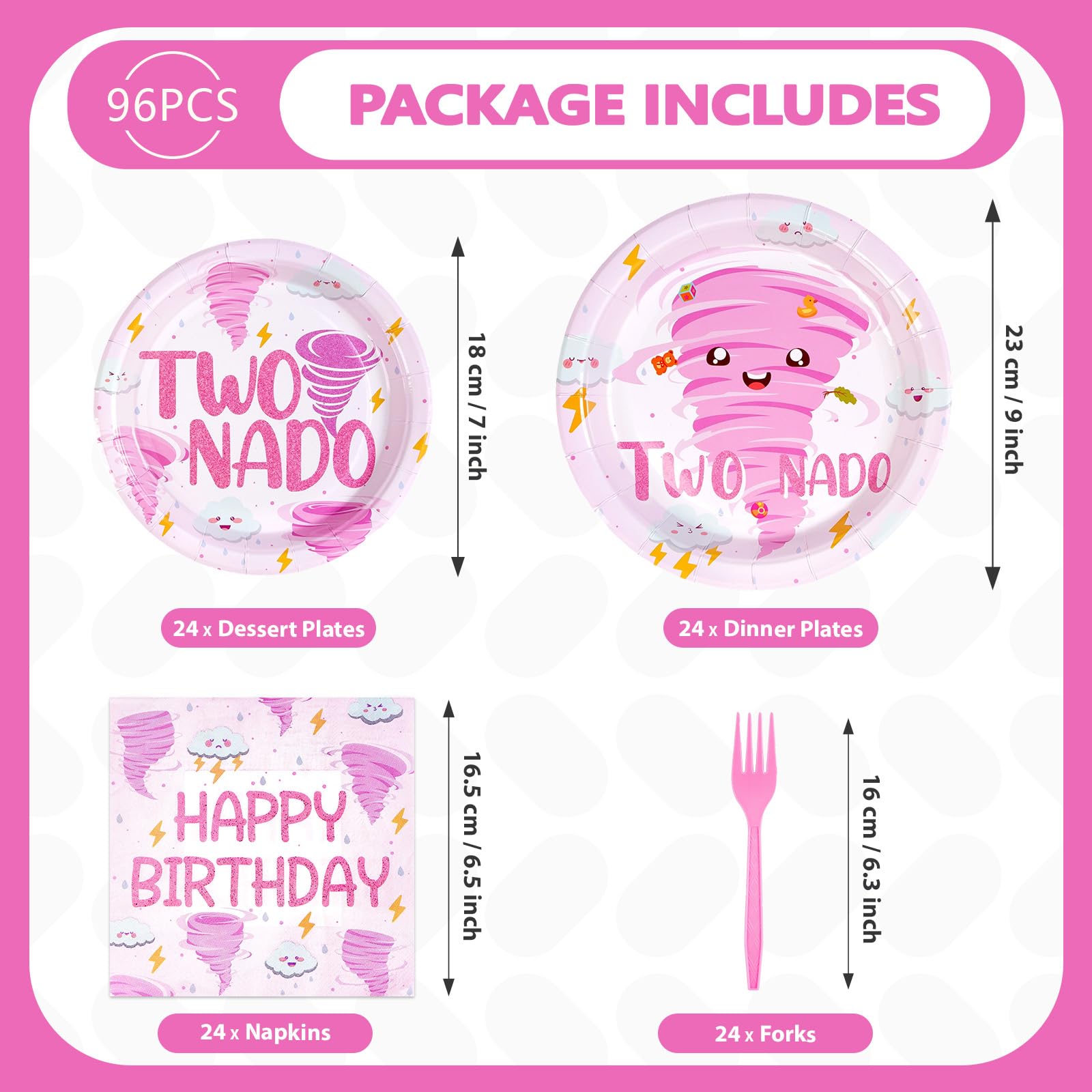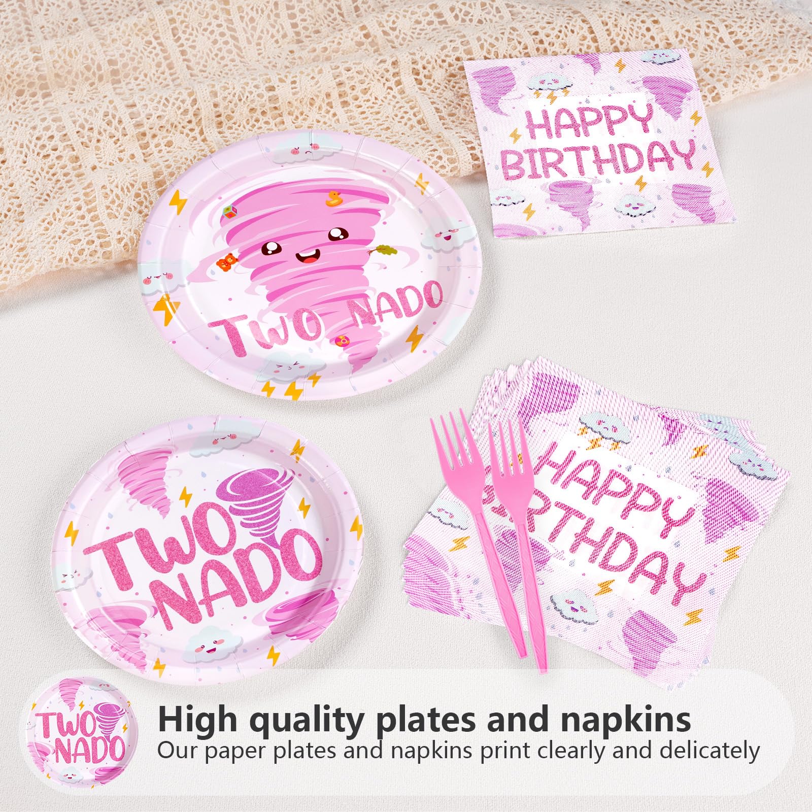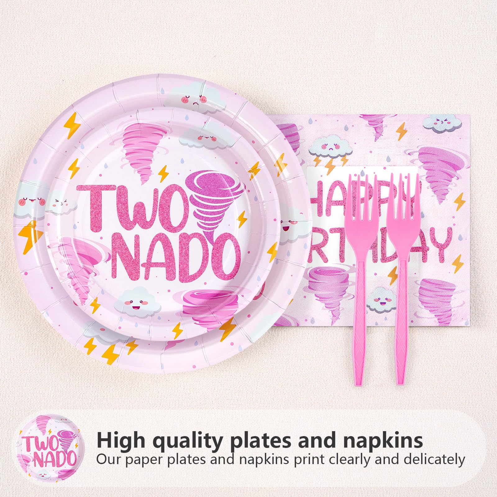 2nd Birthday Decorations: Our second birthday party tableware set include 24pcs pink tornado birthday party plates of 9'', 24pcs tornado birthday plates of 7'', 24pcs napkins of 6.5'' and 24 plastic forks. Good for celebrate 2 year old girl birthday decorations and make your party unforgettable with tornado birthday party decorations