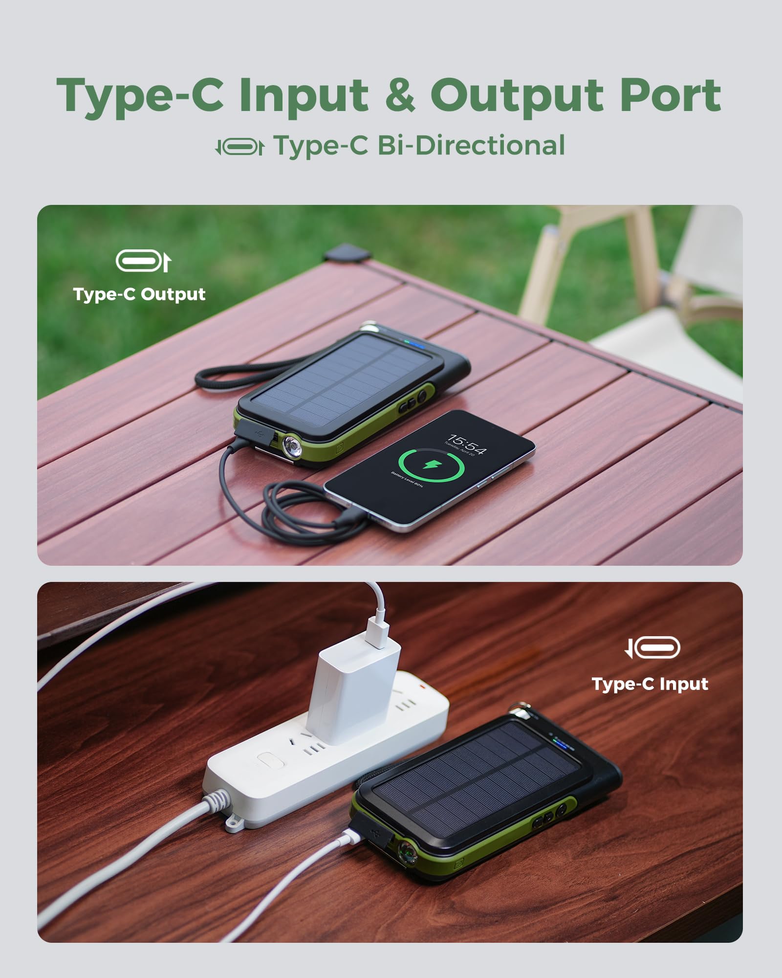 [Power 5 Devices at Once] This solar charger is also equipped with 2 ports (USB-C input/output, USB A output), providing 5V/3A high-speed charging to save time. Our solar power bank with 2 charging cables(type-C,lightning cable) and wireless charging supports charging 5 devices simultaneously. Keep all your devices alive. Sharing with families and friends is perfect.