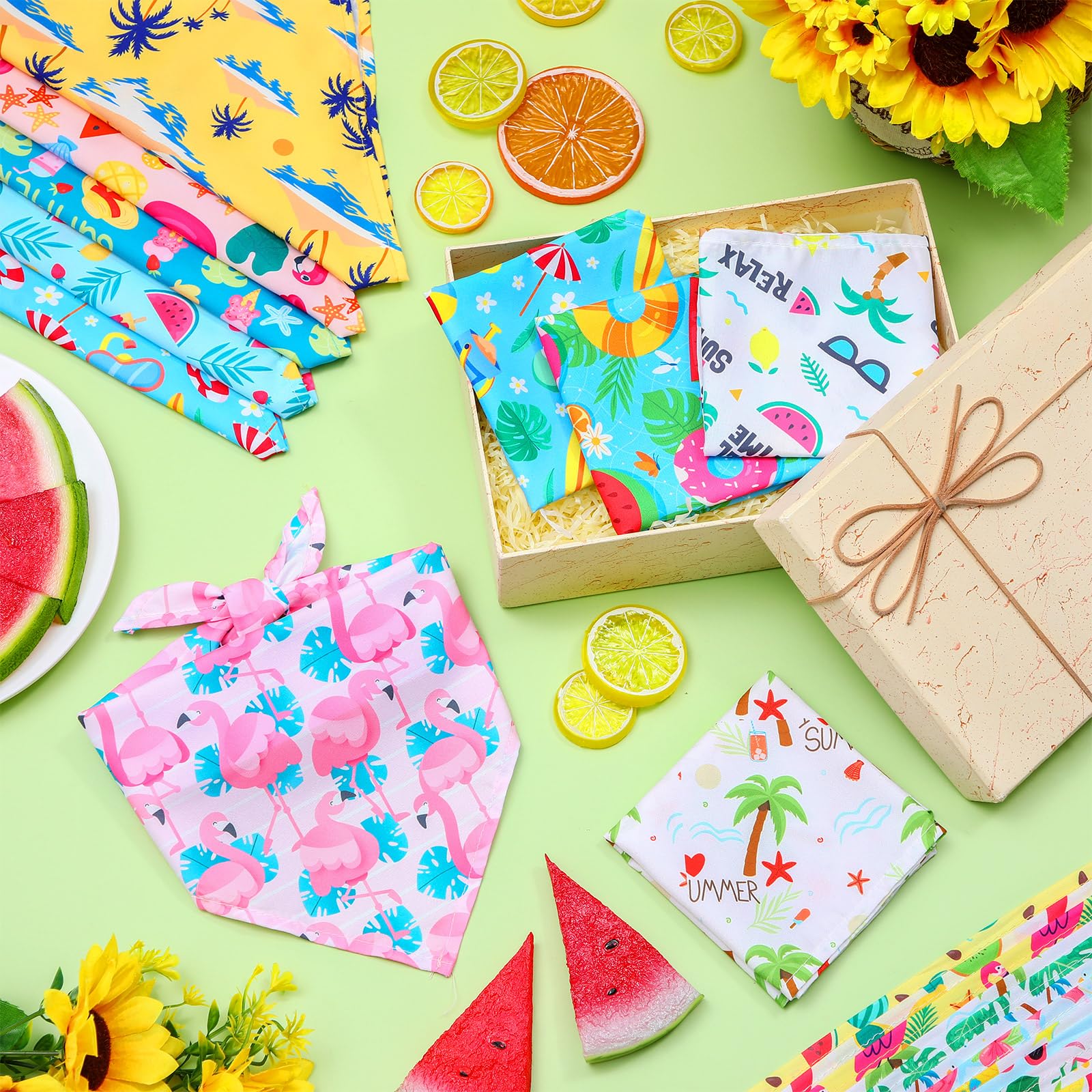 Summer Themed Dog Bandanas: our dog bandanas are printed with a variety of summer designs on the surface, such as fruits, flamingo, palm leaves and other elements, full of festive atmosphere, the ideal way to dress up your pet