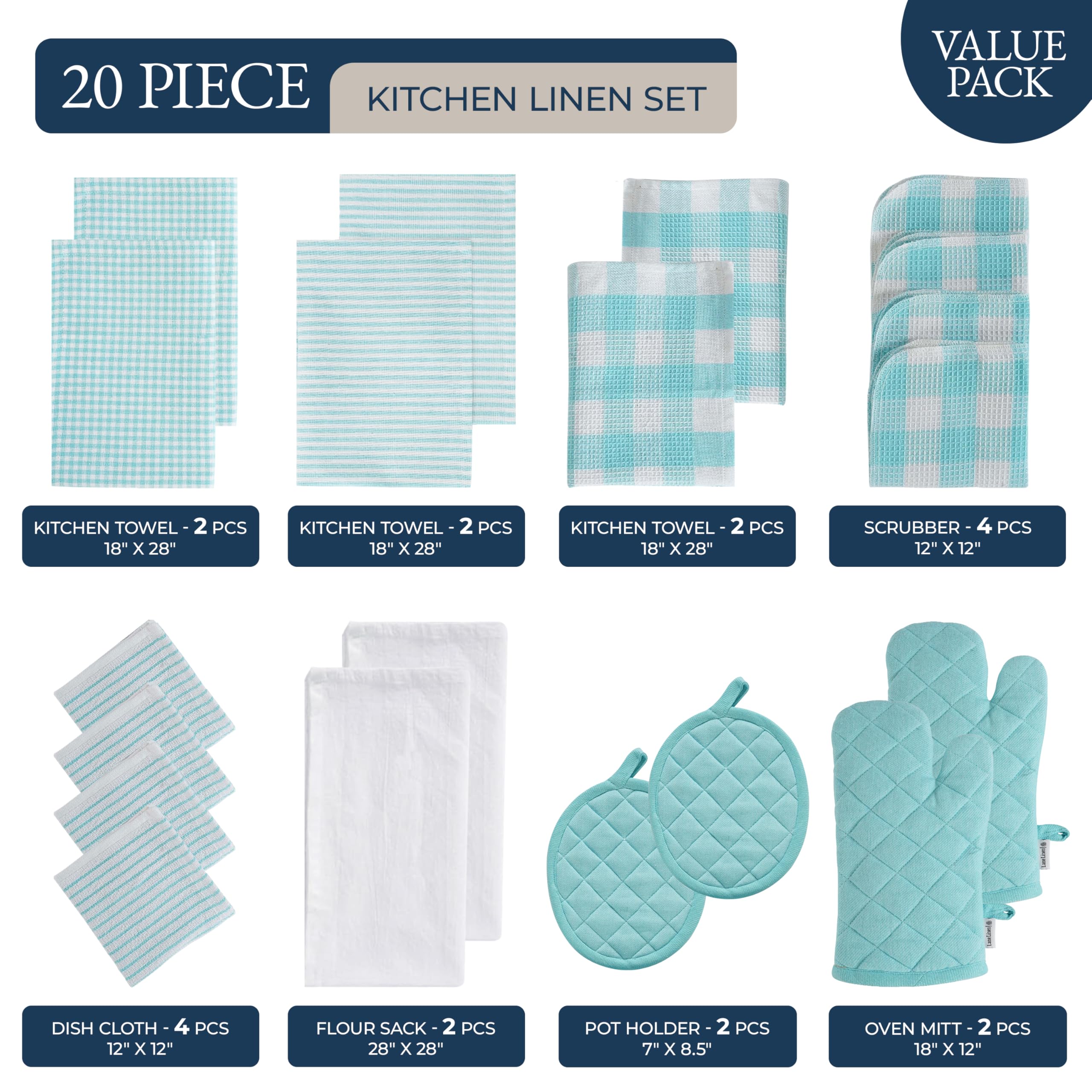 20-Piece Kitchen Marvel: Get more for less with our 20-piece set! Includes 6 cotton kitchen towels (16"x28"), 4 dish drying towels (12"x12"), 4 dish scrubbers for washing dishes (12”x12”) 2 flour sack dish towels for kitchen (28”x28”), 2 Pot Holders, 2 Oven Mits. All 100% cotton – soft, durable, and ready to tackle any kitchen task!