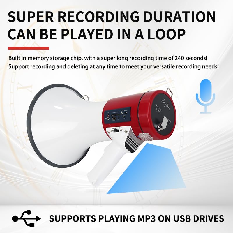 【Recording and Siren】This bull horn loud speaker Built in memory storage chip, with a super long recording time of 240 seconds, support recording and deleting at any time to meet your versatile recording needs and it built-in siren funcation which can easily attract the attention of the crowd.