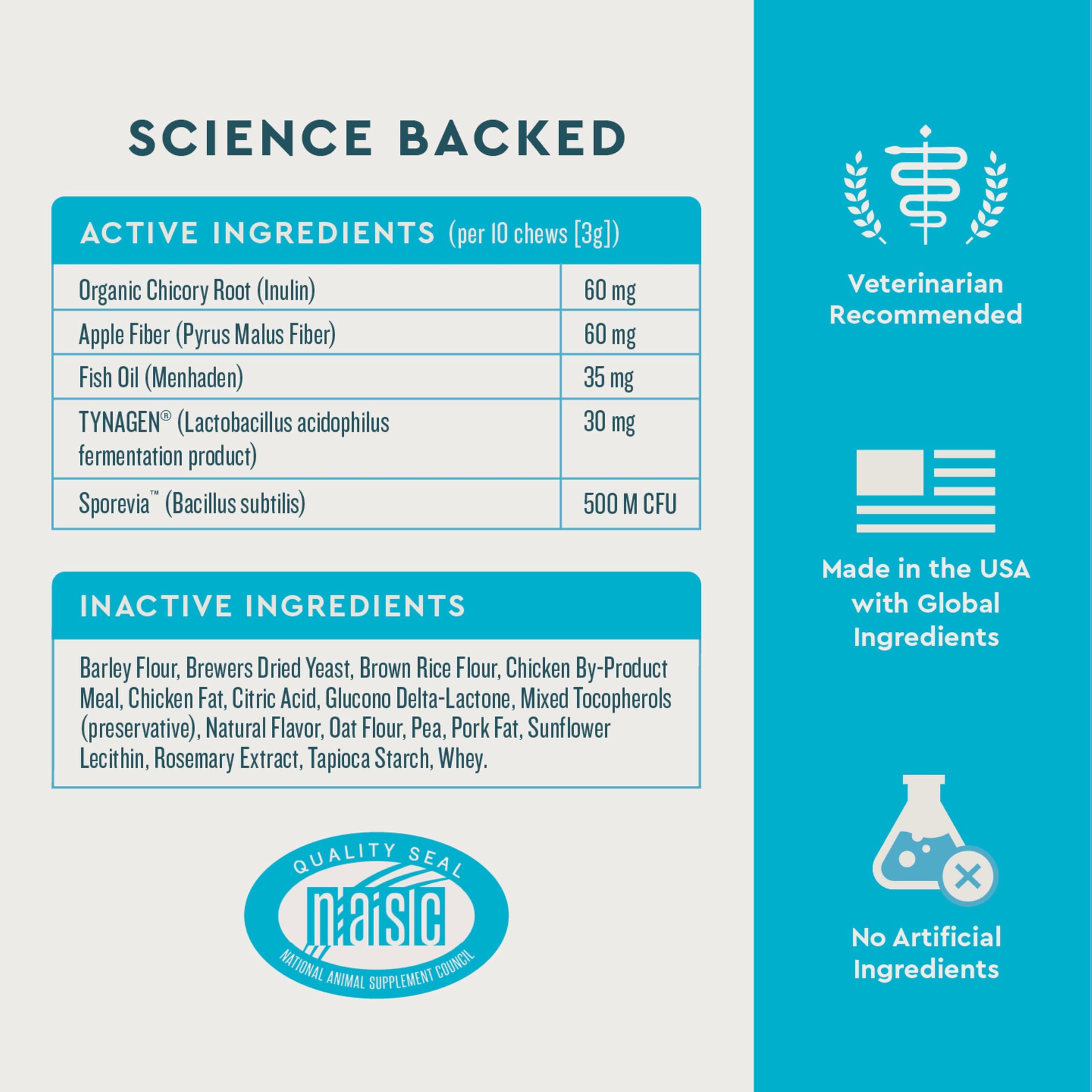 Potent High-Quality Active Ingredients: A probiotic for cats made with functional ingredients; organic chicory root & apple fiber; SPOREVIATM to maintain a healthy gut; TYNAGEN to help microbiome health; menhaden fish oil for overall wellness