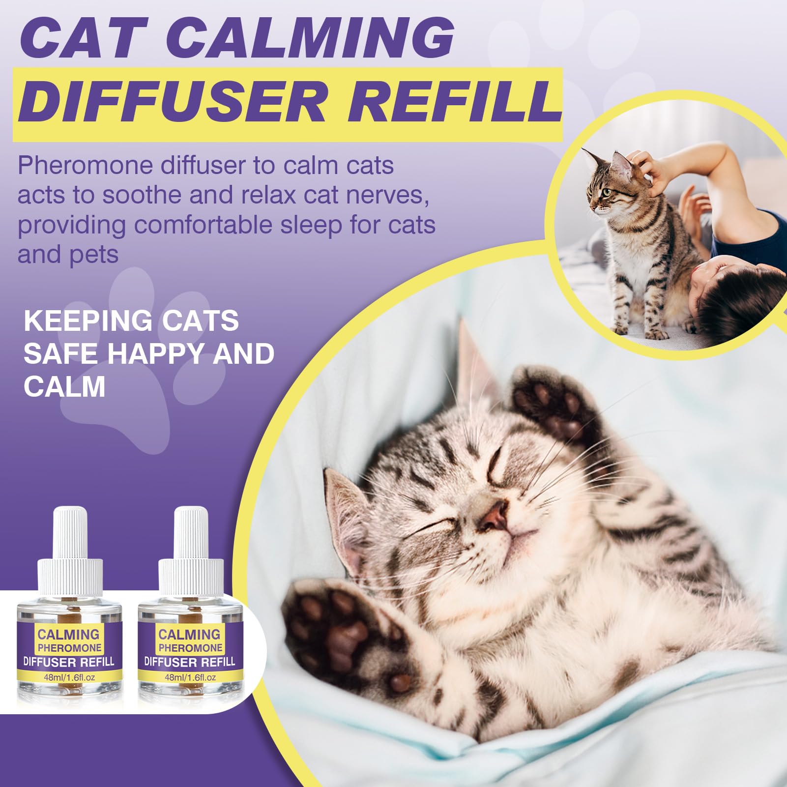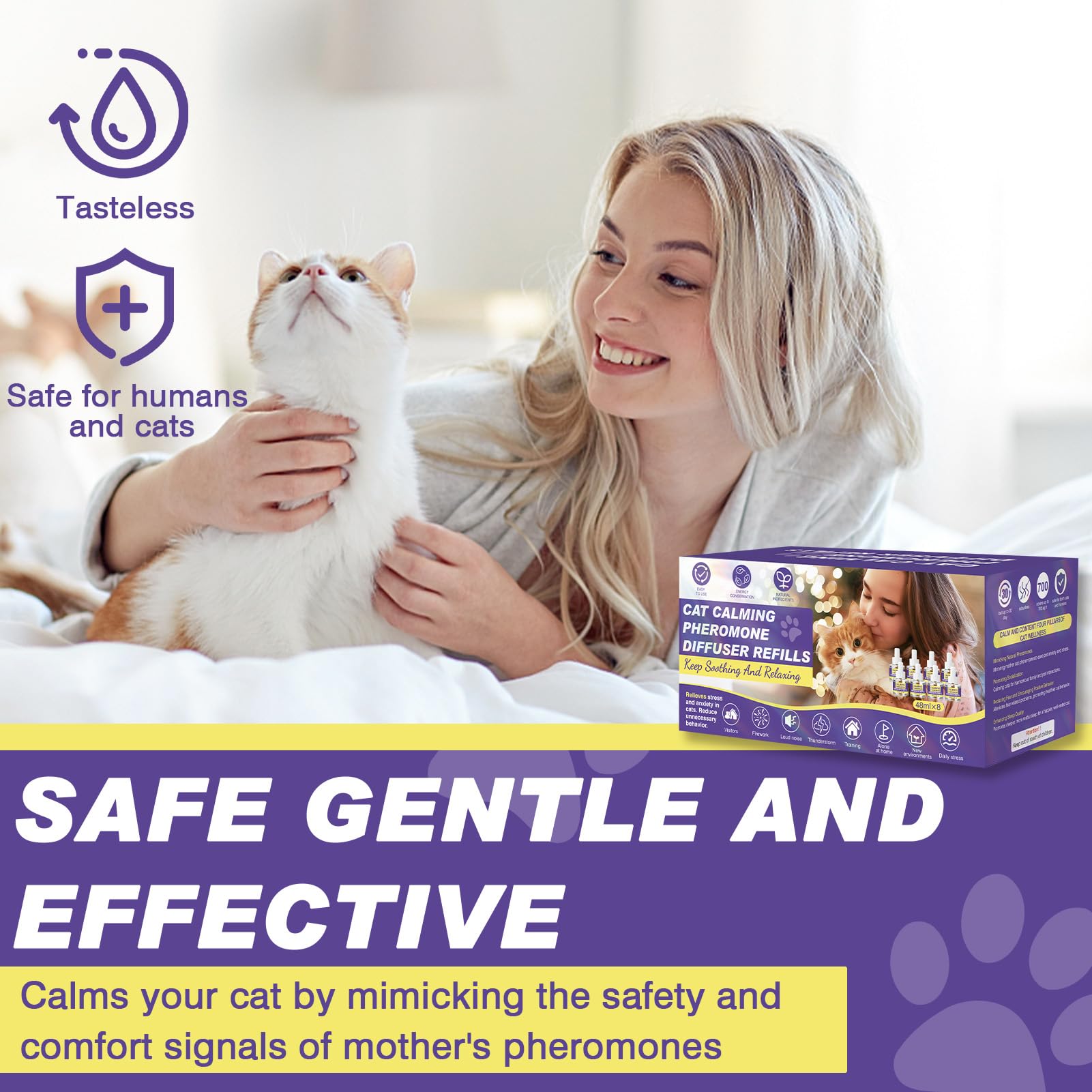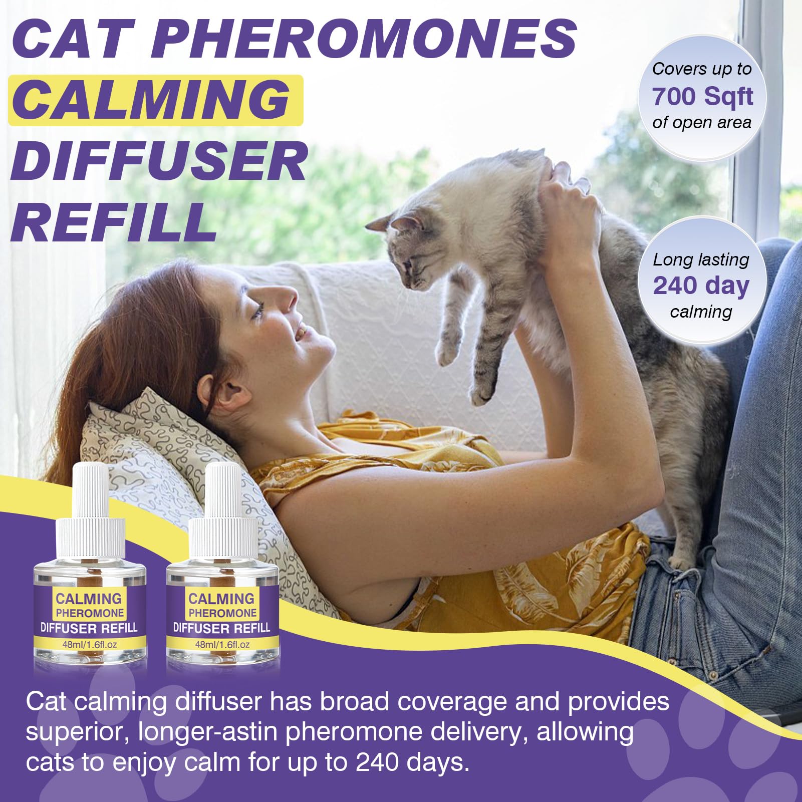 Selected Sets for Long-Term Calm: The cat calming diffuser refill set contains 8 cat pheromone diffuser refills (48 ml each). Each calming cat diffuser refill provides you with up to 30 days of calm so your cat can enjoy more happiness. Cat relaxing diffuser is a cat calming product. Cat pheromones can soothe and relax cat nerves, providing cats and pets with a comfortable sleep. Calm cat diffuser refills are very easy to use and store
