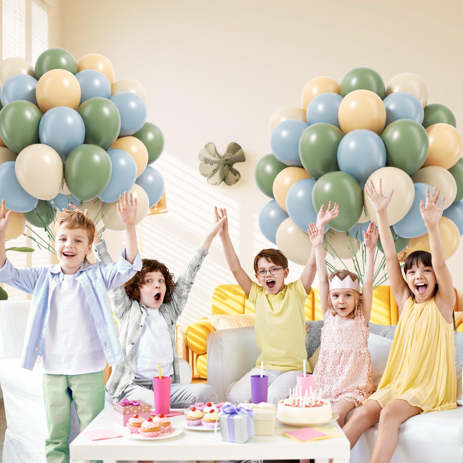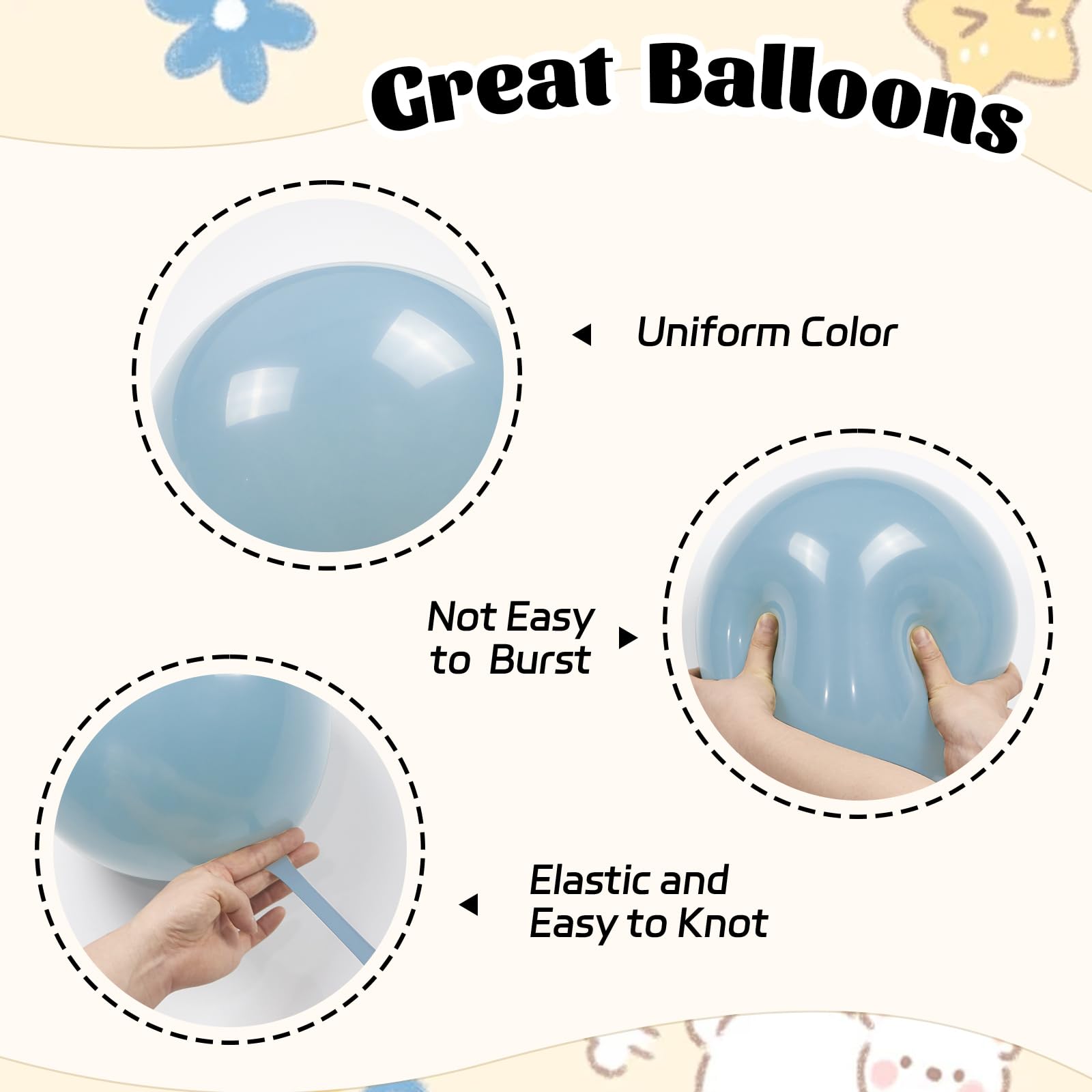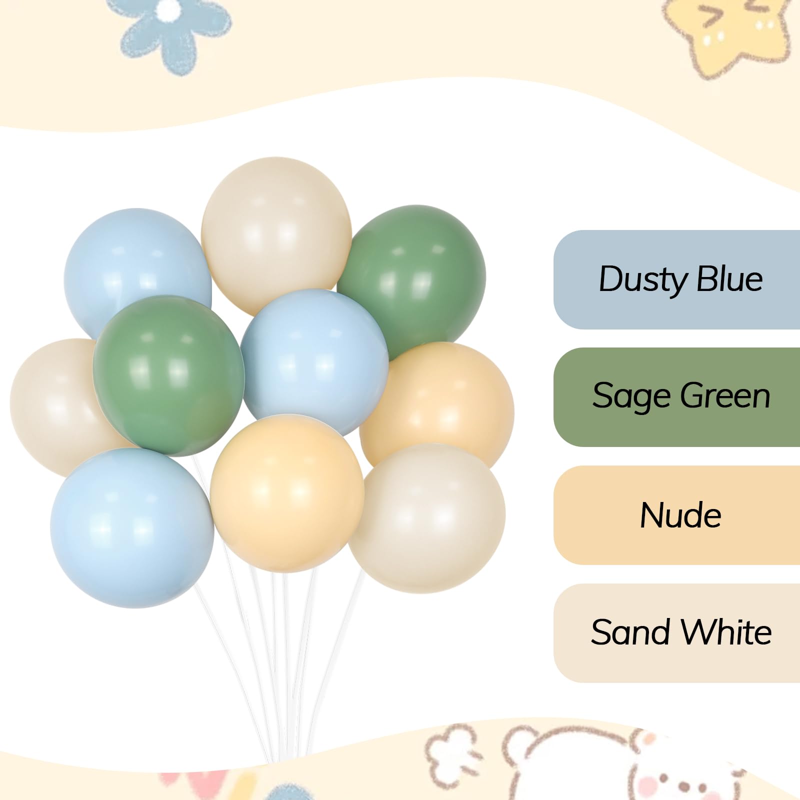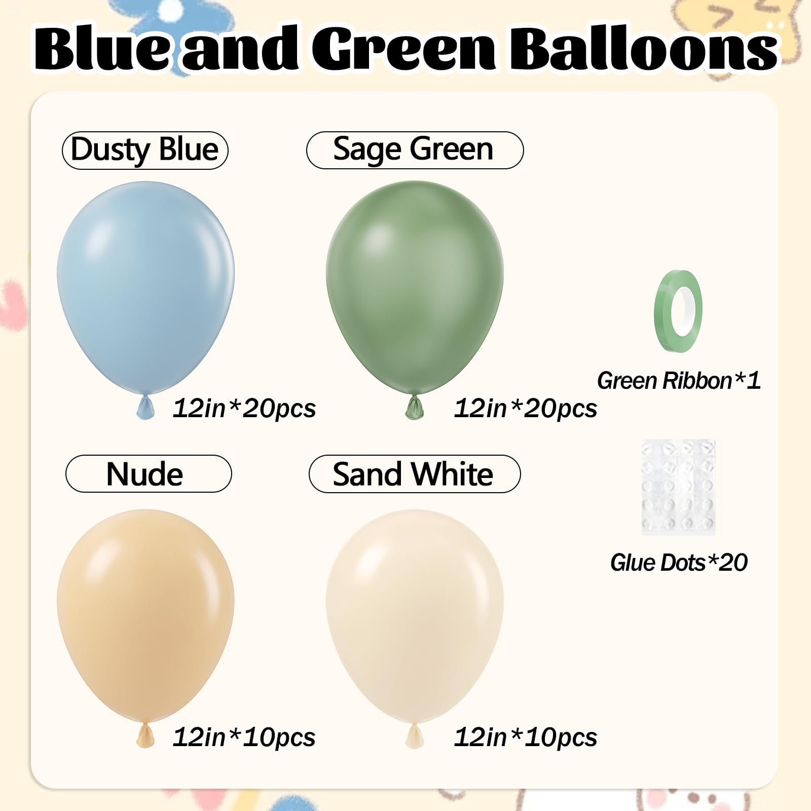Package Include: The dusty blue and green balloons include 12inch dusty blue balloonsx20, 12inch sage green balloonsx20, 12inch nude balloonsx10, 12inch sand white balloonsx10, glue dotsx20, green ribbonx1