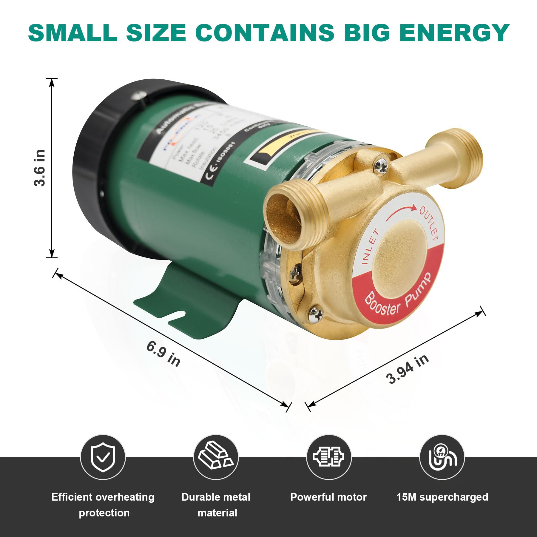 High Performance Water Pressure Booster Pump: 396GPH (25L/min) Flow Rate, 49.2ft (15m) Head, and 1.5bar (21.7 PSI) Maximum Pressure. Standard 1/2" NPT Connection Size.