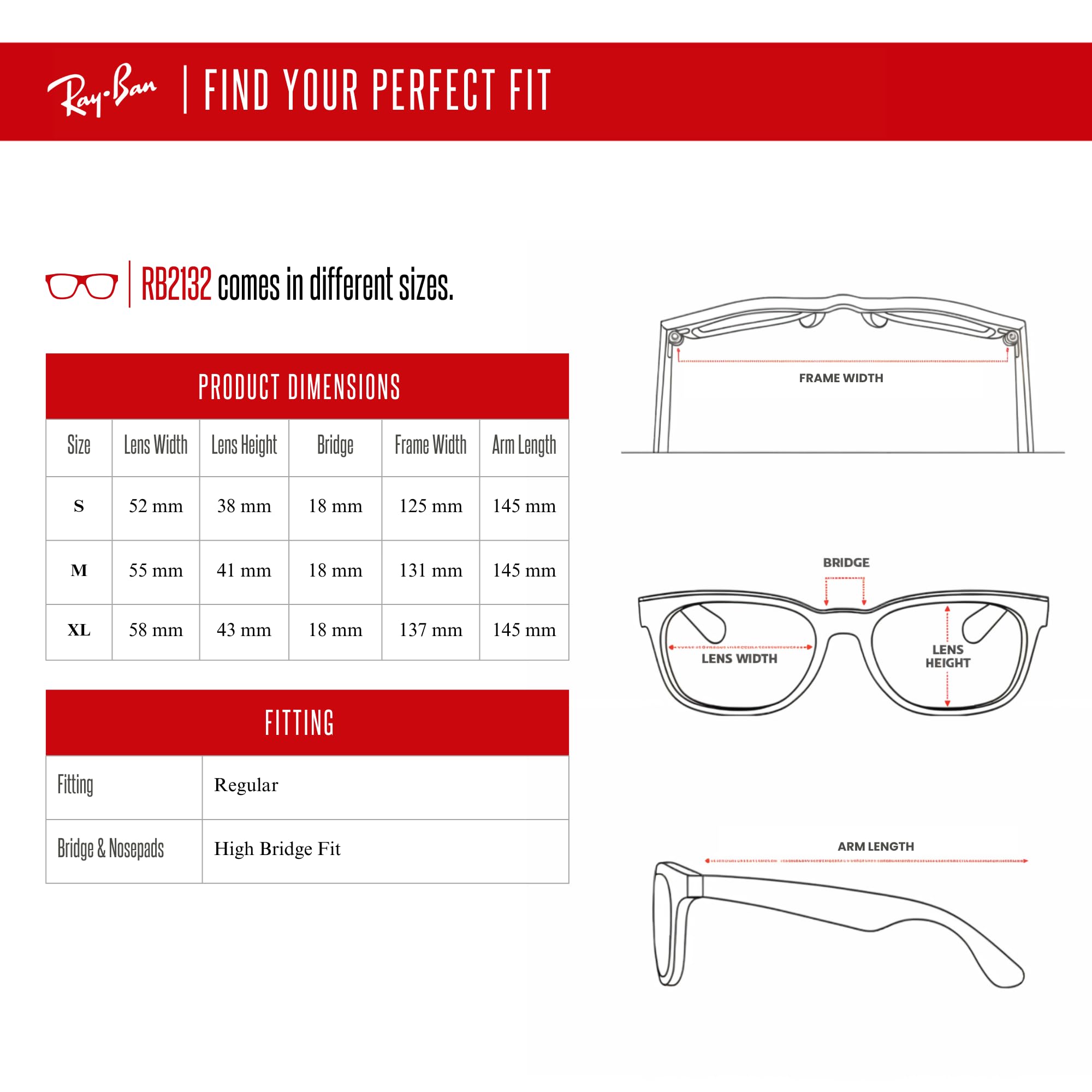 💥RB2132 New Wayfarer Frame Fit: Regular fit with a high bridge, making it perfect for medium to large face shapes with a higher nose bridge. RB2132 features a lightweight nylon frame that blends the Classic Wayfarer design with a modern update, resulting in a flexible, comfortable fit with timeless appeal and a more stylish, modern look.