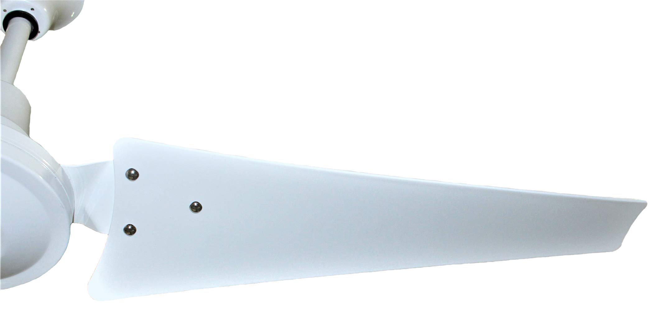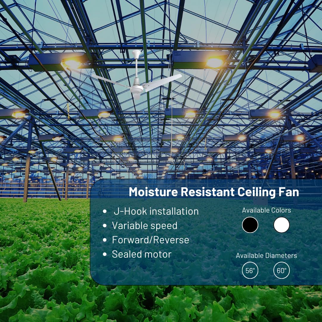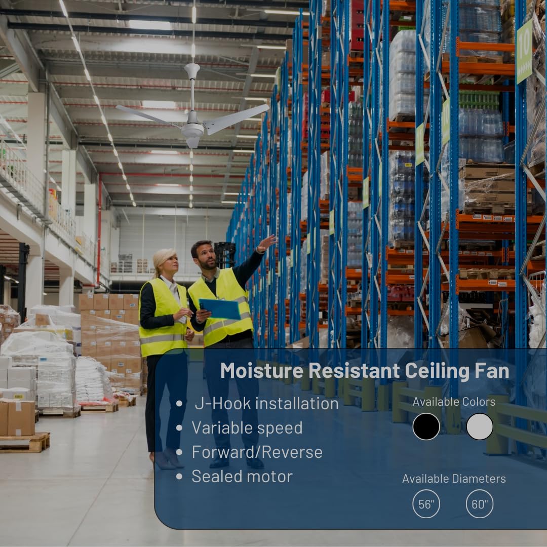 VES Environmental Solutions, INC is North America's most innovative environmental company. Our components are designed to cover all aspects of a good ventilation system. With today's high heating and cooling cost you need to find a way to reduce your energy bills and provide an ideal environment for workers. Our Energy Saving Industrial Ceiling Fan Series is the most cost-effective way to move large volumes of air in any building that has ceilings exceeding 15 feet. In the wintertime, hot air rises and is trapped at the ceiling level. Ceiling fans gently push this hot air down and keeps the floor level of the building warmer. By recovering the warm air, you lose less heat out through the roof and your heaters turn on less. This saves you money and provides a better environment to raise productivity. In the summertime, turn the fans on medium to high speed and you create a constant building temperature and a breeze to cool employees, machinery and equipment. Reverse movement is controlled via the VES wall mount control (ASIN: B00I4BA1CO) or by re-wiring the fan directly in the junction box. PRODUCT FEATURES Blade Diameter: 60 in Voltage: 120 V AC Fan Watts: 90 Phase: 1 Max mounting Height: 30 ft Number of Speeds: Variable Amps: 0.70 Max Ambient Temp: 105 Degrees F Reversible: Yes Blade Material: Plastic Our moisture resistant fans are for damp locations only. For example: covered poches, patios, and sunrooms where it will not be in direct contact with rain or water.