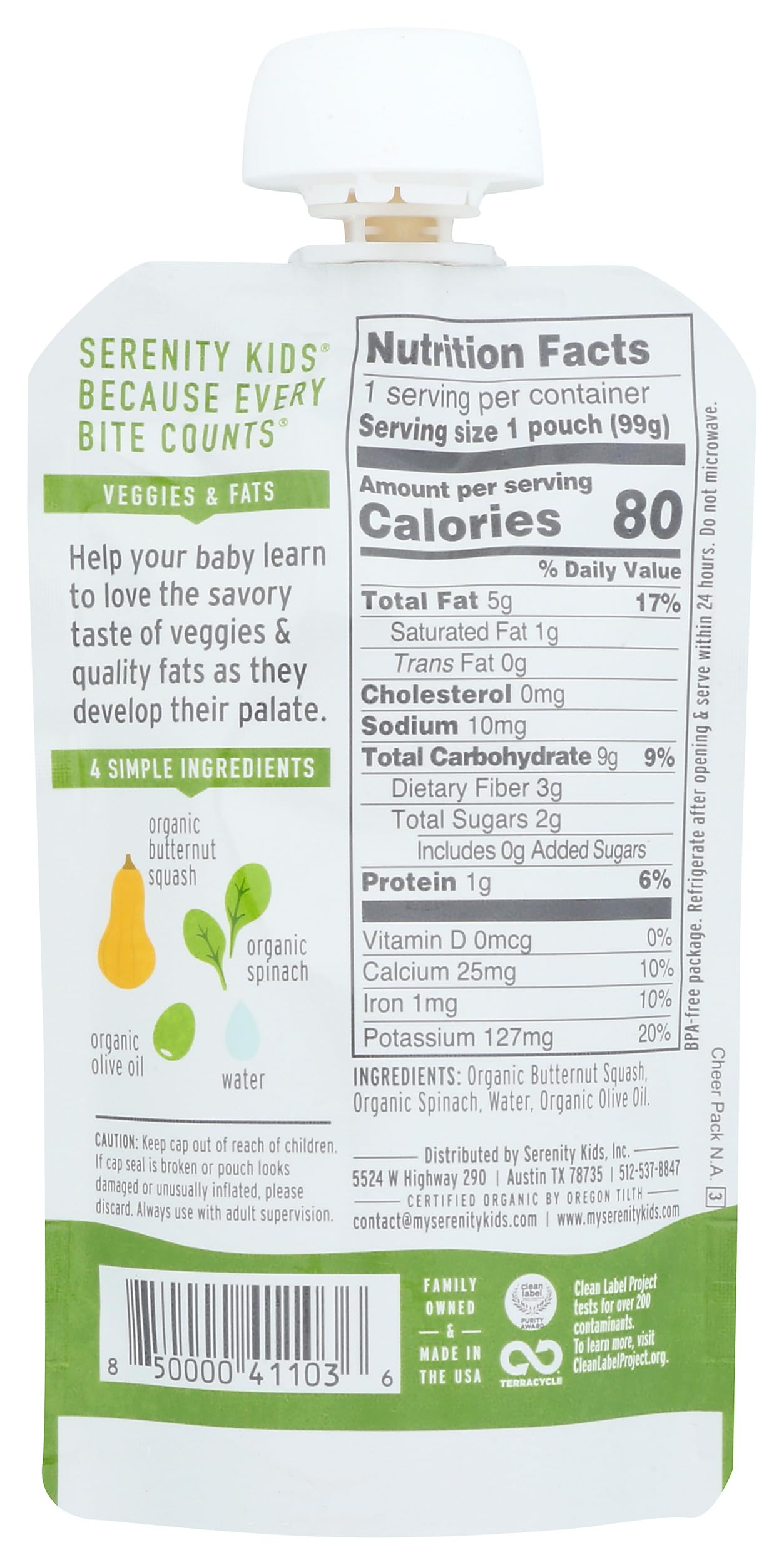 ORGANIC BUTTERNUT SQUASH & SPINACH: Contains 1 pouch of baby food puree made from organic butternut squash and spinach plus healthy fats from avocado oil.