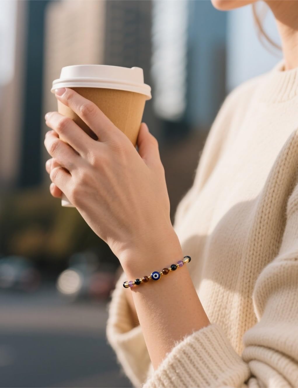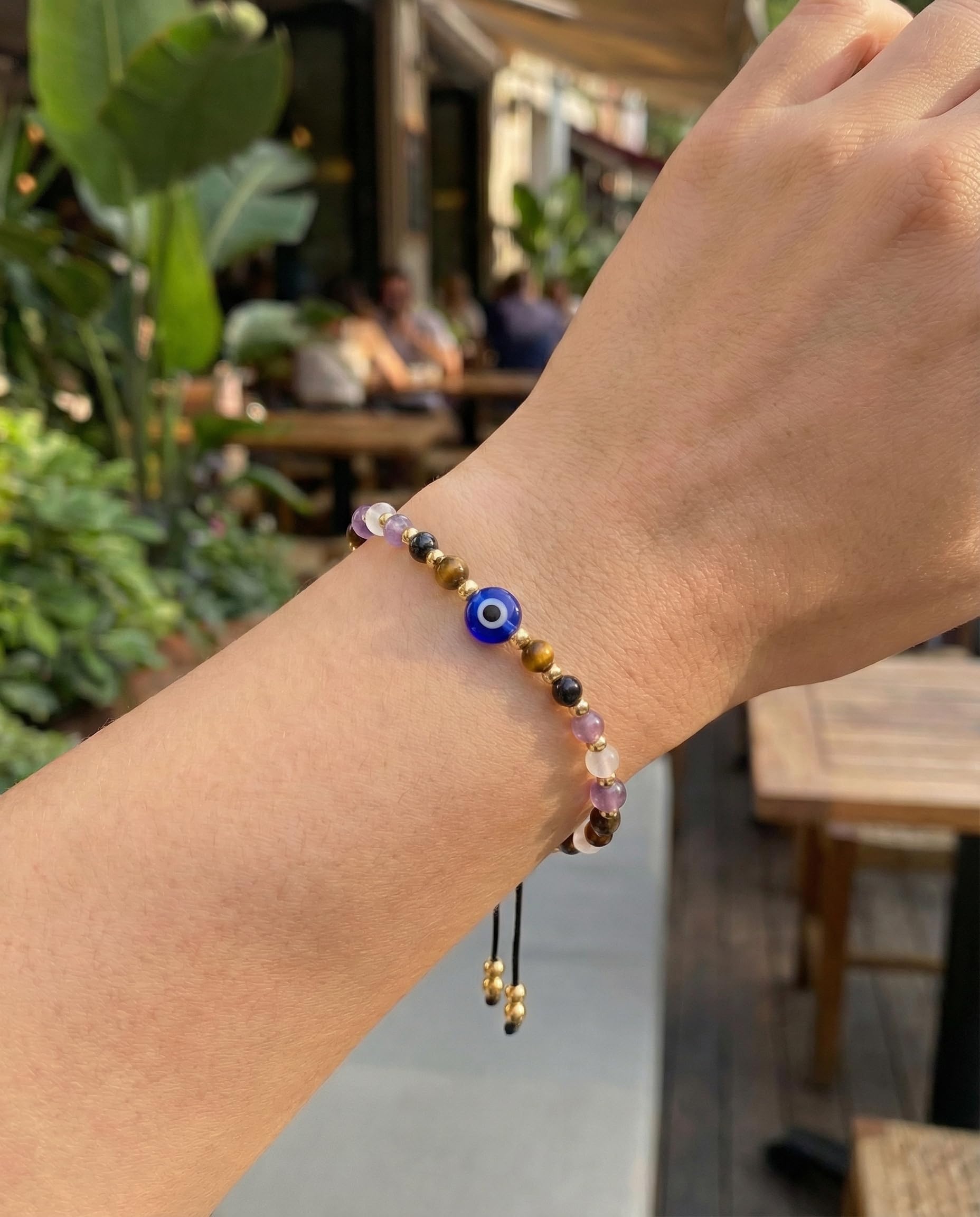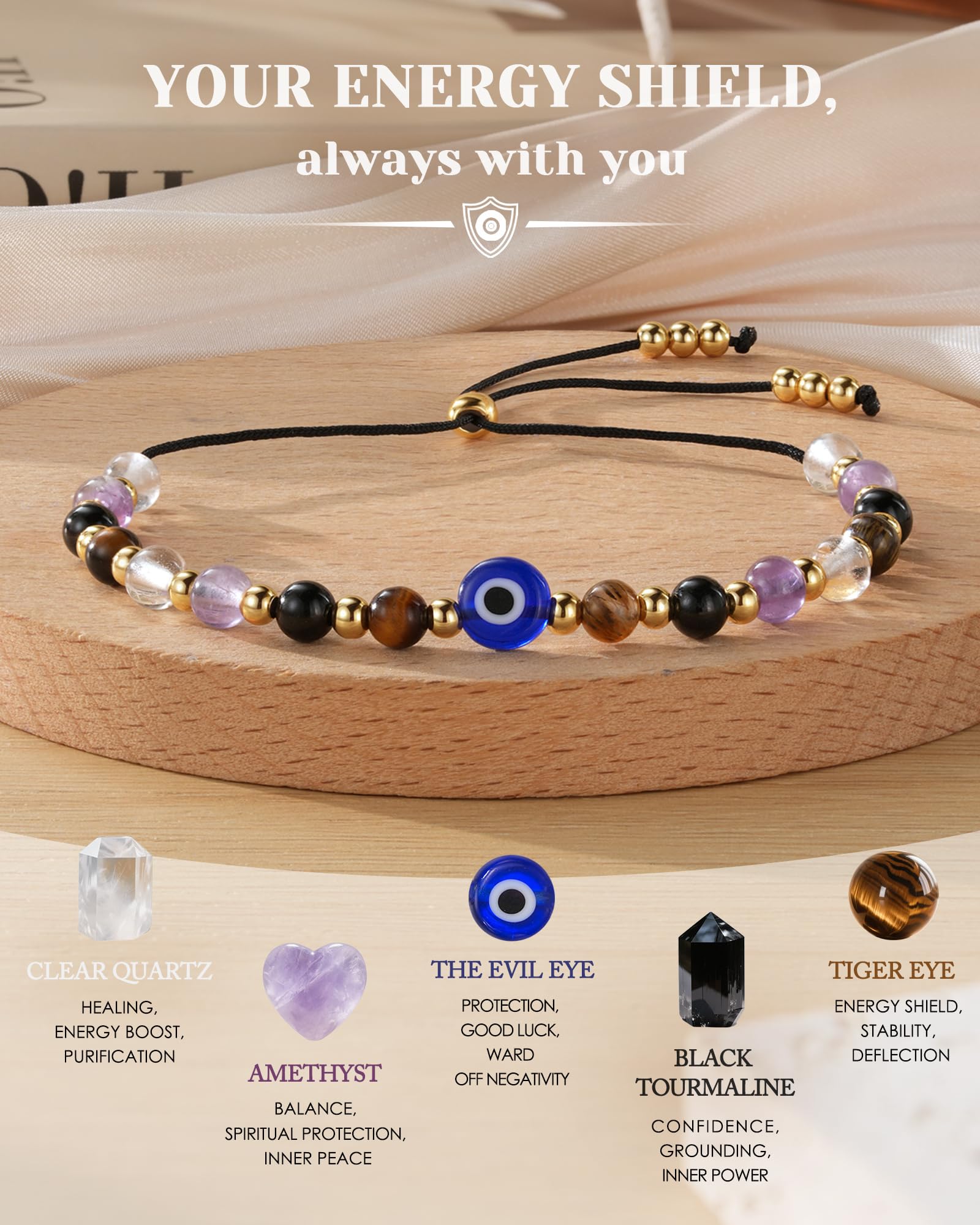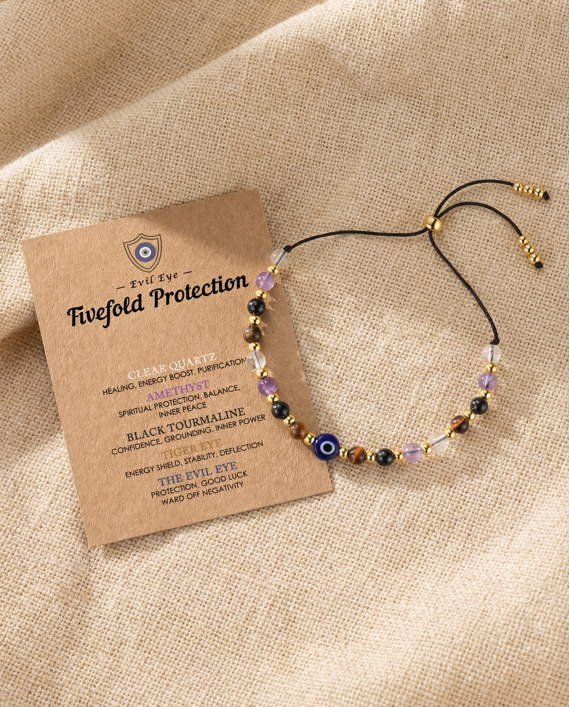 Natural Crystal Selection -- Handcrafted string bracelet features 4mm genuine stones including Evil Eye, Clear Quartz for healing, Amethyst for spiritual protection, Black Tourmaline for grounding, and Tiger Eye for confidence
