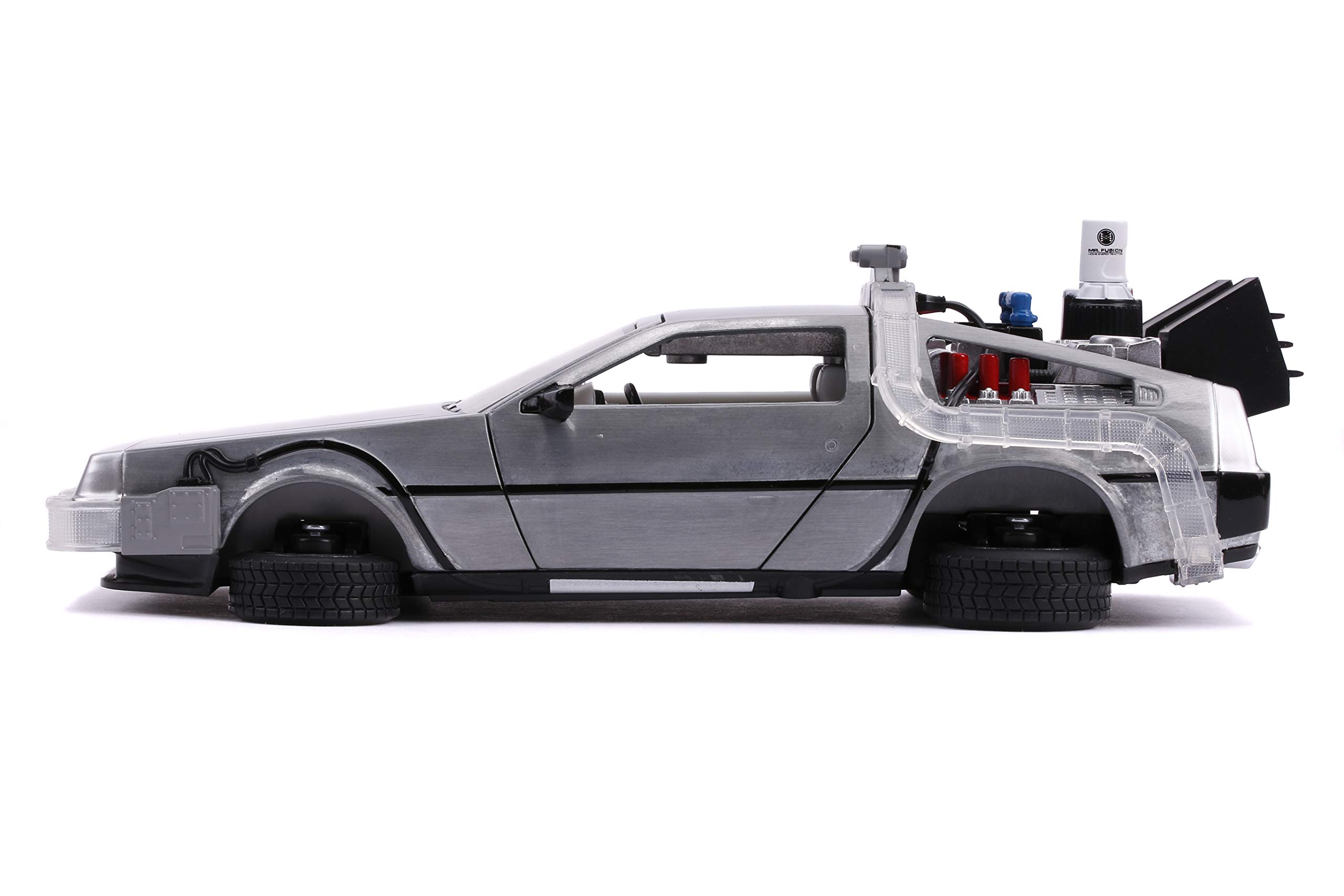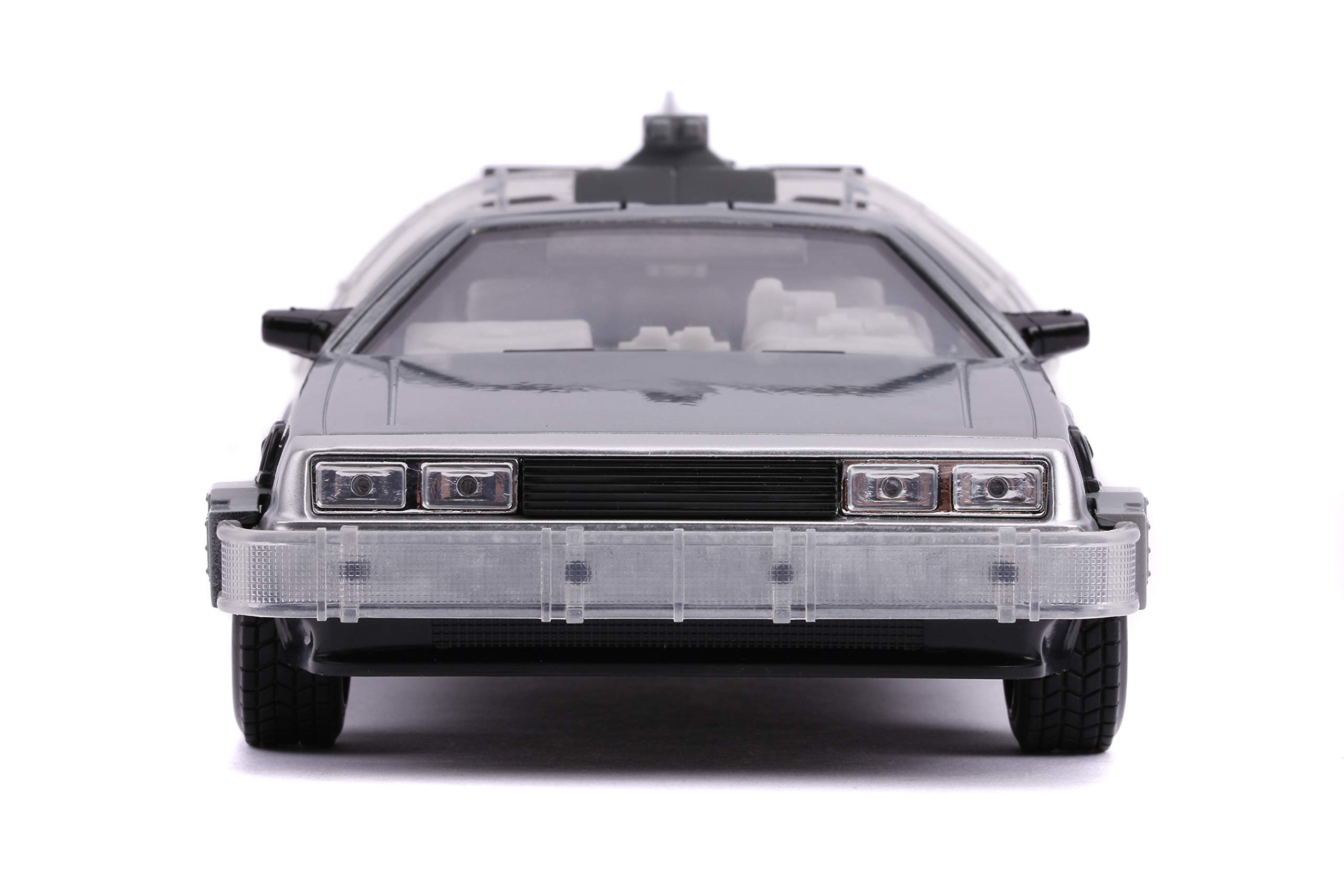 Travel back to the future with one of the most iconic vehicles in the Hollywood Rides lineup: the Time Machine as seen in Back to the Future Part II (1989). Featuring a die-cast body, rubber tires, opening doors, light-up feature and best of all you can fold the wheels inward and display the Time Machine in hover mode. This 1:24 scale vehicle is a must have in any collection!