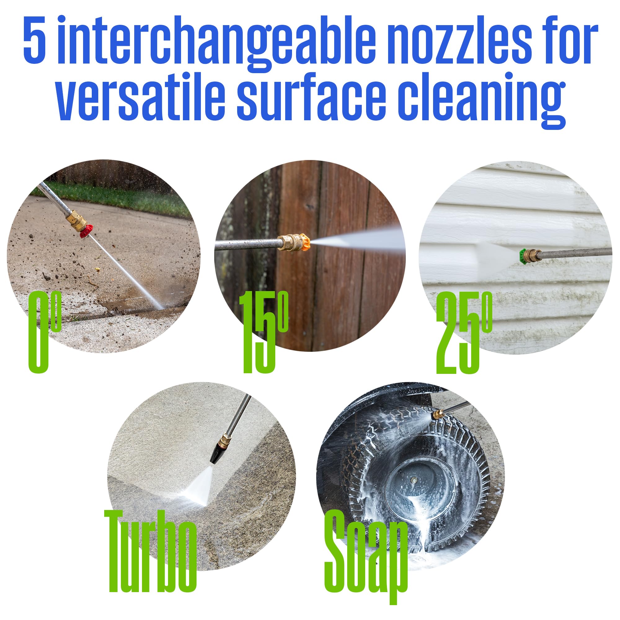 Delivers 2300 max PSI and 1.76 max GPM (at lowest pressure), and 1900 rated PSI and 1.24 rated GPM of water flow; Pro-style steel extendable 17.5” wand with quick-connect nozzles (0°, 15°, 25°, turbo and soap applicator)