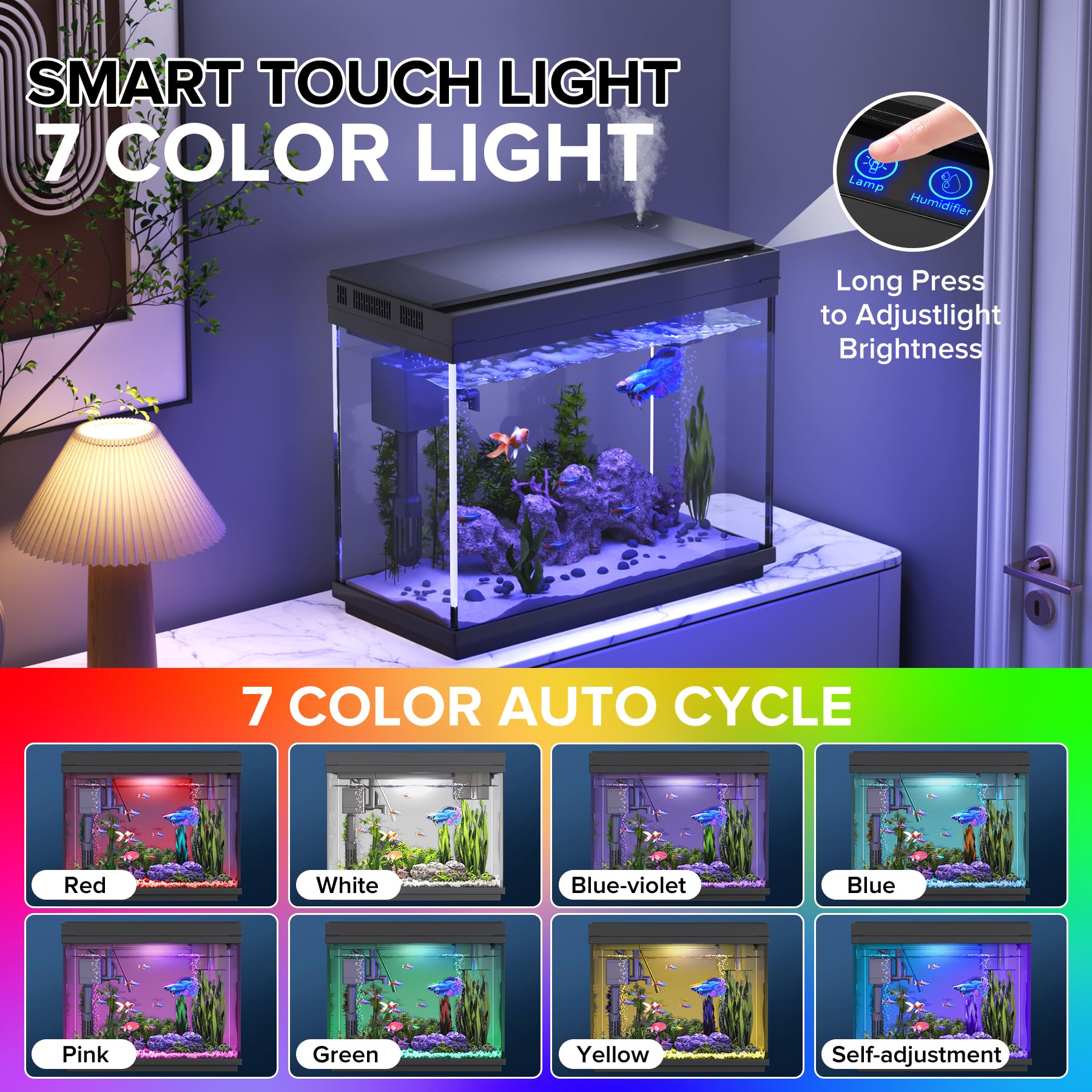 Smart Multi-Functional Aquarium:2.4 gallon fish tank kit with self-circulating 3-in-1 pump and adjustable 7 colors lighting system, includes aromatherapy humidifier with 3 humidification modes and real-time temperature display ping with three decorative plants and the tank lid is designed with feeding ports. The small fish tank not only decorates your indoor space, but also helps to relieve stress and improve your mood for a fun and rewarding experience