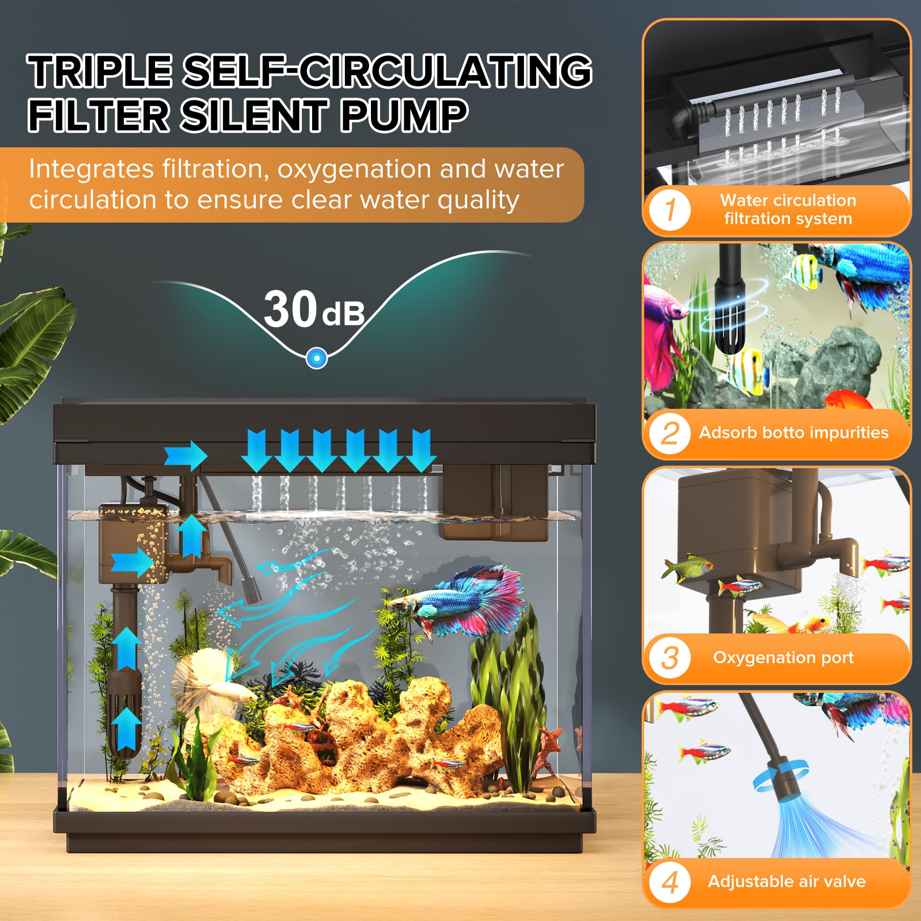 3-in-1 Efficient Circulation System: A self-cleaning fish tank equipped with a triple self-circulating silent pump for effortless filtration and cleaning, keeping the water crystal clear. The oxygenation outlet ensures ample oxygen supply for your fish, while ultra-quiet operation below 30dB guarantees a peaceful and comfortable environment for both you and your fish