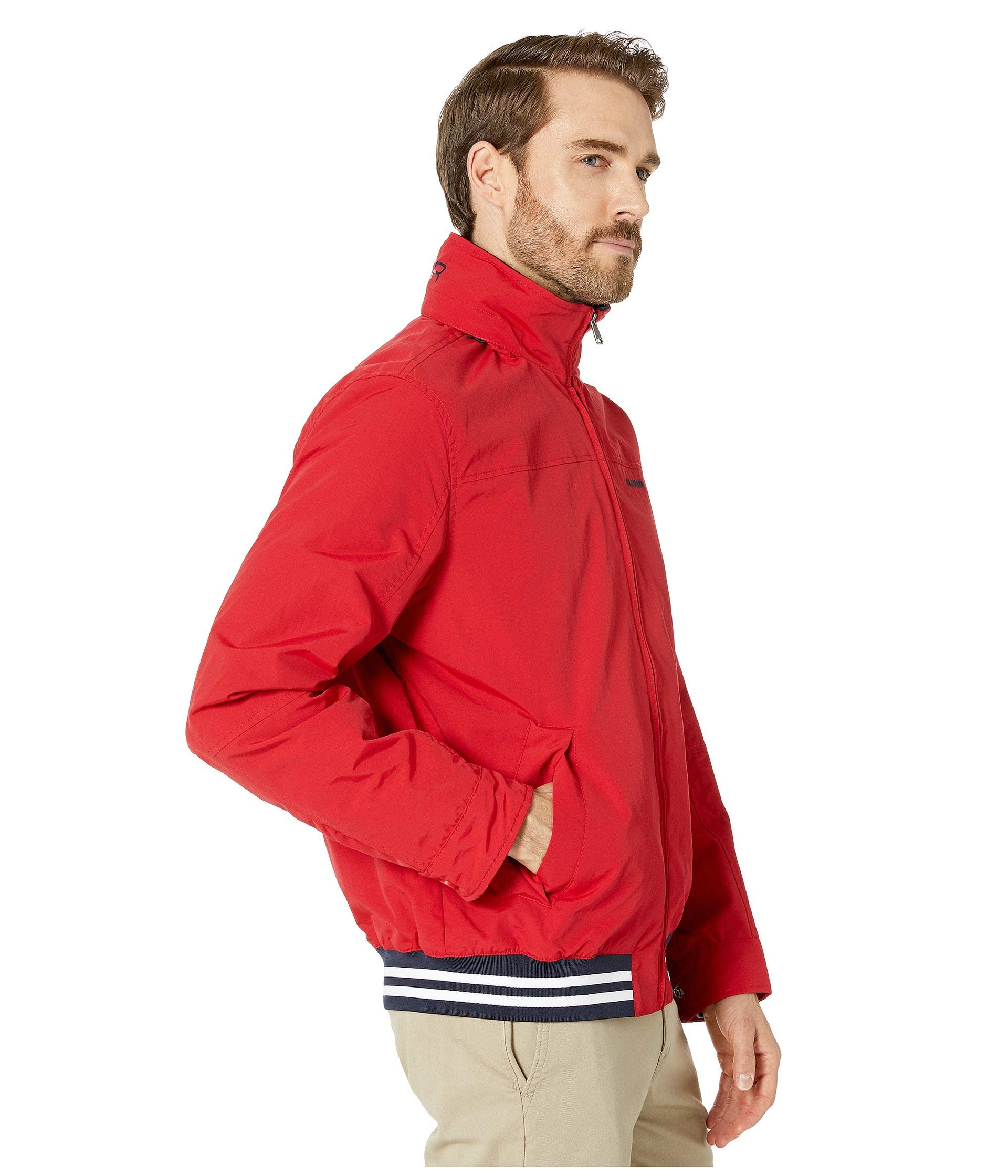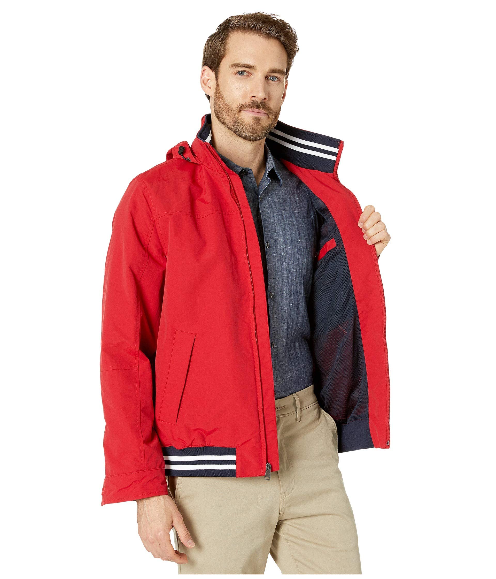 Description Layer up in this men's jacket from Tommy Hilfiger when the weather calls for added protection. Lightweight and waterproof. Zip front closure. Mock collar with packable hood. Slight waist open pockets; interior pocket with hook-and-loop closure.