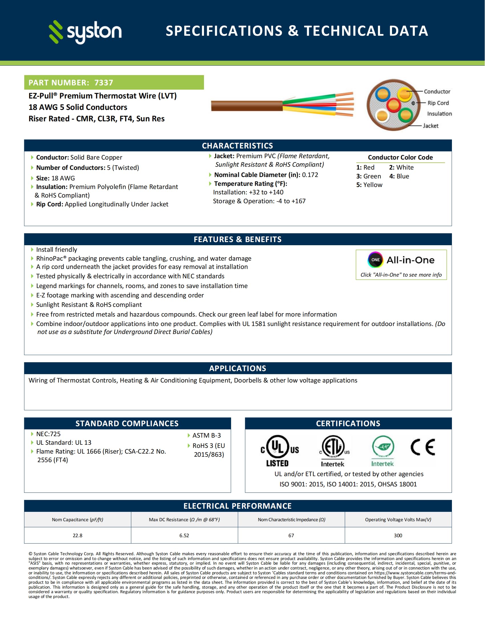 300V Low-Voltage Thermostat Cable (CL3 Rated): 300V rating ensures superior insulation and a high safety margin for low-voltage use, making it ideal for thermostats, security systems, and audio/visual installations while complying with Class 3 (100VA) power-limited standards.
