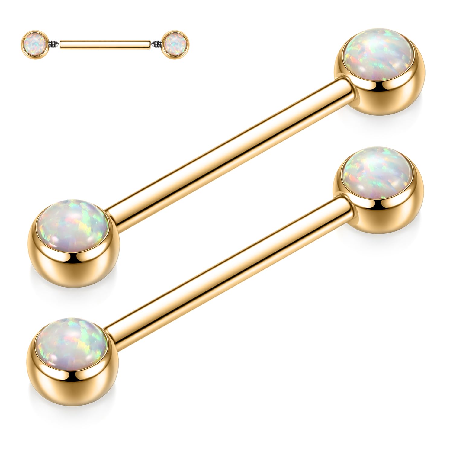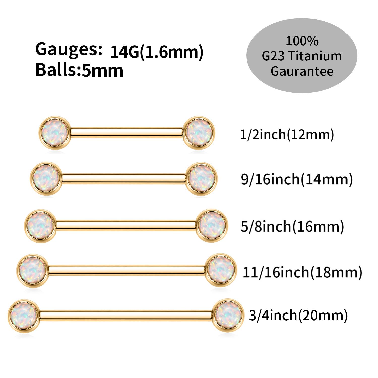 Size and Color: gauge: 14G (1.6 mm); Nipple Barbell Length: 1/2"(12 mm); CZ Size: 5 mm. Color: Gold with white opal. 2pcs nipple rings per order