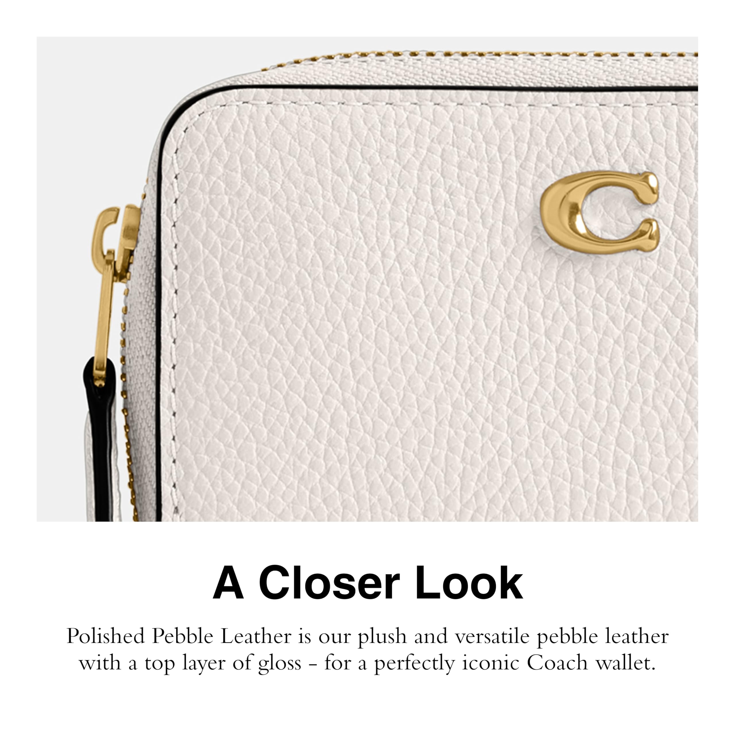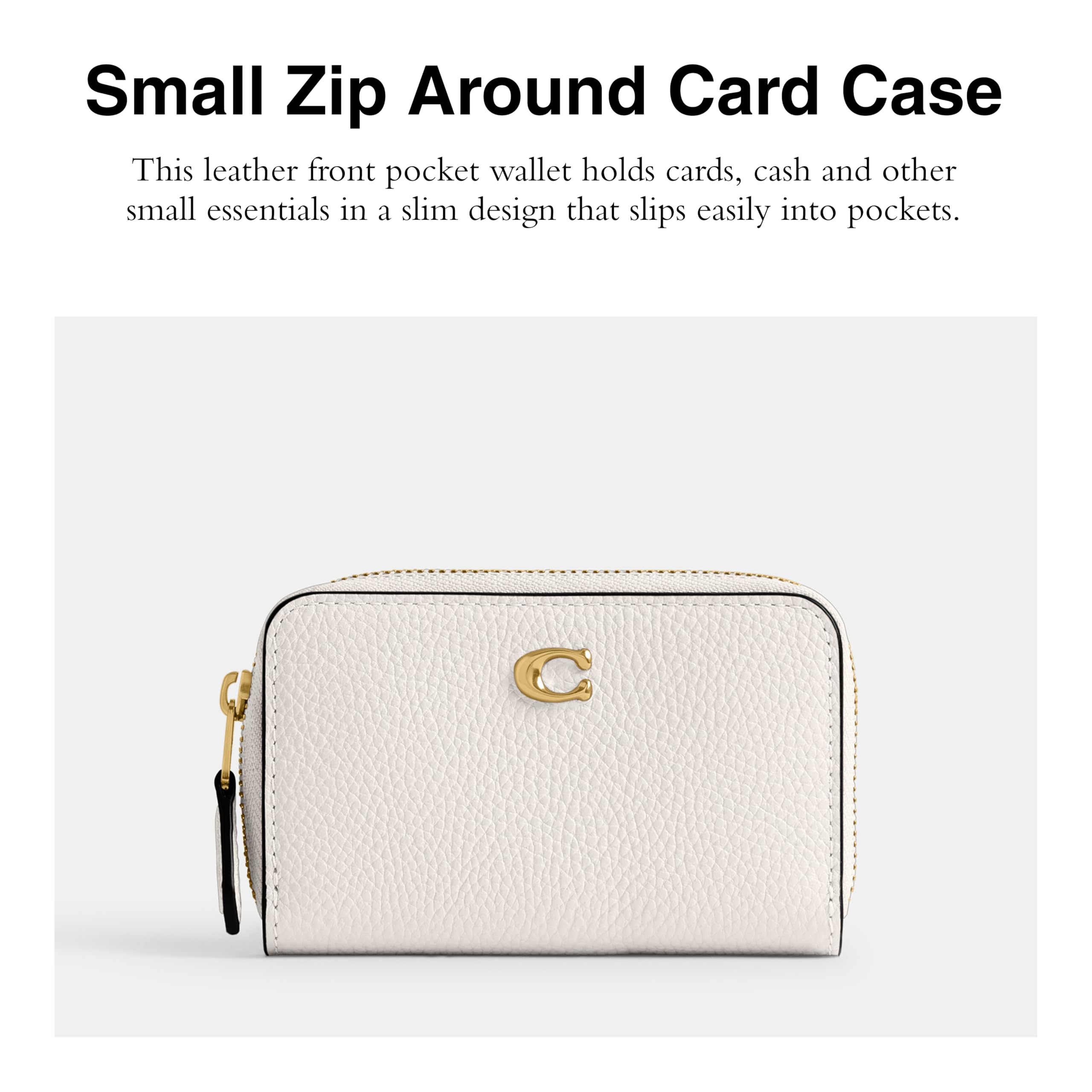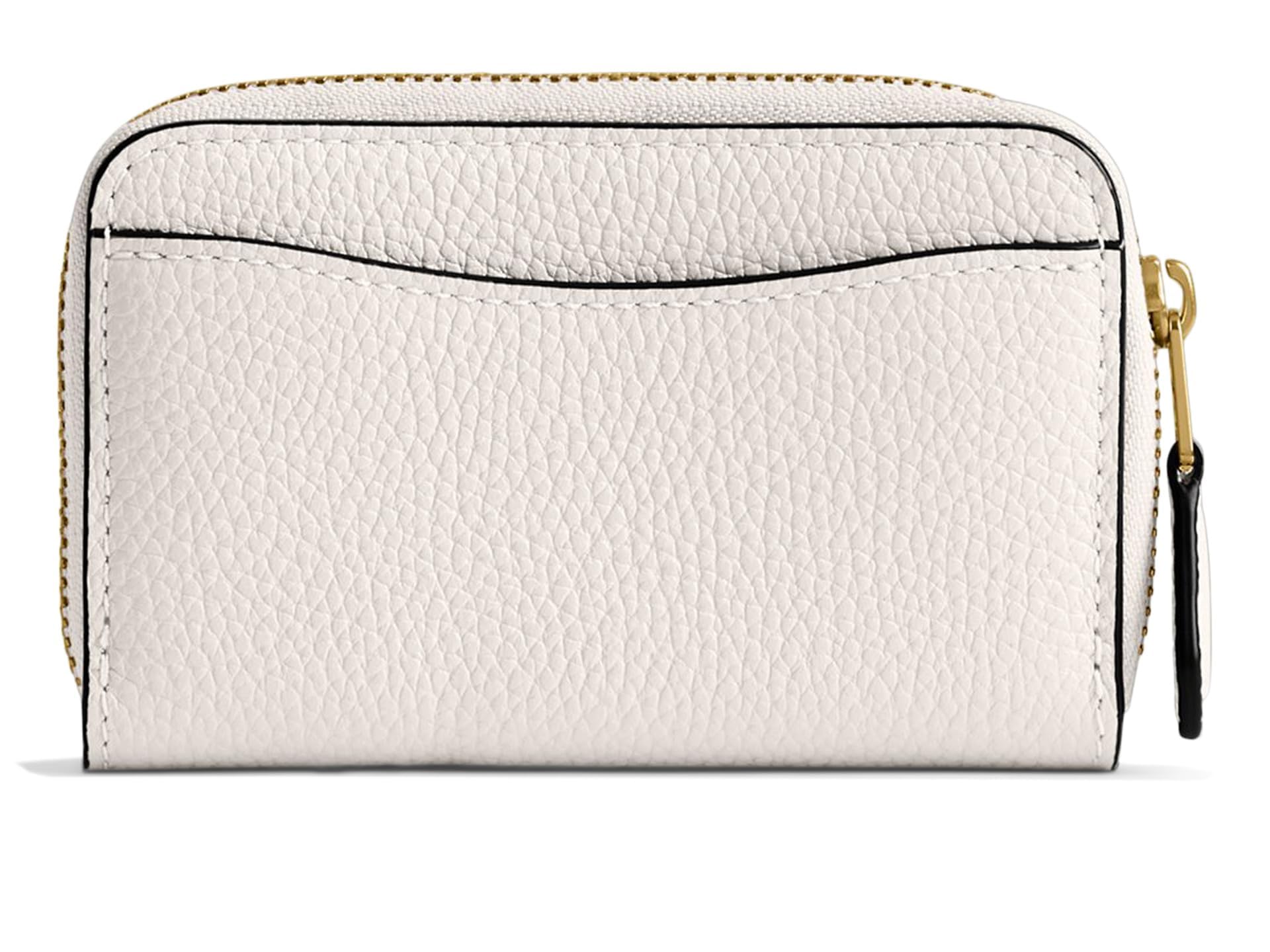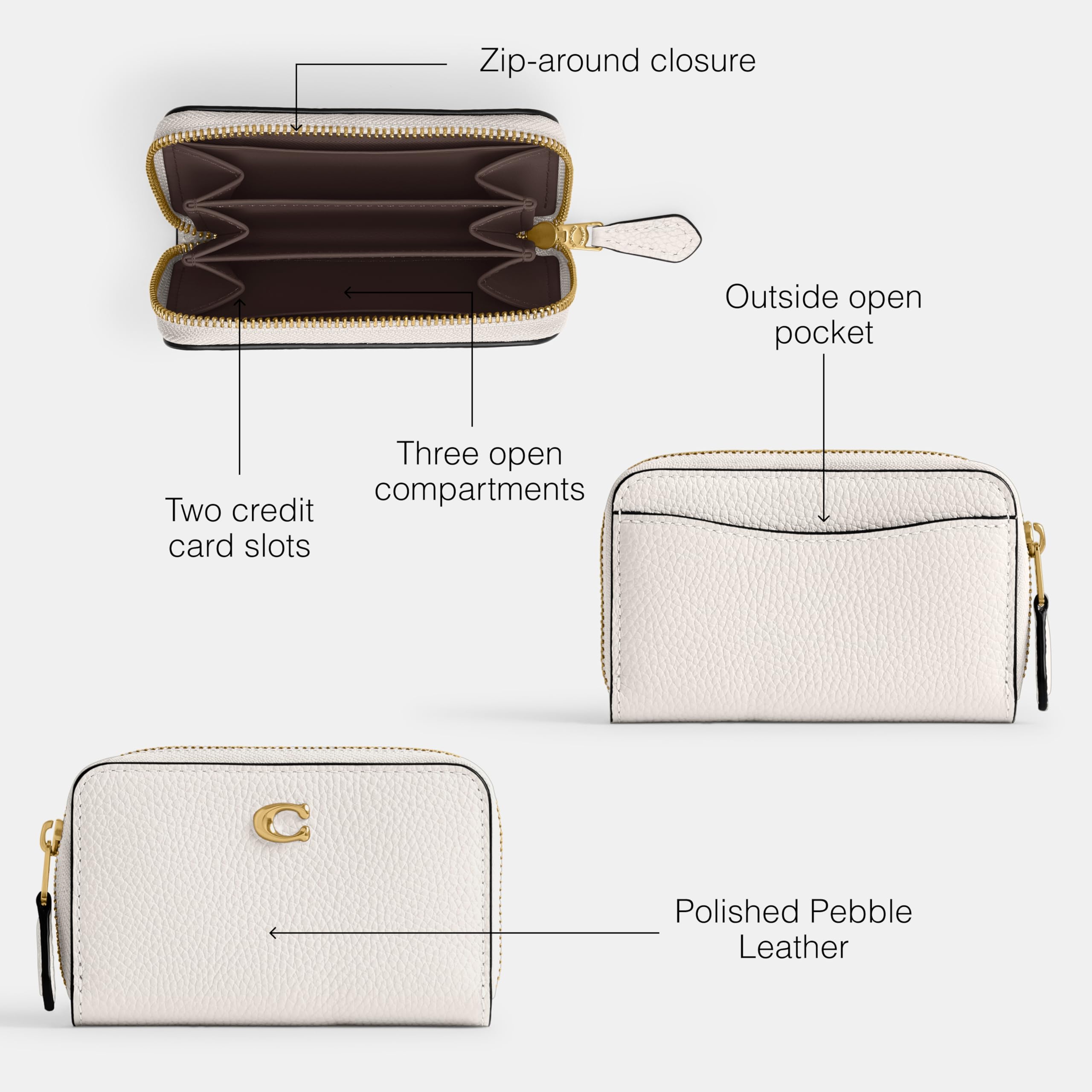 Description Polished pebble leather Two credit card slots Three open compartments Zip-around closure Outside open pocket 4 1/4" (L) x 2 3/4" (H) x 3/4" (W)