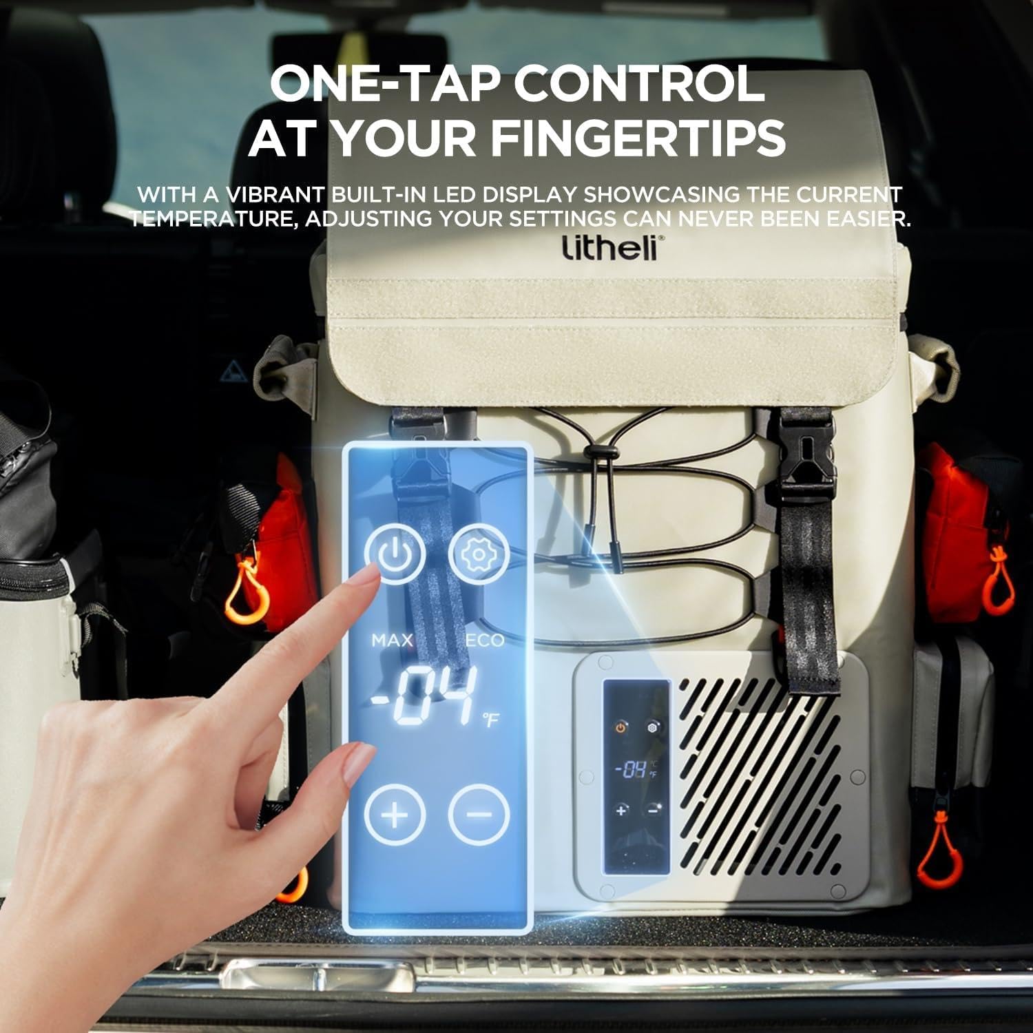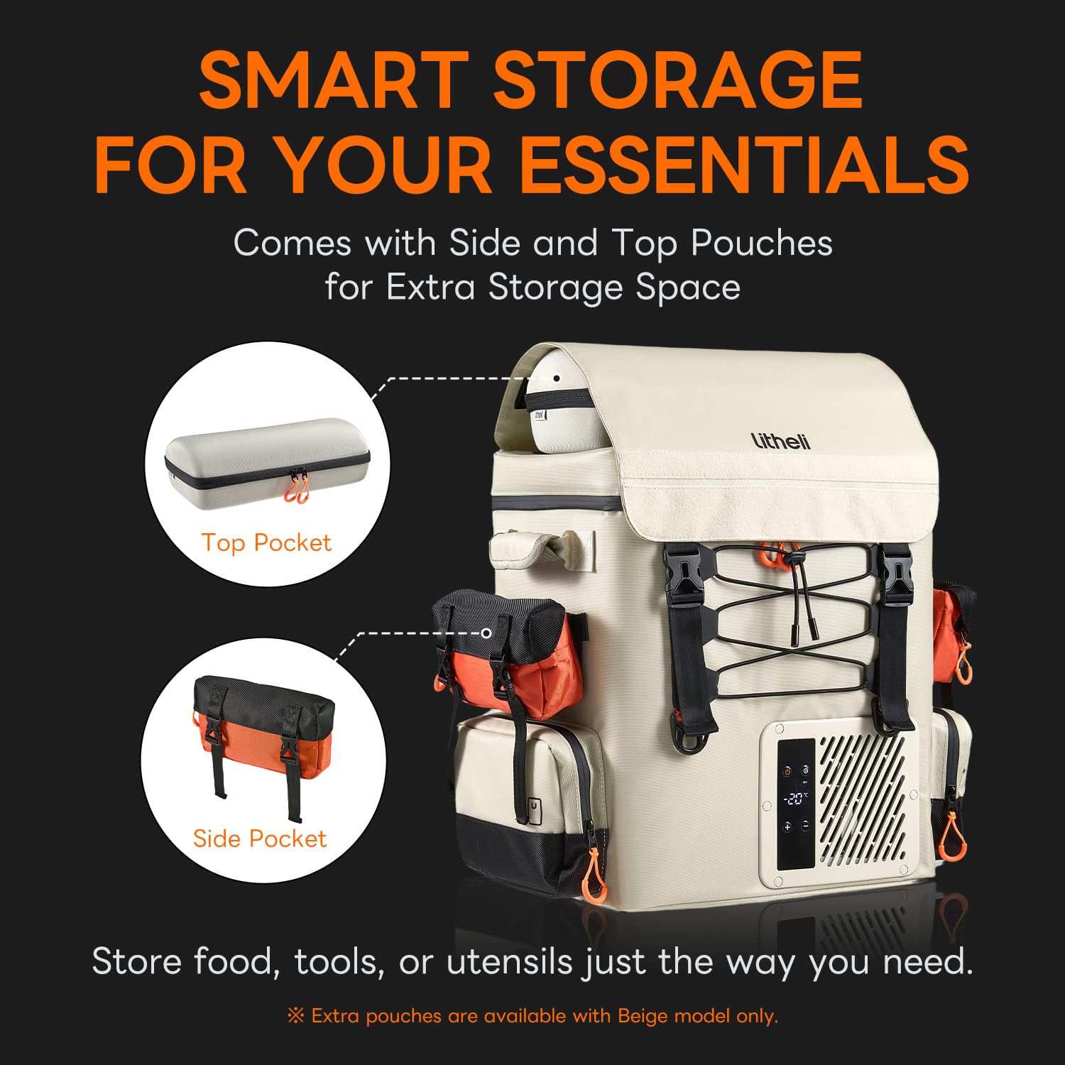 [What You’ll Get] Professional technical support included. If you have any questions, please contact customer service for assistance. Your package includes: 1 Litheli FrozenPack portable fridge,1 U20 battery,1 backpack shoulder strap, 1 waist belt, 1 backpack suspension system, 1 vehicle charging cable, 1 detachable top box, 2 detachable side pockets, and 1 user manual.Top box and side pockets are limited to beige color.