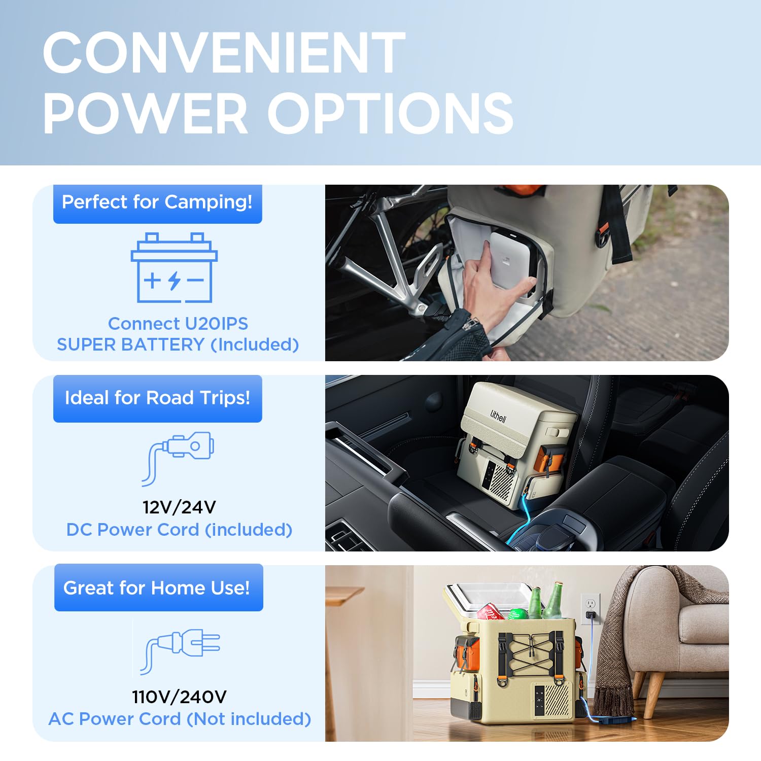[3 Power Options for Anywhere Use] The portable cooler works with a rechargeable battery (included), 12V/24V car power, or 100V-240V home outlets. Swap batteries for endless runtime during long trips, or plug into your car or wall at home. Ideal for camping, van life, or daily use—never worry about staying powered up.And the 20000mAh U20 battery doubles as a portable power bank – use its Type-C/USB-A ports to charge phones, laptops, or other devices