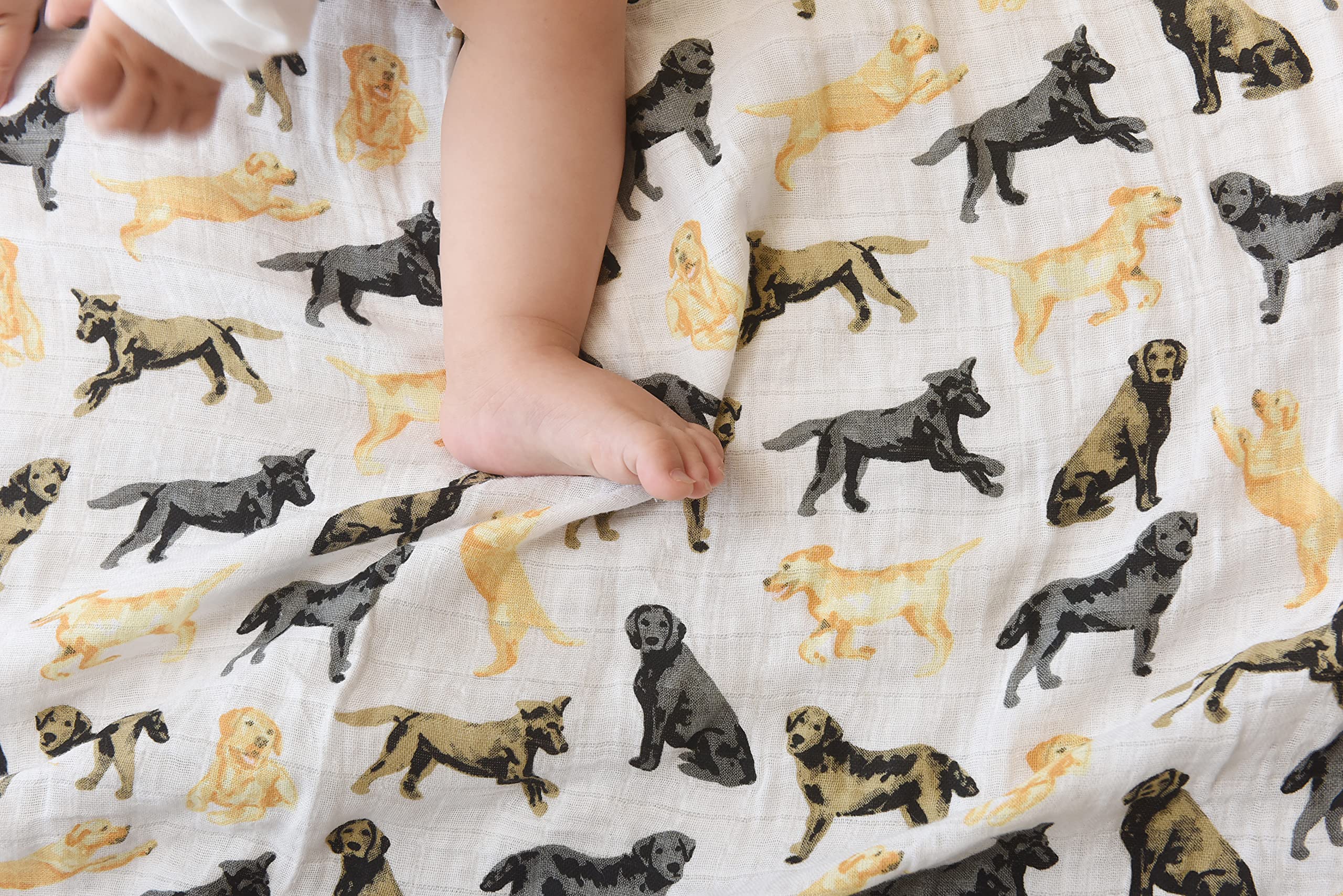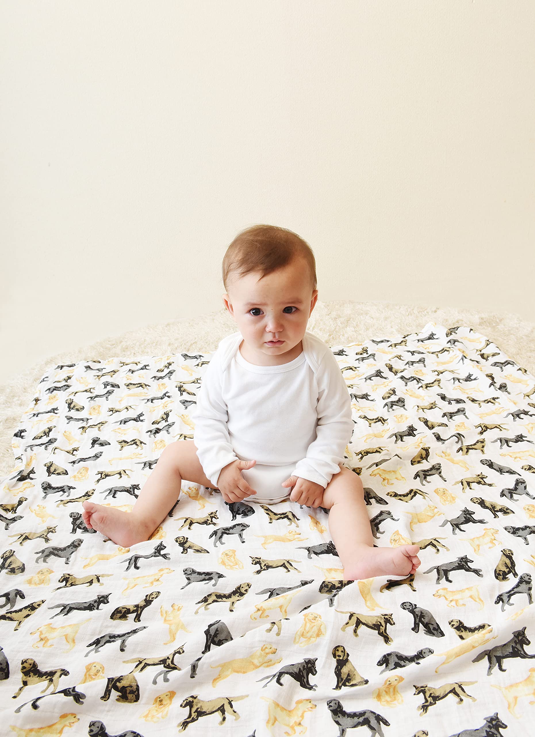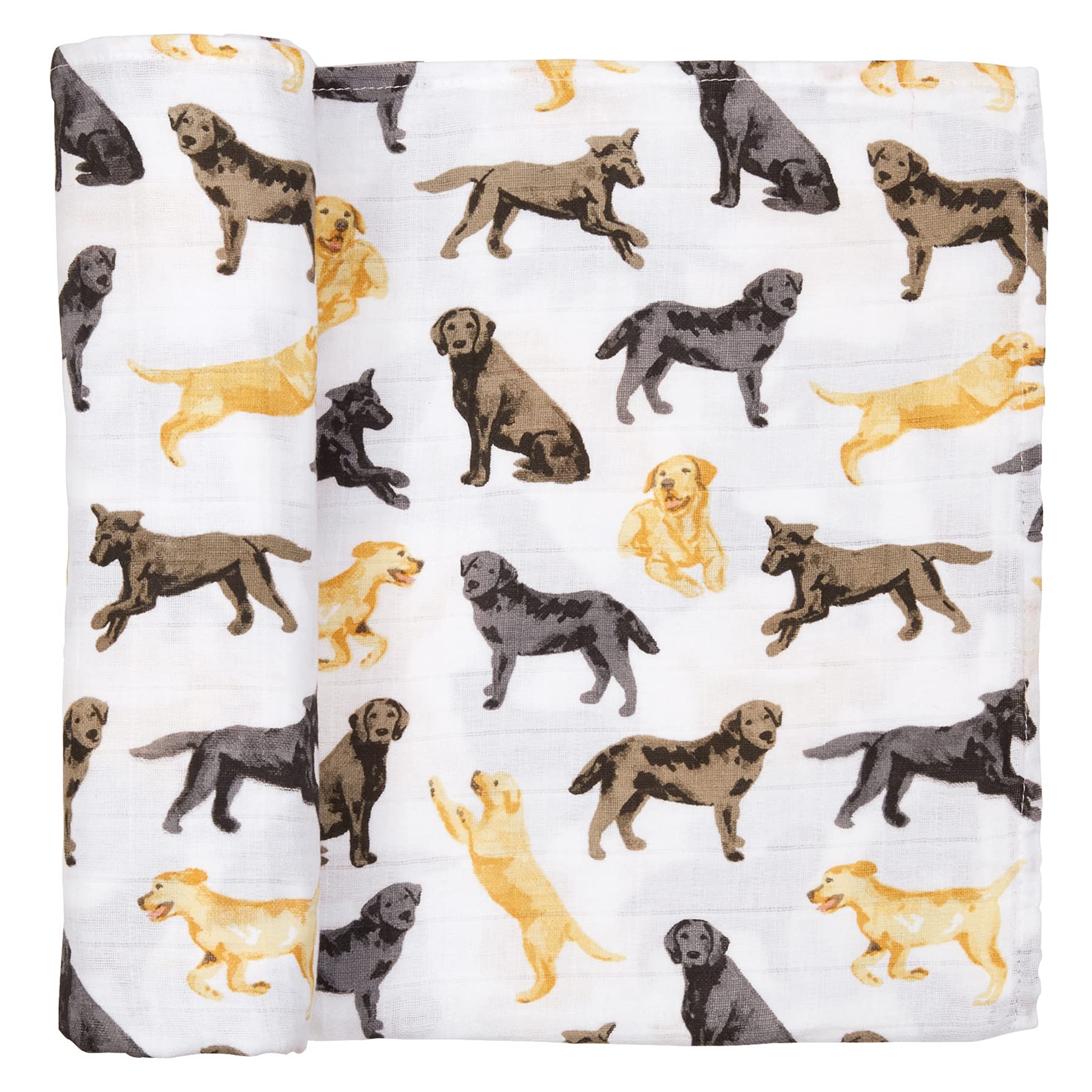 For the dog lover! Features Labrador Retriever print. Generously sized square muslin swaddle blanket features original Mud Pie print and arrives folded with printed twill tape ribbon. Blanket softens with every wash.