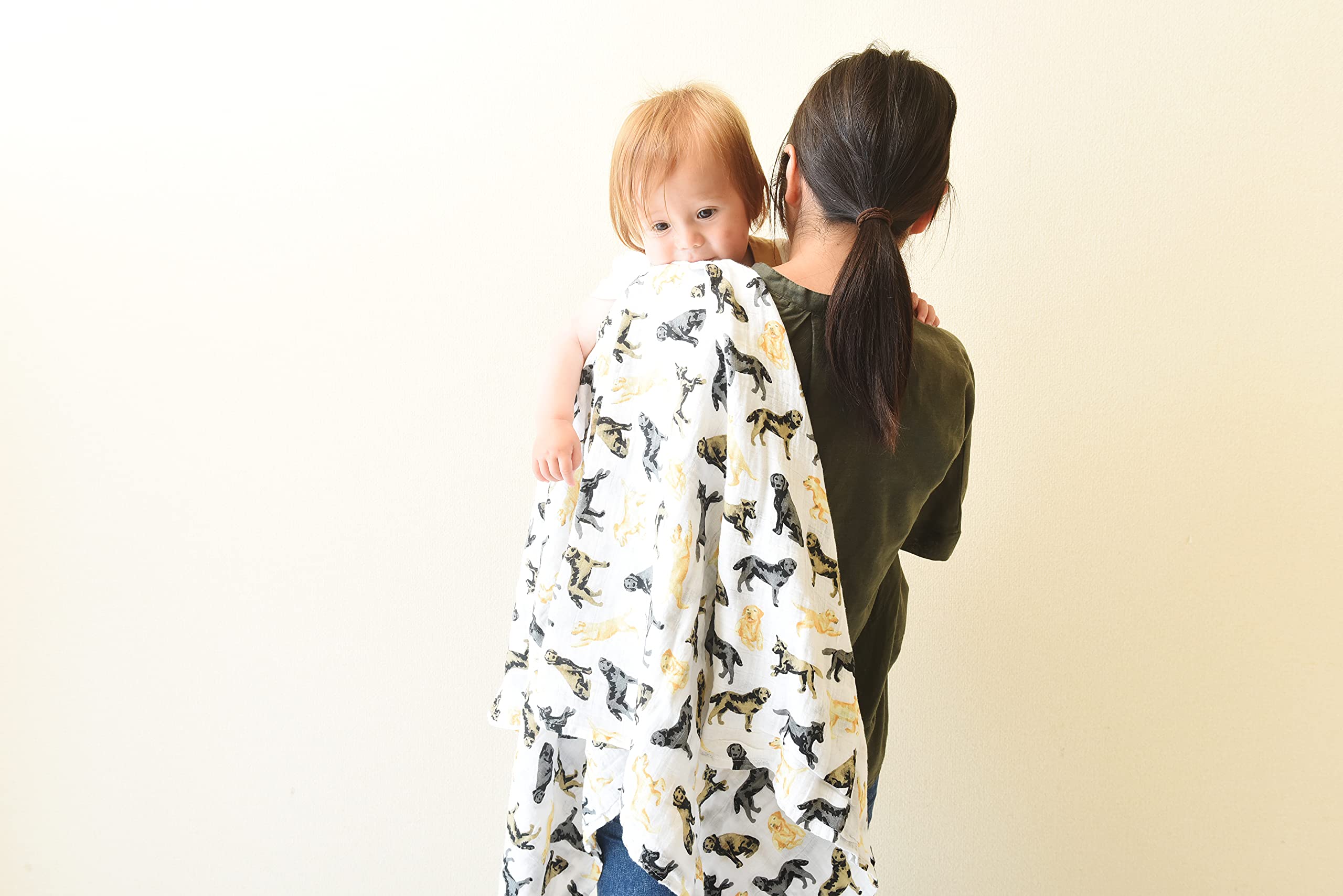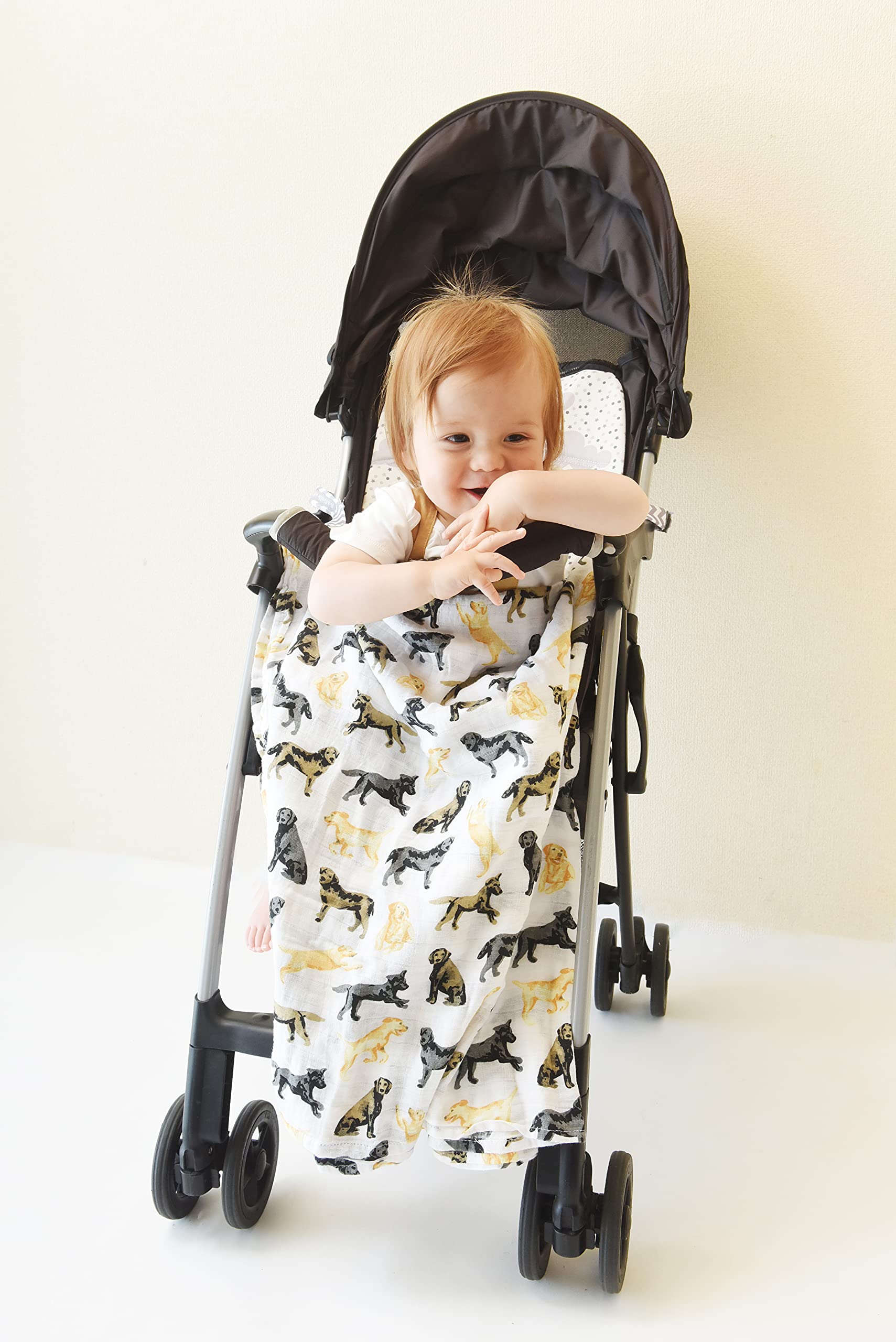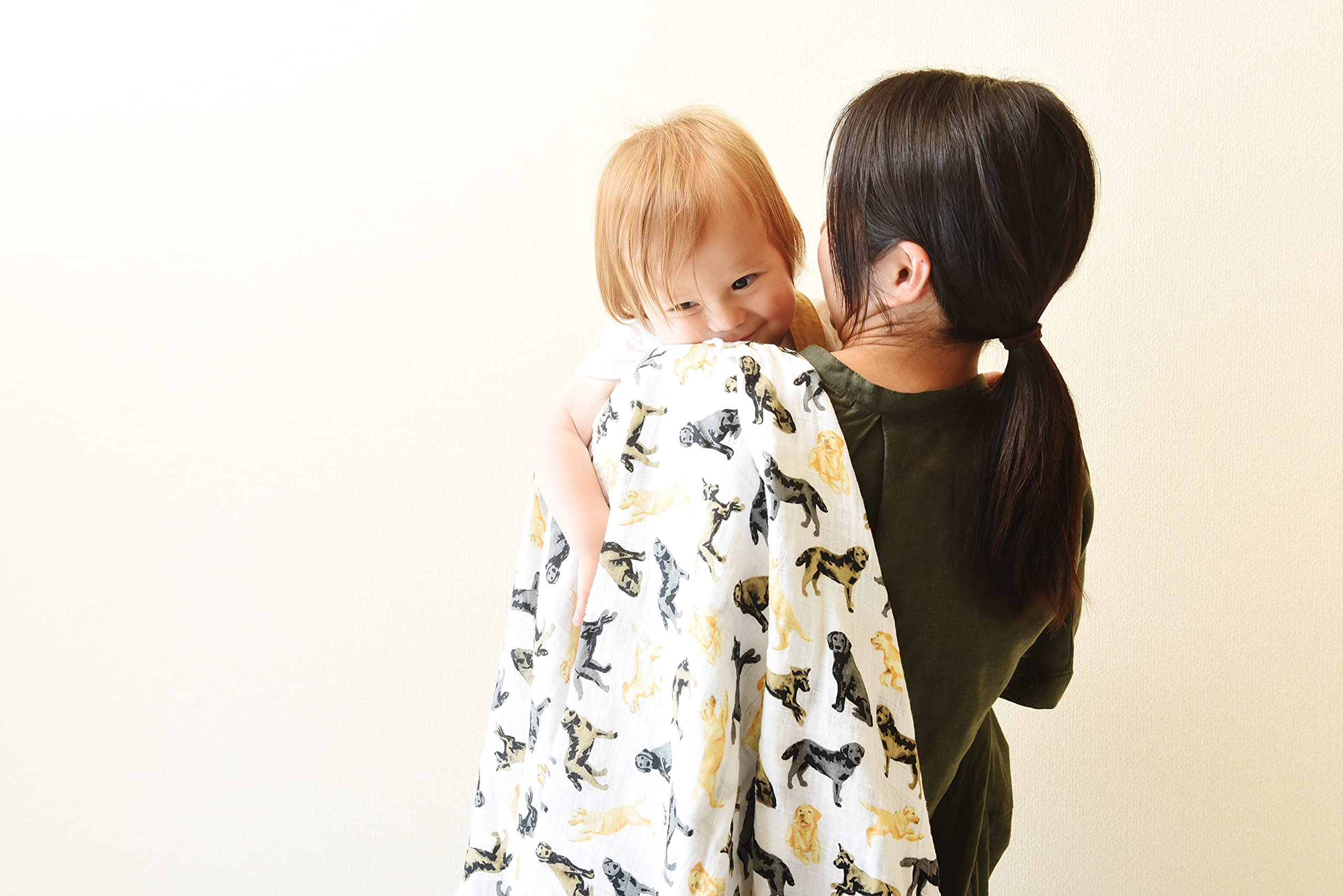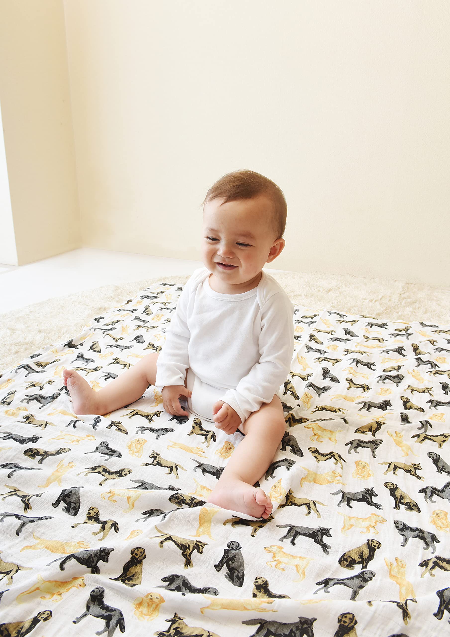 For the dog lover! Features Labrador Retriever print. Generously sized square muslin swaddle blanket features original Mud Pie print and arrives folded with printed twill tape ribbon. Blanket softens with every wash.
