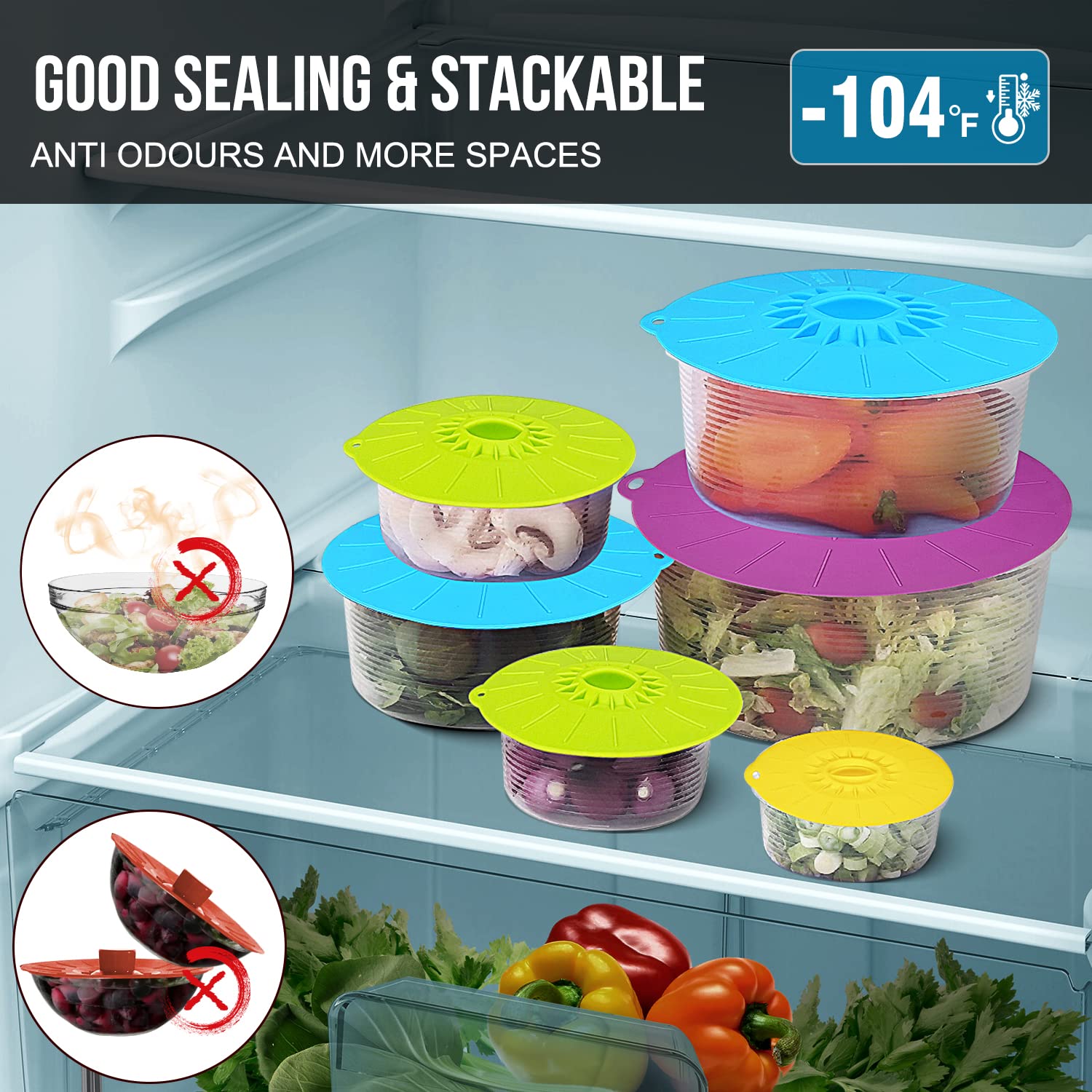 MULTIPURPOSE VERSATILITY - silicone lids totally 5 sizes- 4 in, 6 in, 8 in, 10 in and extra large 11.7 inch. The sizes in between vary and they will fit almost anything, Such as Pot, Pan, Dish, Plate, Bowls, Container, Coffee Cup Jar, Can and more. Great for Cooking and Baking. Also Perfectly and Safely use for Microwave, StoveTop, Oven, Fridge and Freezer Safe. Withstands temperatures from -104 degrees F to 450 degrees F.