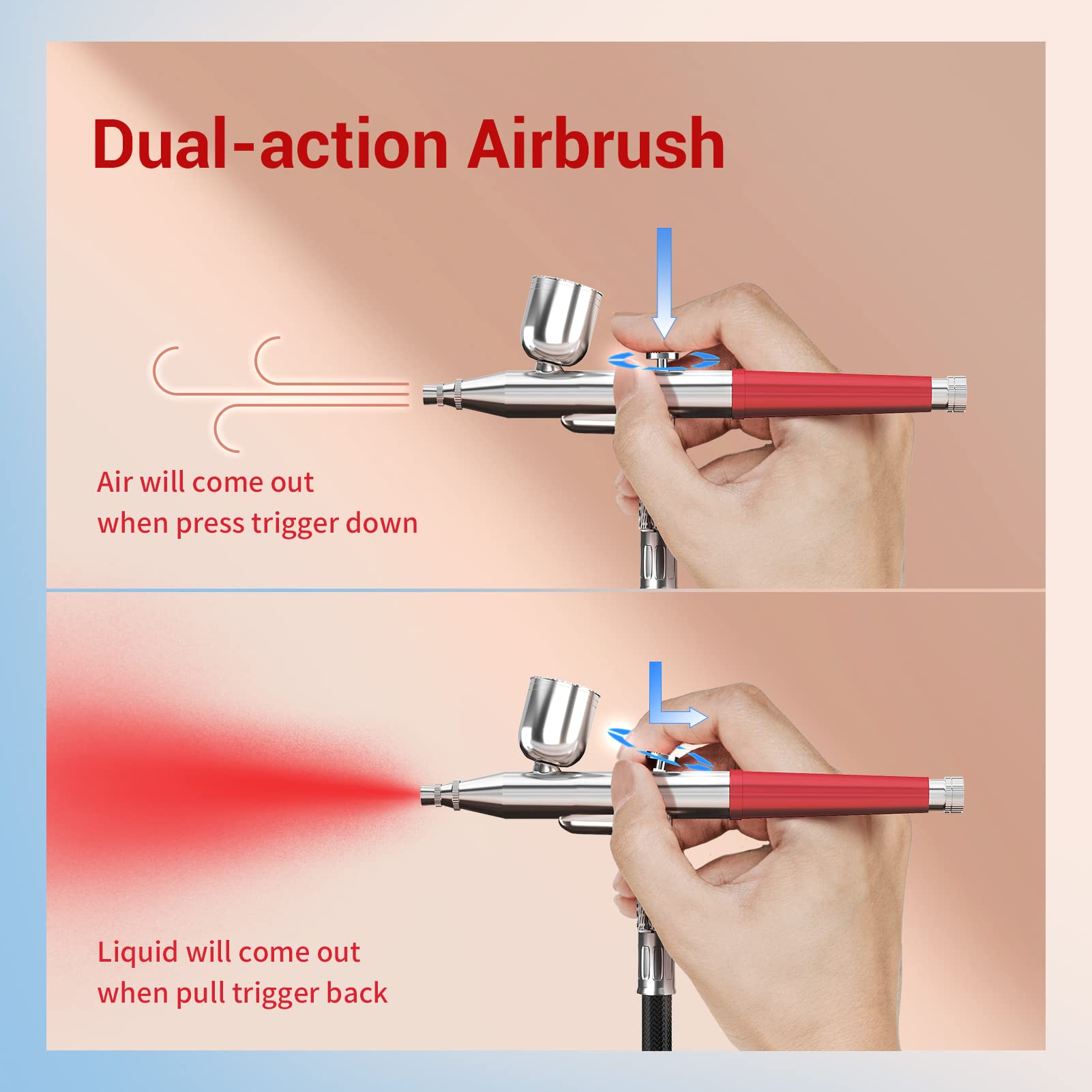 【Dual-Action Function】 Our portable airbrush comes with a double action trigger. We build an air valve in our airbrush. You can control paint and airflow separately with the trigger. When press the trigger down, compressor will turn on automatically and airflow will come out, then paint will come out when pull the trigger back. It will stop working automatically after releasing the trigger. This will make you can have a 30% longer working time compared with common rechargeable airbrushes kit