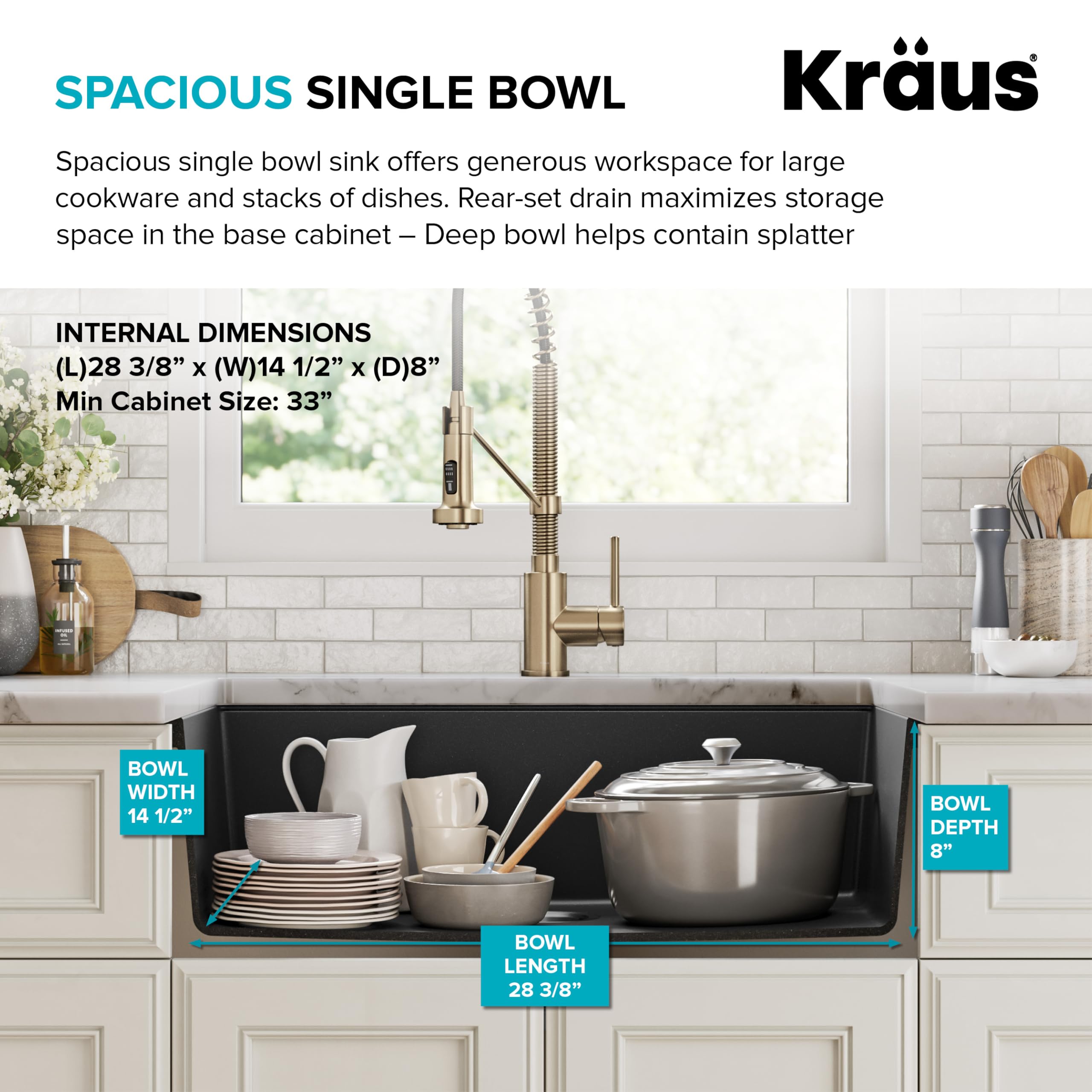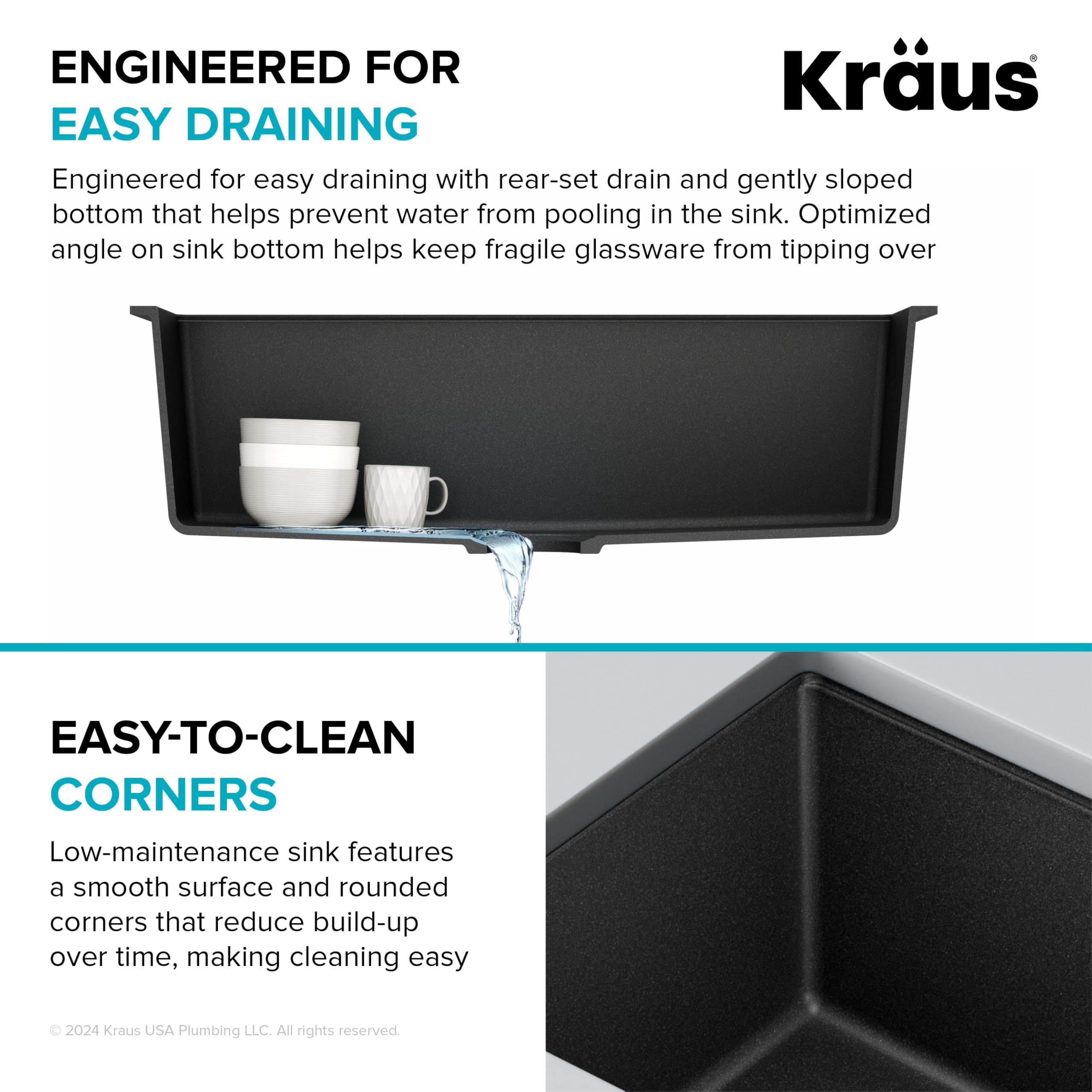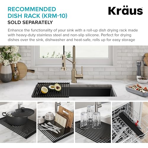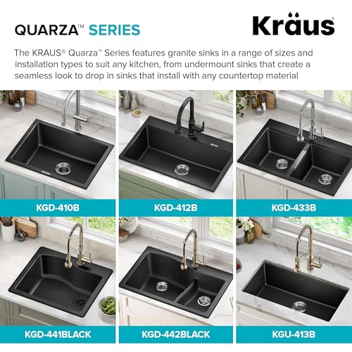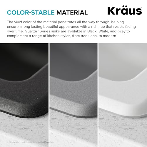 Product Description Beautiful and versatile, Quarza granite kitchen sinks are made from quartz composite material that offers the high-end look of natural granite. With gently rounded corners and smooth easy-to-clean surface, these sinks add elegant style to any kitchen. Undermount sink installation creates a clean transition from sink to countertop and simplifies cleanup by letting you wipe water and crumbs right into the sink. Durable sink for kitchen stands up to impact, scratches, and shock, and is colored all the way through to resist fading. Deep sink with gently sloped bottom promotes easy draining and has ample space for large cookware. Installation-ready kitchen sink comes with drain assembly, towel, hardware and template. Available in drop in sink design that installs with any countertop material From the Manufacturer Crafted from 80% natural granite, Kraus granite sinks feature the look, feel, and texture of natural stone. A thermal finishing process results in a tough, nonporous surface that is resistant to heat, chemicals, scratching, chipping, and discoloration that will stand up to a lifetime of use. With a variety of size, bowl configuration and installation options, a Kraus granite sink can make a sleek and functional addition to any kitchen.