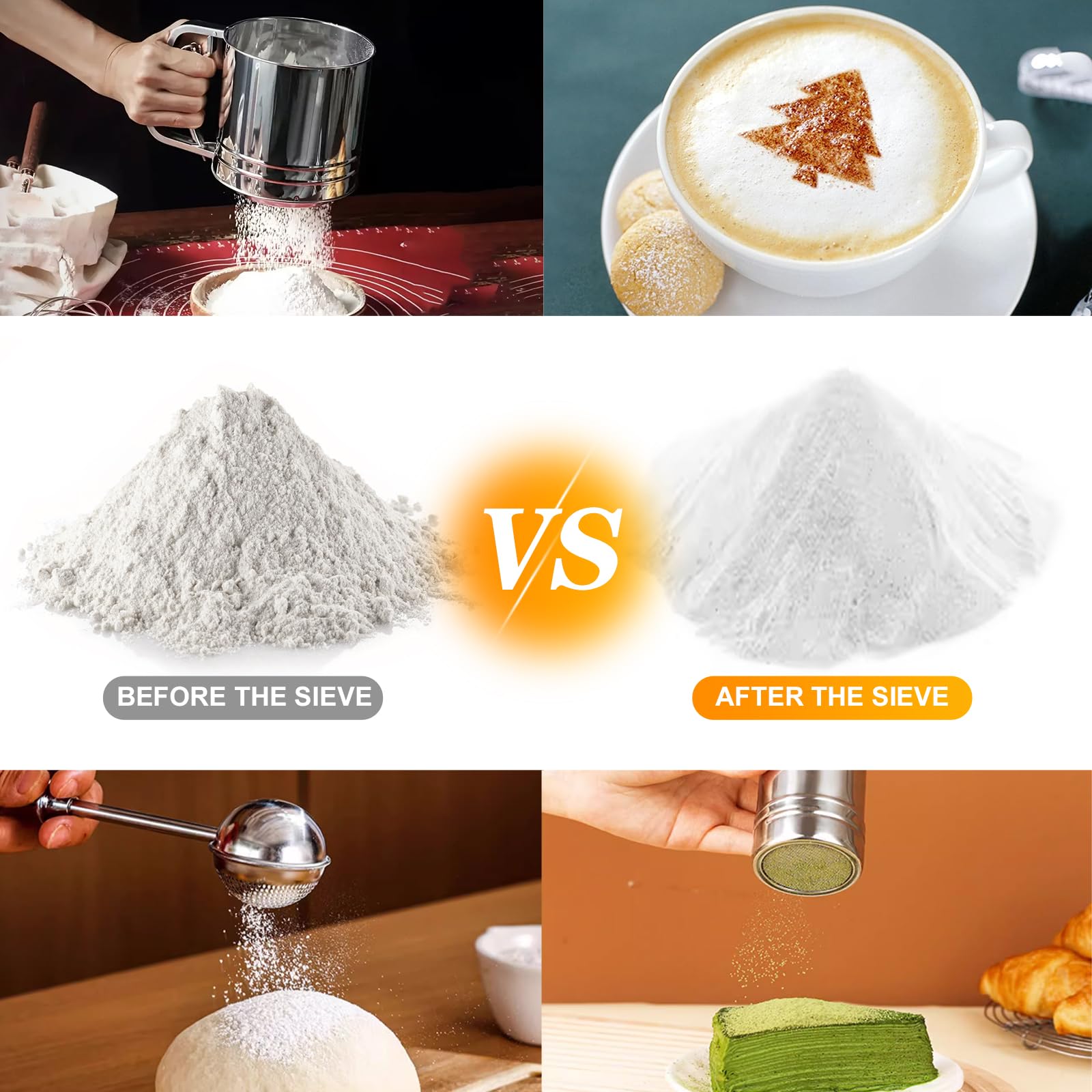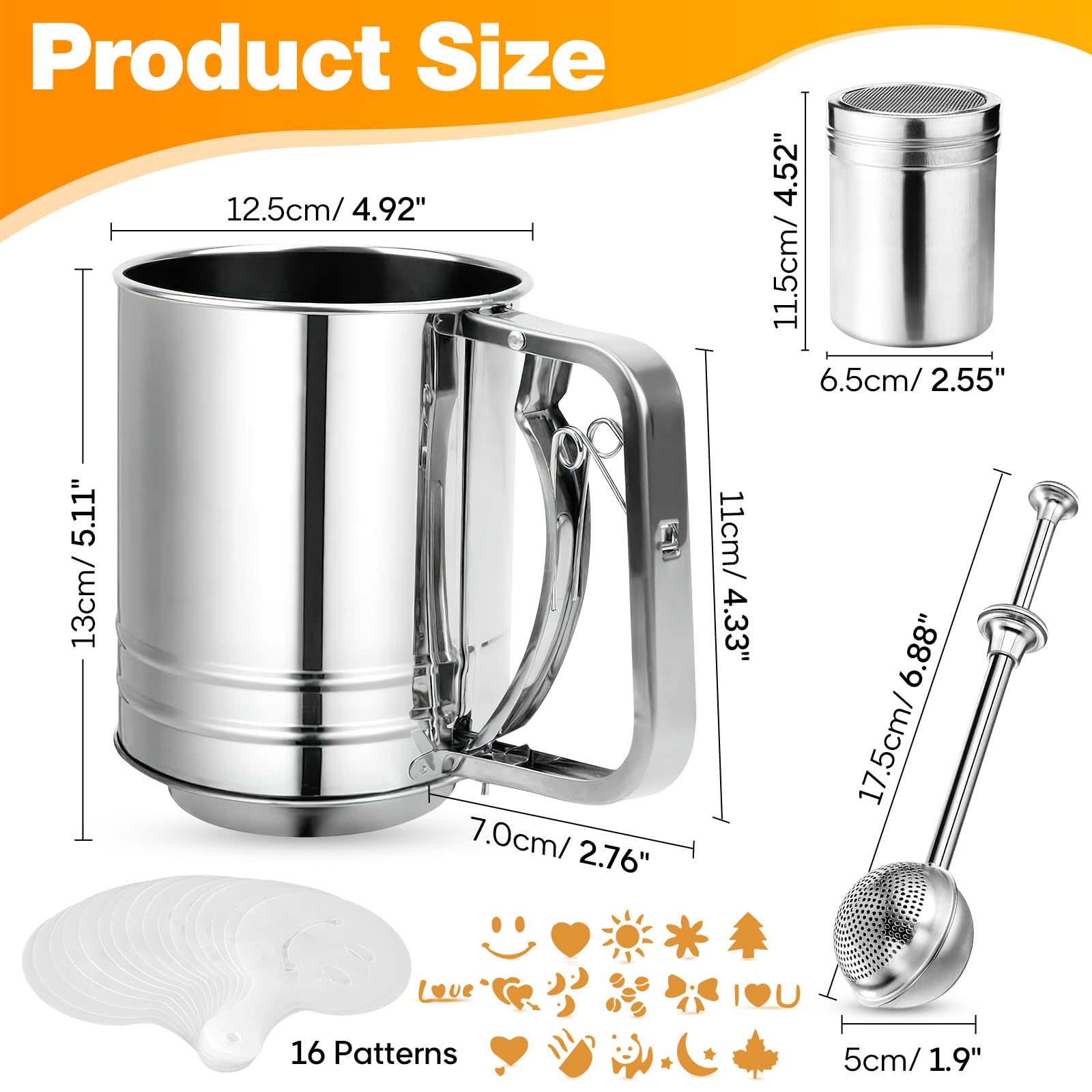 Versatile Dry Ingredient Sifter: This sifter is not just for flour; it’s perfect for sifting sugar, spices, salt, pepper, cornstarch, and more. Whether you’re dusting cocoa powder and powdered sugar on desserts or flour on bread, this flour sifter makes the task effortless. Includes 16 Kitchen Stencils: Featuring patterns like LOVE, flowers, hearts, and Christmas trees, these stencils make cake decorating easy and stunning—perfect for adding beautiful designs to your desserts.