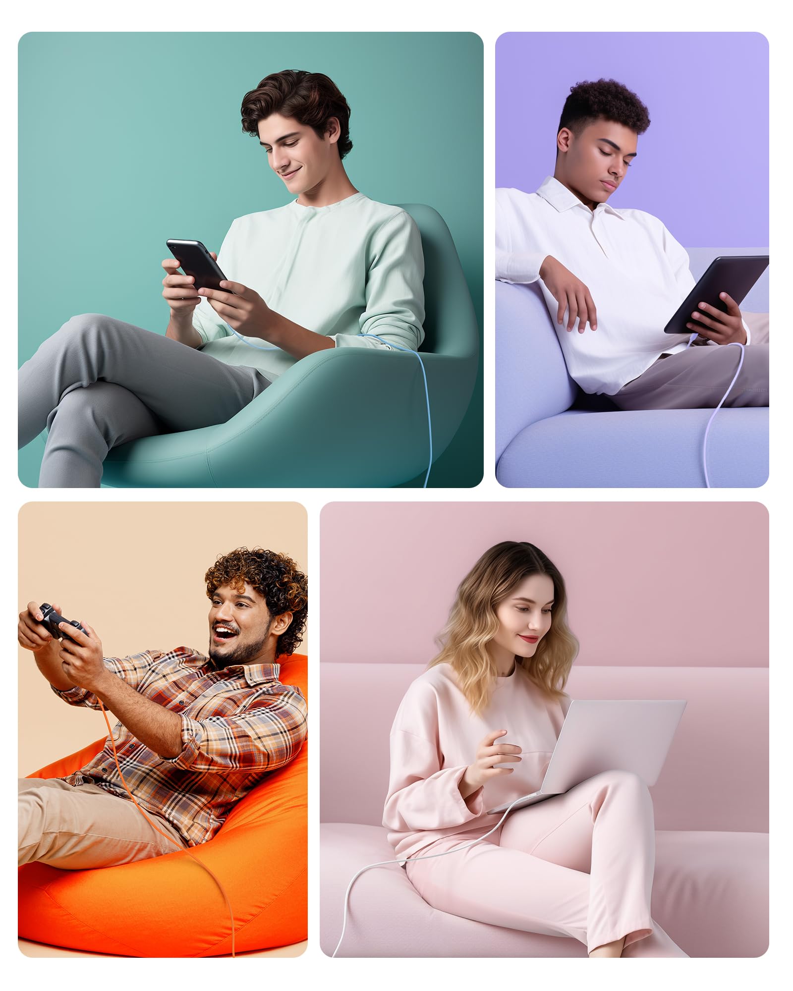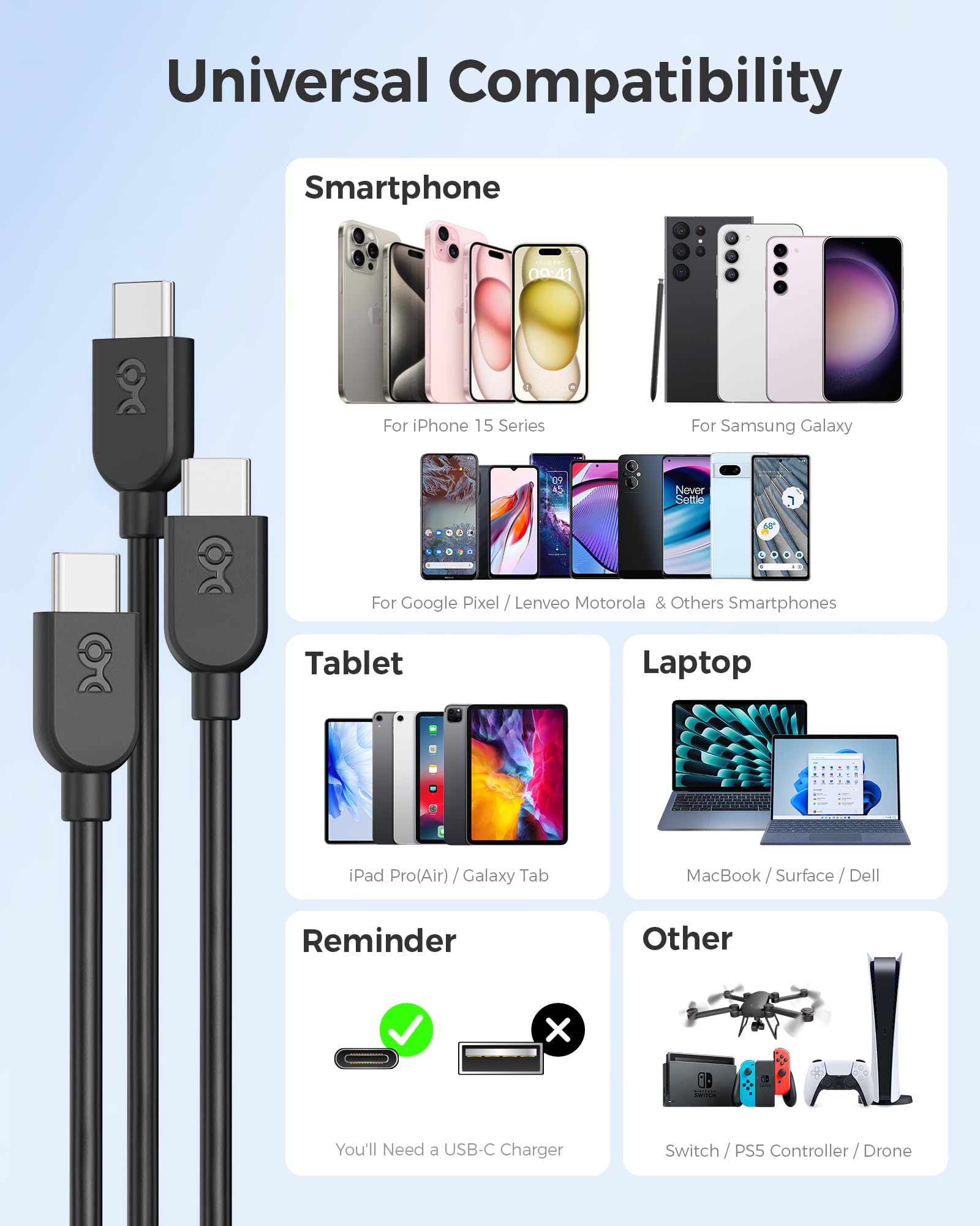 Multiple Choices: This USB-C cable offers black, white and multi-color packs; Find the perfect color match for your devices with this USB-C to USB-C cable pack, or make finding the right charger in a cable bundle simpler with different colored cables; The size options offered by the USB C cord are perfect for charging a variety of devices