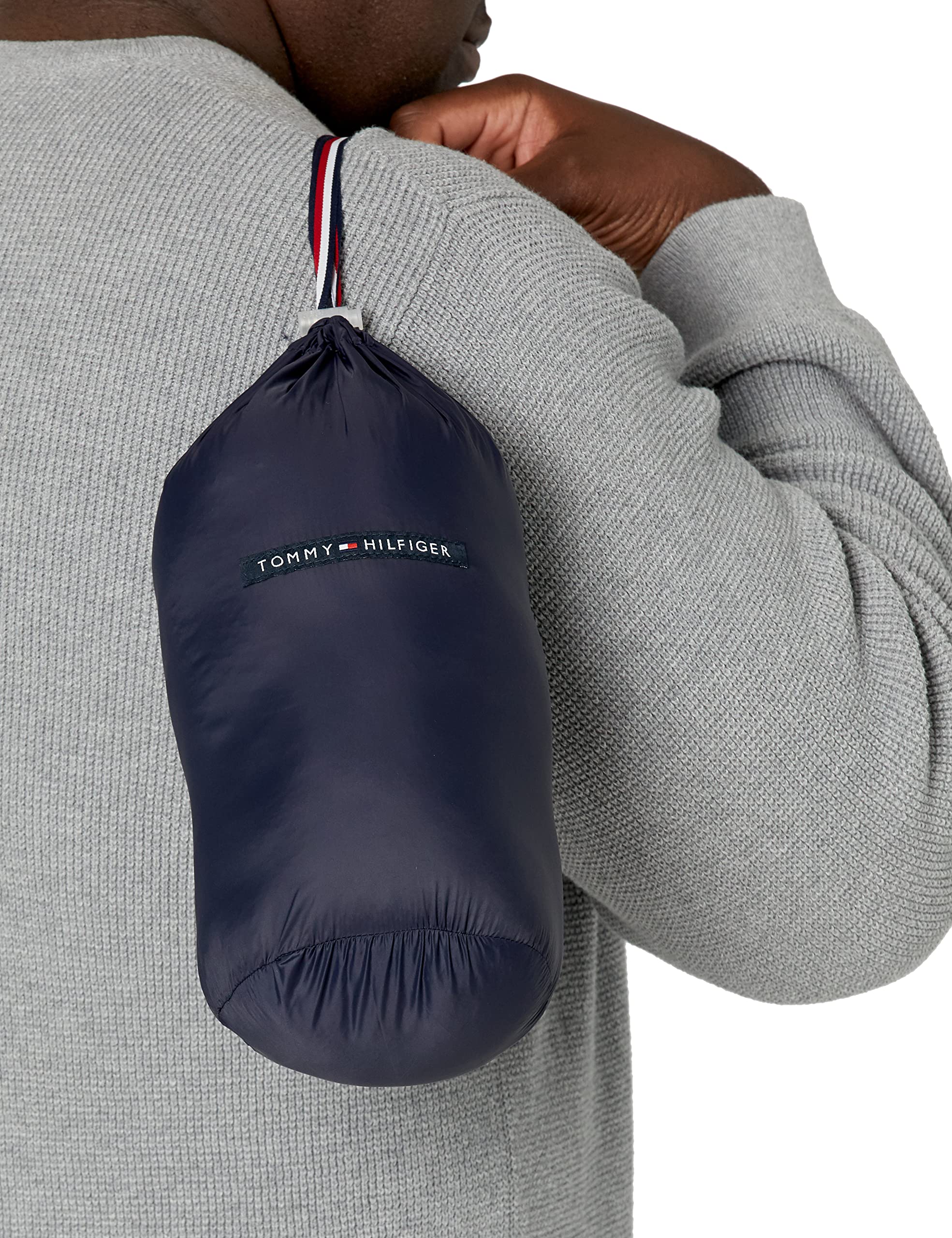 Description Logo packable in nylon with nylon lining, ultra loft fill, center front zipper closure, stand collar, Hilfiger on back of collar, drawstring at hem, elastic cuffs, and how to pack screen-print on interior lining, and two lower welt pockets.