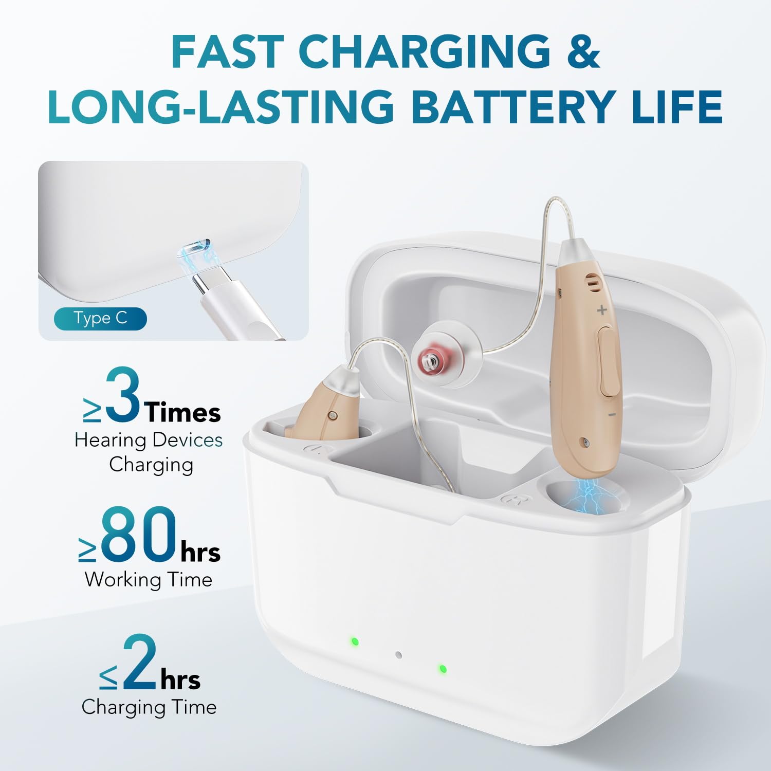 Powerful Battery Performance. This rechargeable hearing aid utilize intelligent charging algorithms that can be fully recharged in just 2 hours and one charge can be recycled at least 4 times, a total of 80 hours of smooth listening. Portable charging case make sure you can recharge no matter where you are - whether at work, during travels, or on the go.