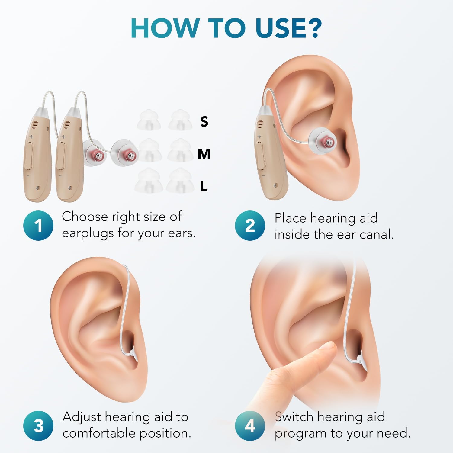 Comfortable and Perfect Fit. The hearing amplifiers can fit your ear canal very well. Ergonomic design maximizes wearing fit and stability, which is not easy to fall off, and is comfortable to wear. Keep the sound in your ears forever. Come with six pairs of earplugs in different sizes to ensure your ear comfort.
