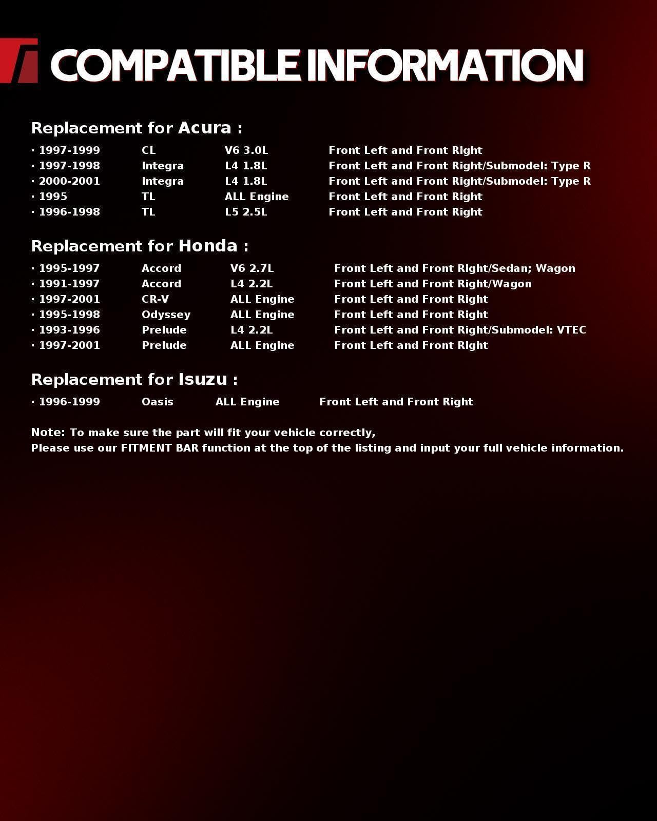 【Product Adaptation】:Torchbeam Front Calipers for Honda 1997-2001 CR-V, Honda 1997-2001 Prelude, Honda 1995-1998 Odyssey, Honda 1991-1997 Accord 2.2L, Honda 1995-1997 Accord 2.7L, Acura 1997-1999 CL 3.0L, Acura 1996-1998 TL 2.5L, Honda 1993-1996 Prelude 2.2L, Acura 1997-1998 2000-2001 Integra 1.8L, Isuzu 1996-1999 Oasis, Acura 1995 TL