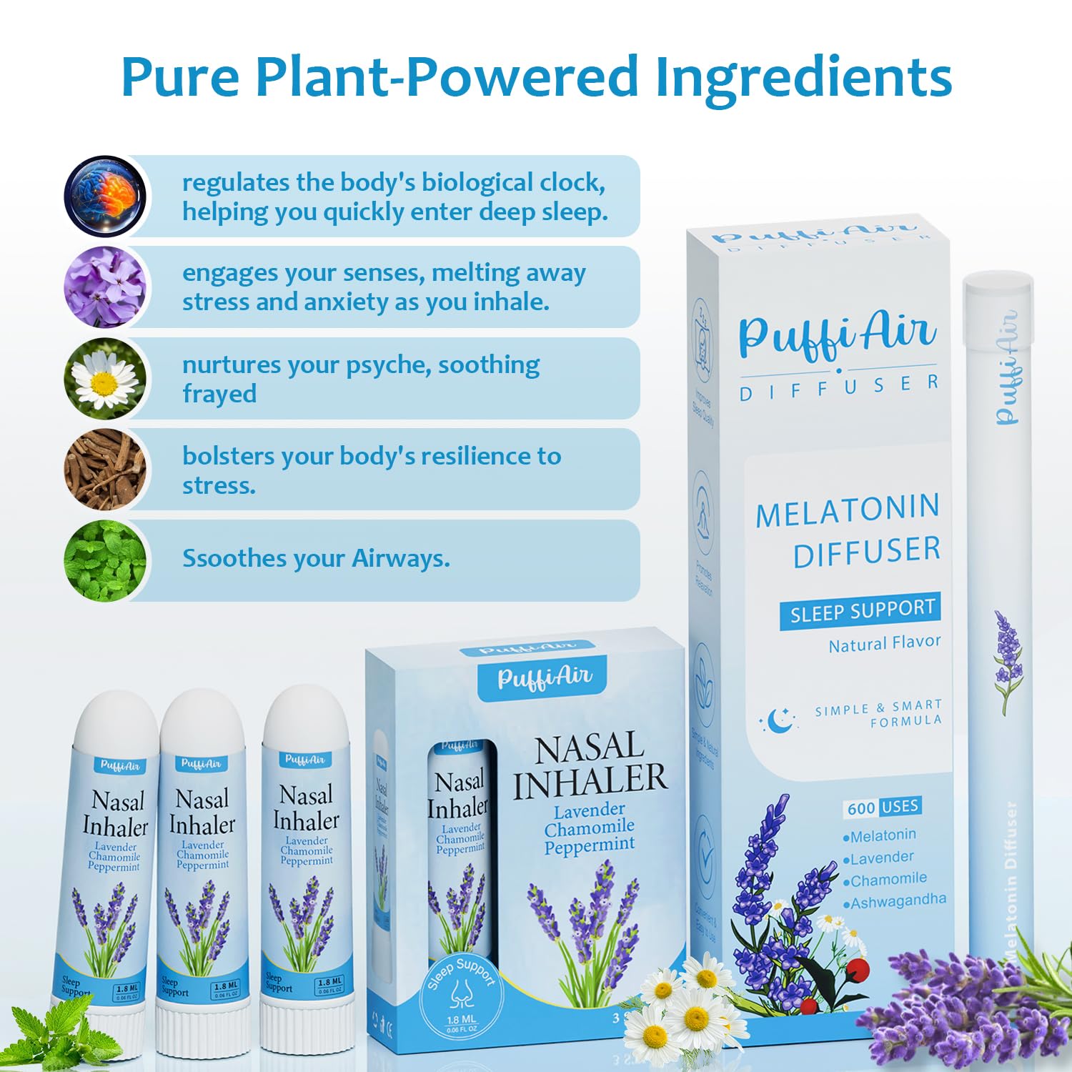 Powerful Natural Ingredient Blend – Both products feature lavender and chamomile for calm; the diffuser adds melatonin (sleep cycle regulation) and ashwagandha (stress resilience), while the nasal sticks use 100% pure extracts with no additives/fillers—safe for daily use