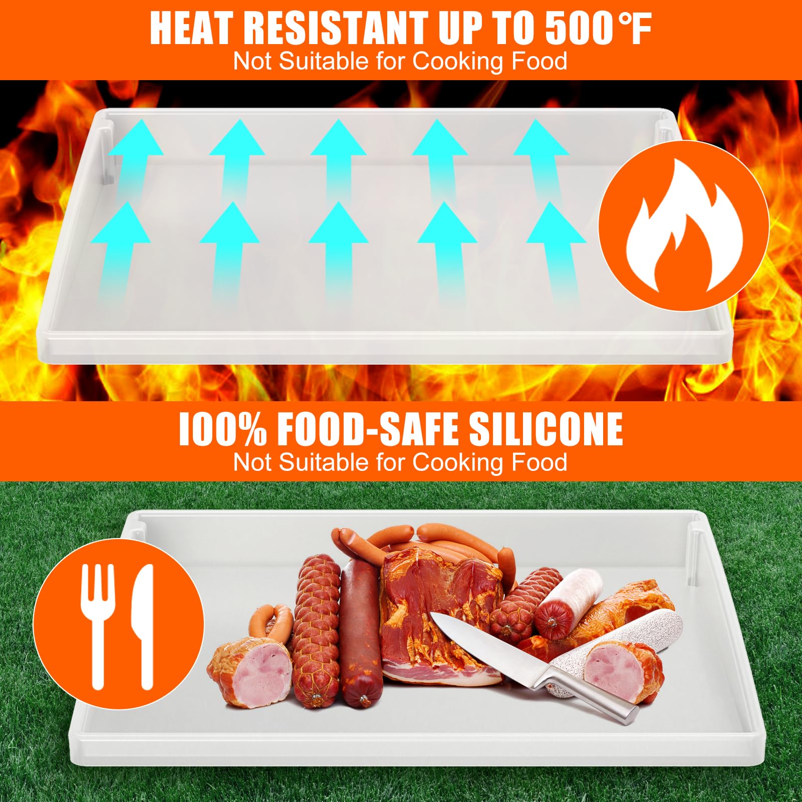 【FOOD GRADE SILICONE】: The griddle mat for blackstone grill is made of 100% high-quality food-grade silicone, thick, durable, soft, safe and reliable, you can use it with confidence, it will not heat or transfer heat, and can withstand up to 500℉.