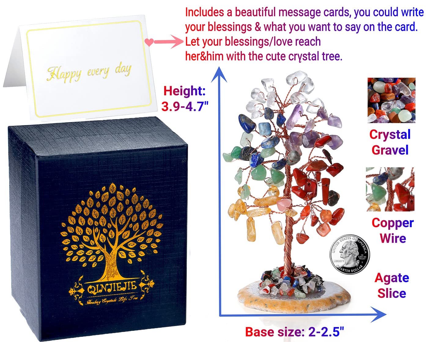 [ Basic Information ] Specification attributes : 1 Piece Cute Small Crystal Tree. Size (approxi.) :Base size of the tree :2-2.5", height of the tree :3.9-4.7". Material: This's a crystal mini tree made of natural crystal gravel with natural agate slices and copper wire.