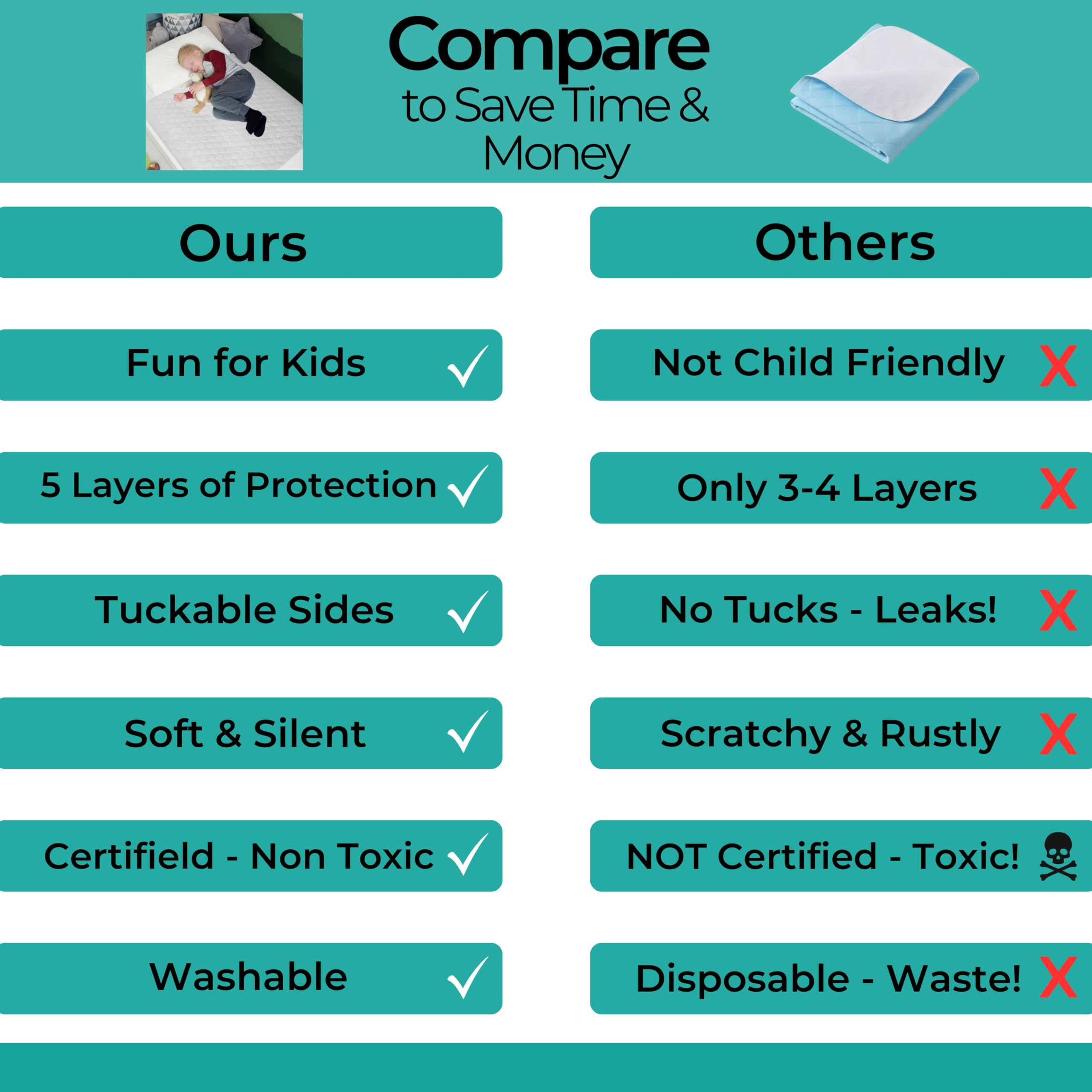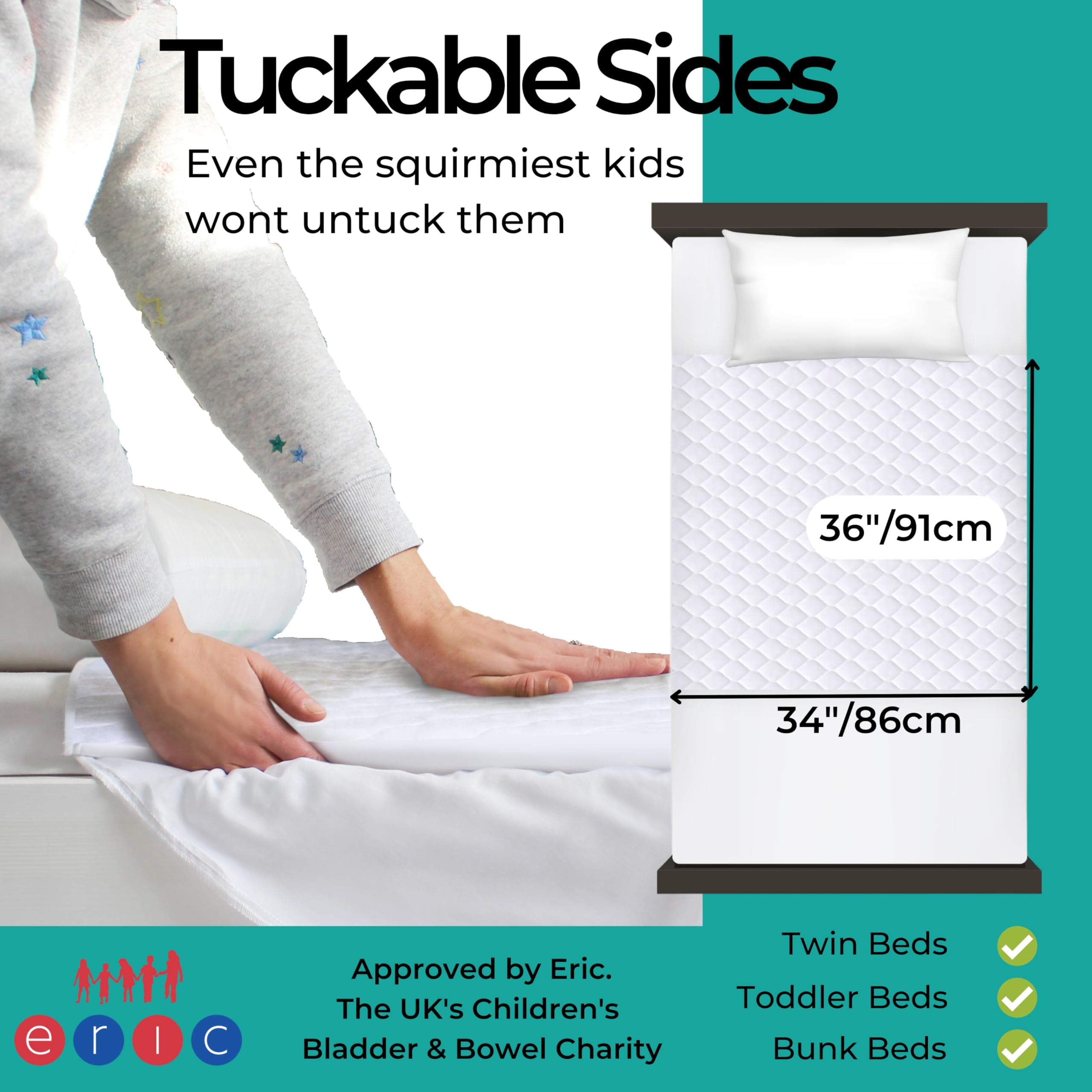 DOESN'T MOVE IN THE NIGHT - Many bed mats for bedwetting leak as they don't have tucks which hold the potty training mat in place. And let’s face it - kids can be wriggly at night. The tucks wrap around either side of the mattress ensuring it doesn't move.
