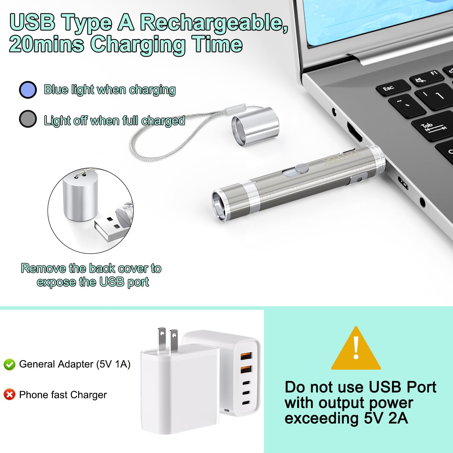 USB Direct Charging: No dry batteries needed! Unplug the back cover and plug into USB port (adapter/computer/car) to charge, about 20mins fully charged.