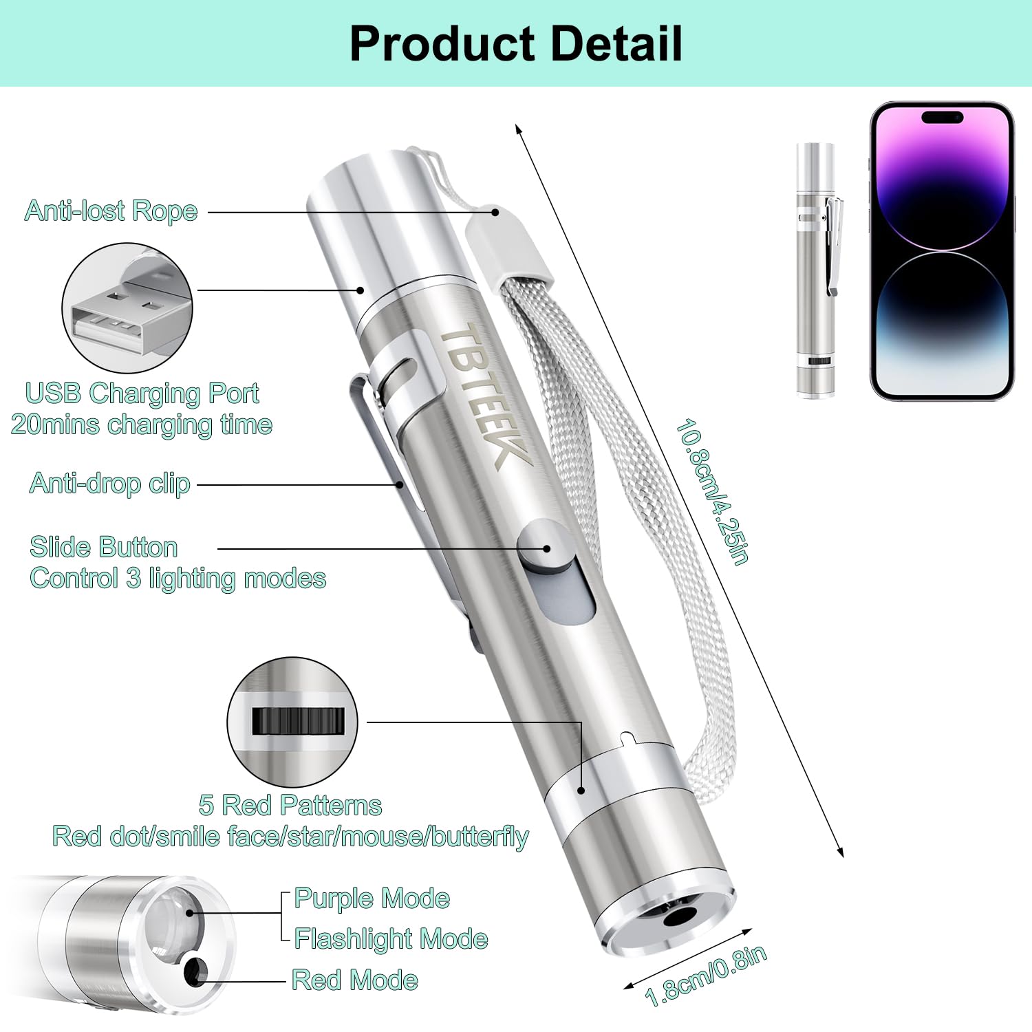 7 in 1 Modes: Scroll the gear to pick 5 red patterns(dots, smiles, mouse, stars, butterflies). The variety of patterns sparks pet's interest, enhancing your and cats' interaction. 3 lighting modes can be adjusted, red for cat playing, purple for checking cat skin health /money, white for mini flashlight