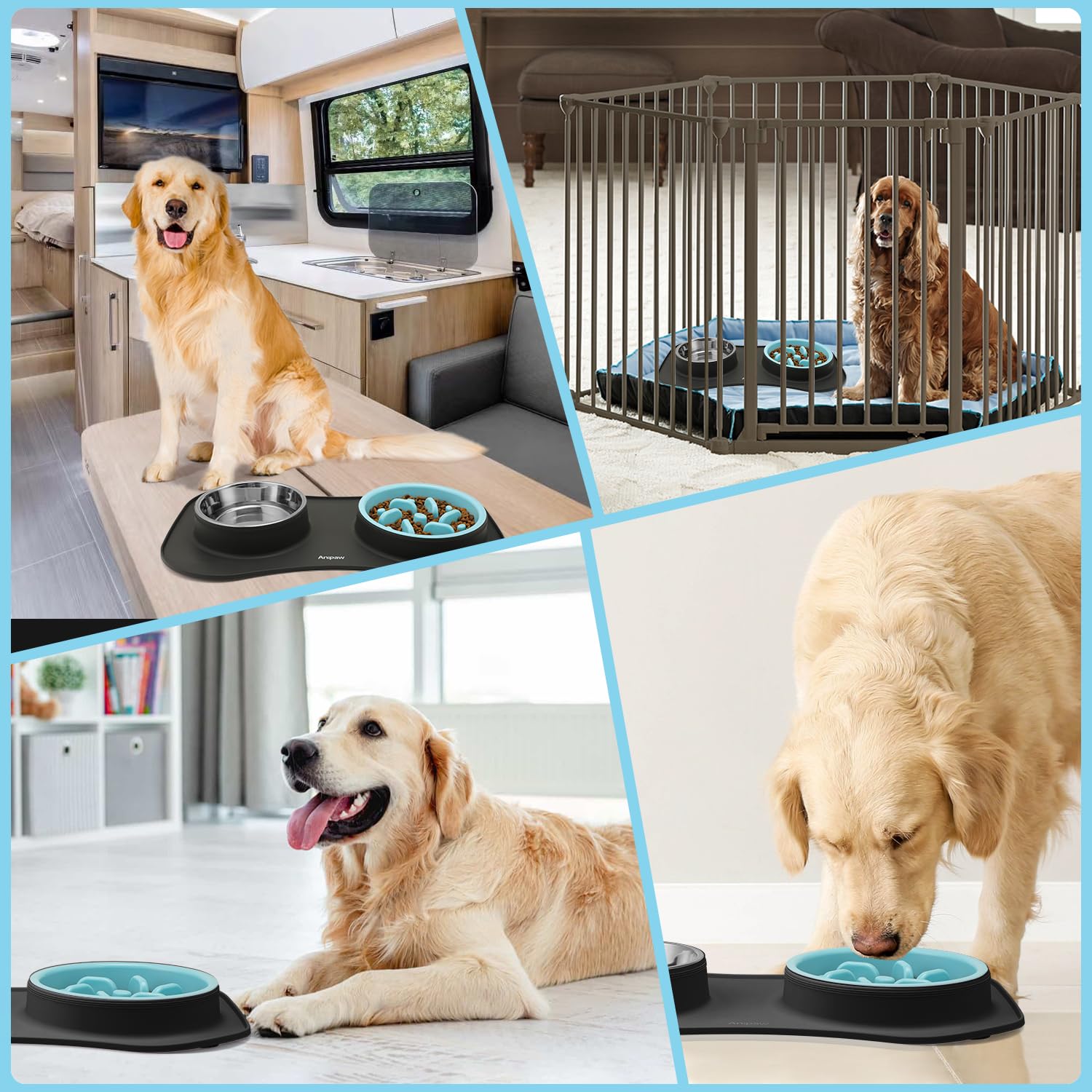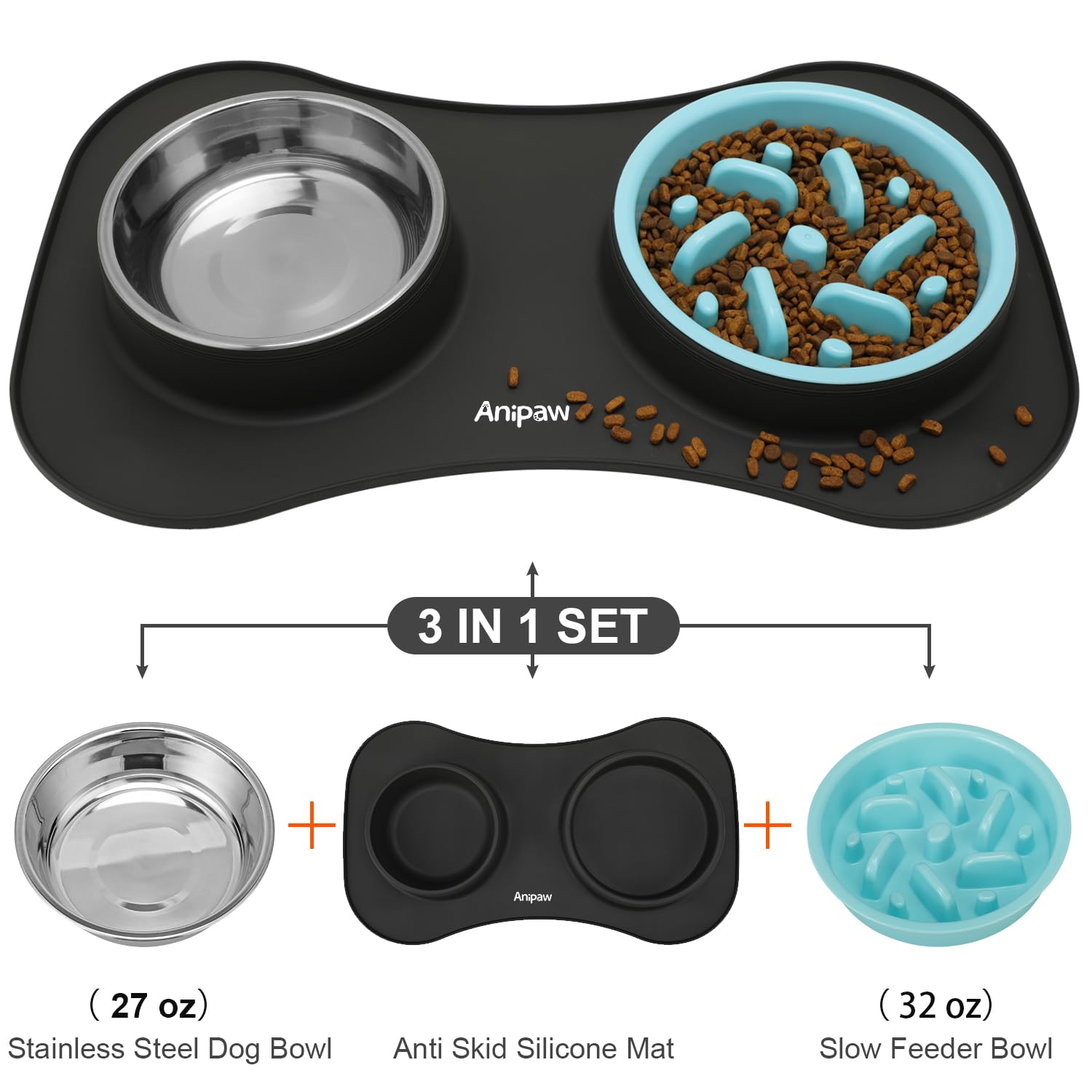 3 in 1 Set: Anipaw slow feeder bowl set includes plastic dog slow feeder*1(32oz), stainless steel dog water bowl*1(27oz), and non-skid silicone dog mat*1. Enough most of size dog’s daily feeding needs and help your dog to develop good eating habits.