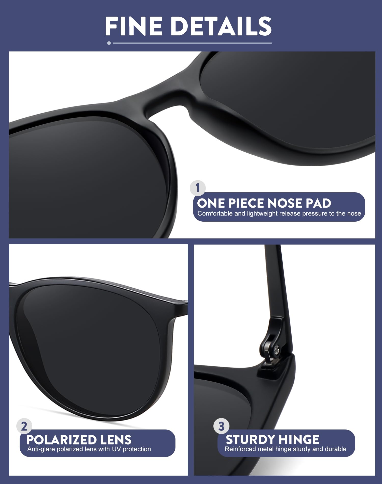 COMFORATBLE & LIGHTWEIGHT -- These vintage trendy sunglasses featured Reinforced metal hinges which is flexible, ultra light and skin-friendly; Integrated nose pad design can bring you a stress-free wearing experience, all the details make it sturdy to use.