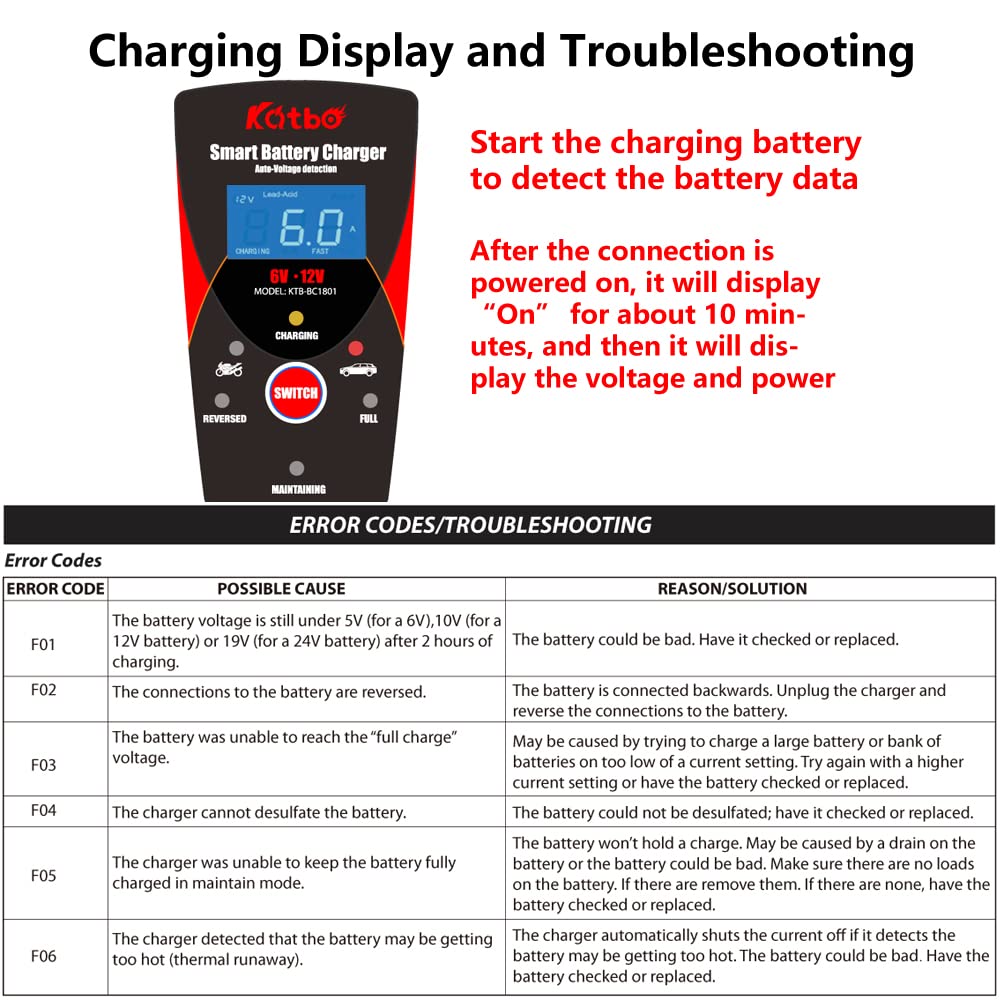 √ Get rid of battery anxiety and easily enjoy self driving travel: Using a backlit LCD, the battery charger automotive clearly and visibly shows an LCD screen displaying the charging status and battery status; automobiles, trucks, tractors, airplanesvans, RVs, trolling motors, etc. Thischarger is not intended to supply power tolow-voltage electrical systems.